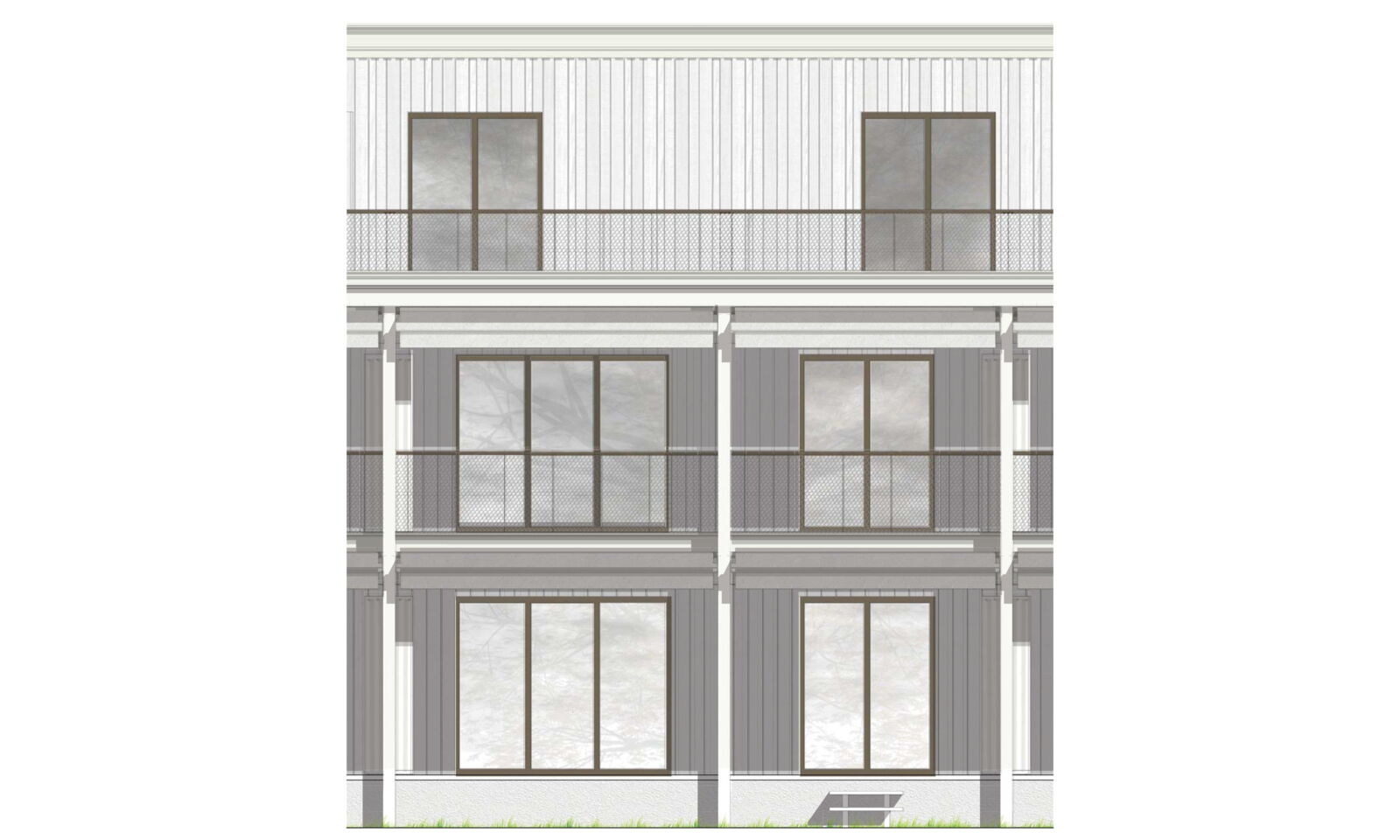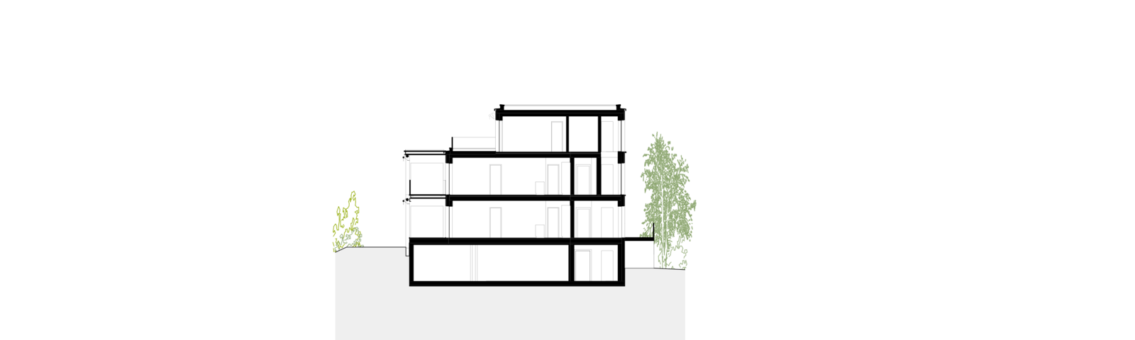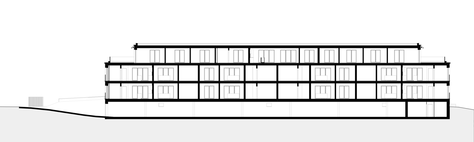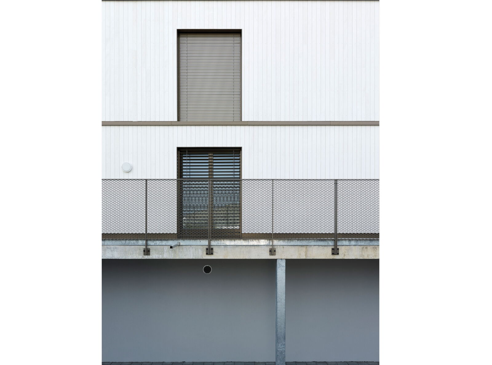 Der Gebäudekörper spricht eine klare, volumetrische Sprache. Das Volumen verfügt im obersten Geschoss über eine aufgesetzte Attika mit weitläufiger Terrasse. Diese erhält einen eigenen optischen Rhythmus, der die Höhe des Gebäudes visuell bricht. In Anlehnung an den ländlichen Bebauungskontext ist die Gestaltung eine weiss gestrichene Holzfassade. Die hinterlüftete, vorbehandelte Verschalung wird im Erdgeschoss und 1. Obergeschoss geschlossen gebildet.