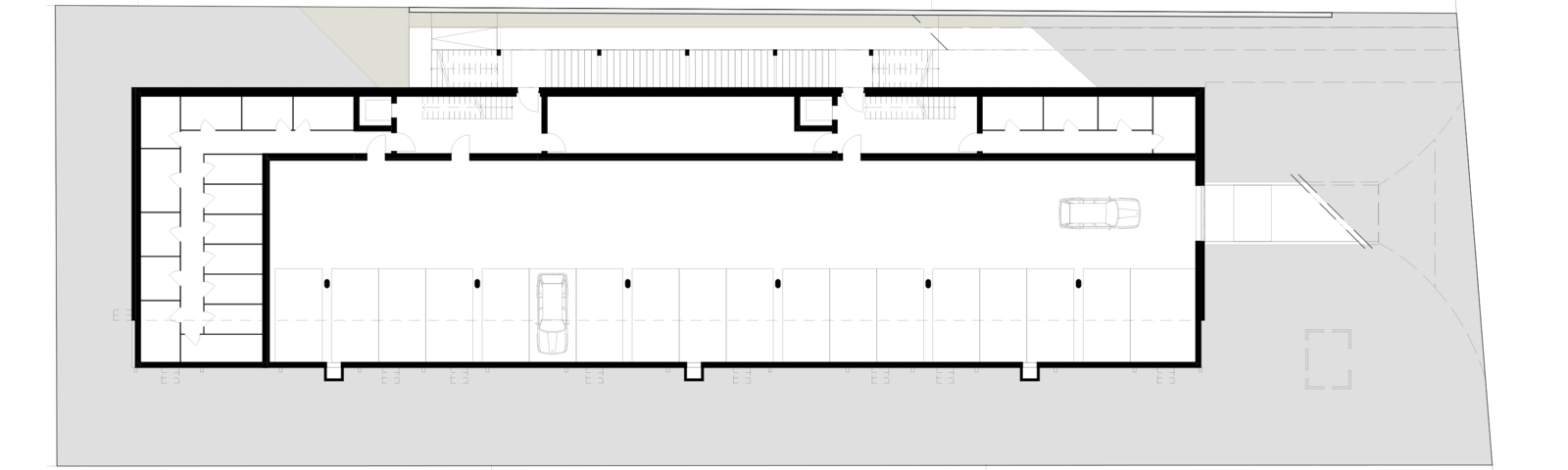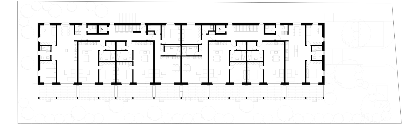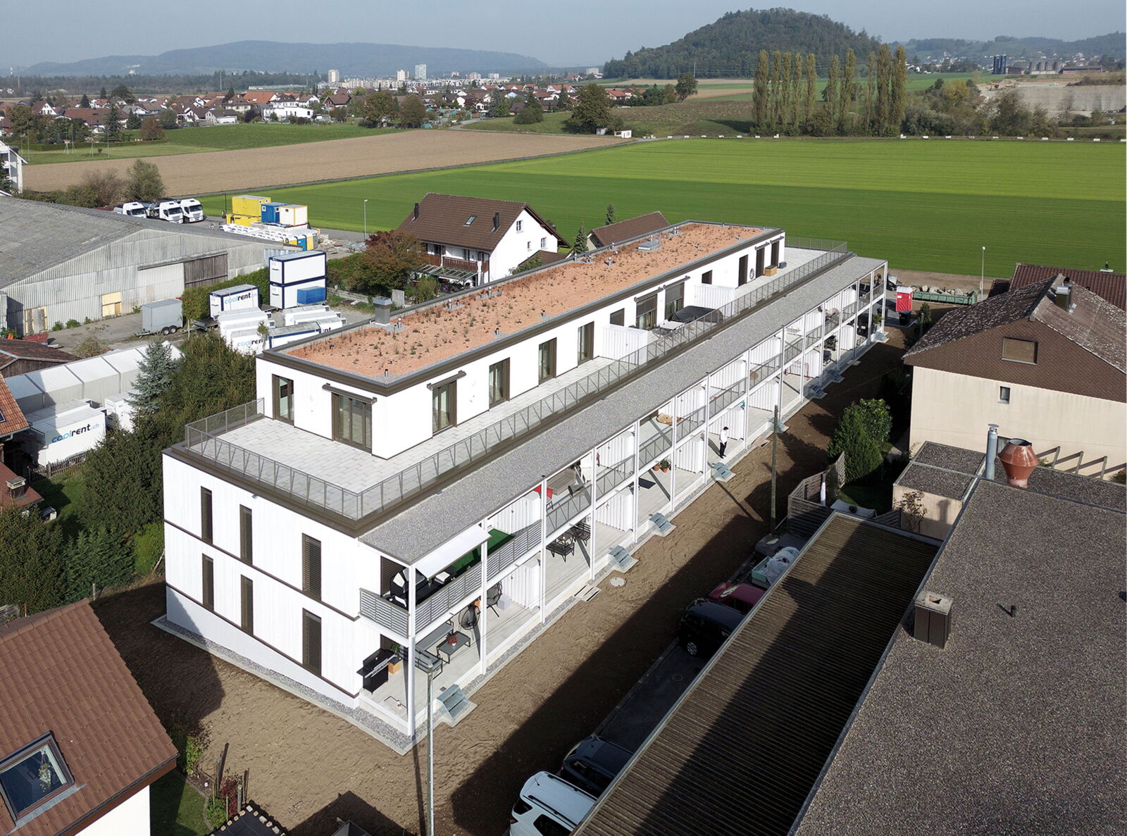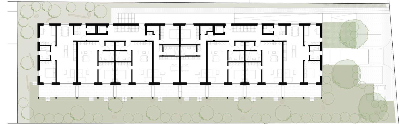 Dem Volumen vorgelagert steht eine Balkonschicht aus einer Metallkonstruktion. Vertikale Stützen wirken als verbindendes Element. Von diesem Aussenraum profitieren die Kleinwohnungen im Erdgeschoss und 1. Obergeschoss. Die Erschliessung der Wohnungen erfolgt über zwei 4-spännige Treppenhäuser. Die Grundrisse sind kompakt gehalten und ökonomisch mit wenig Korridorfläche konzipiert. Natürlich belichtete Arbeitsnischen für Home-Office ab einer Wohnungsgrösse von 3.5 Zimmern schaffen zusätzlichen Wohnraum.