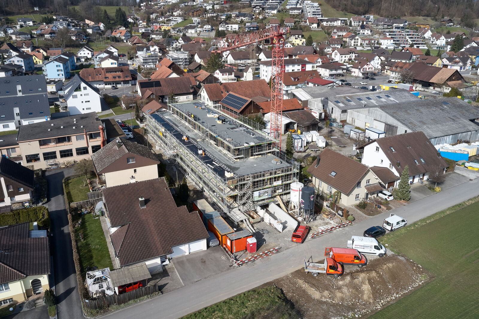 Die Parzelle befindet sich in einem ruhigen Wohnquartier in Schafisheim, angrenzend an die Landwirtschaftszone. Mit unserem Wohngebäude schliessen wir die letzte Bebauungslücke des bestehenden Quartiers und bilden einen Abschluss zur angrenzenden Weite der Landwirtschaftszone. Auf die Ausbildung eines zusätzlich erlaubten Geschosses verzichten wir, um eine bessere Integration in die bestehende Höhenstruktur zu erreichen.