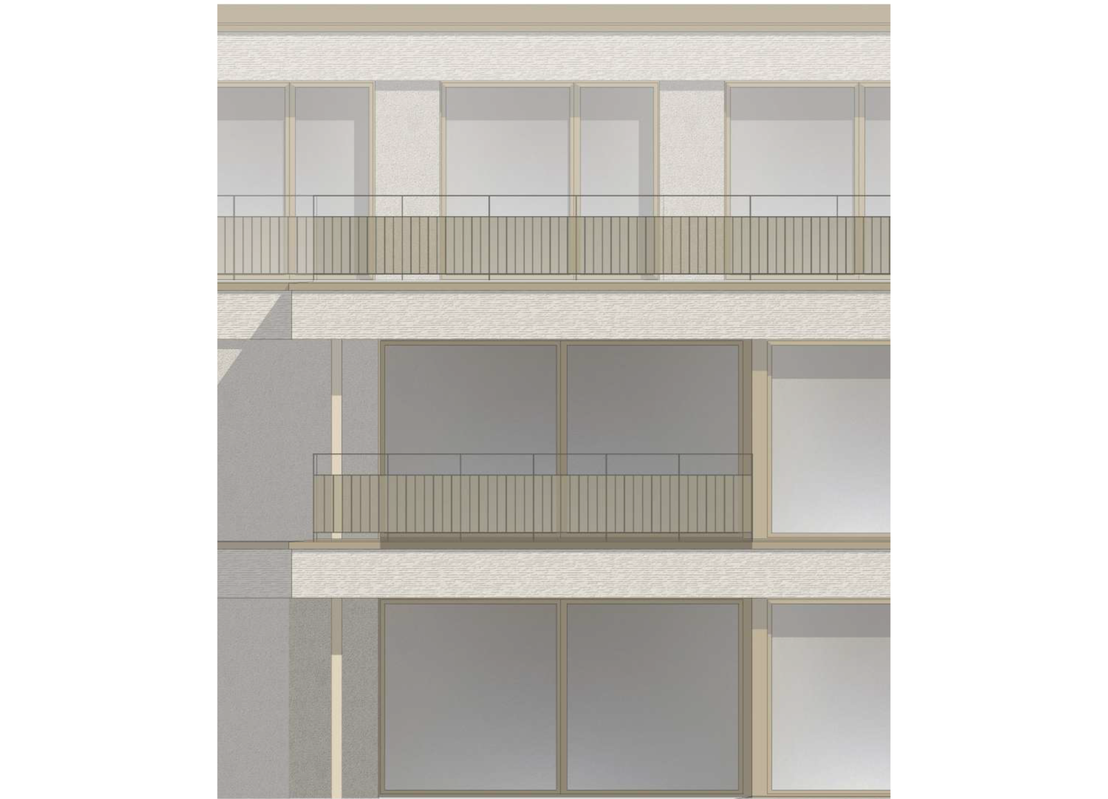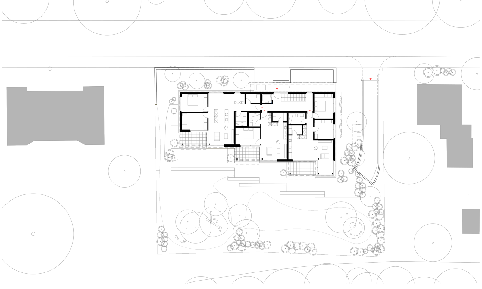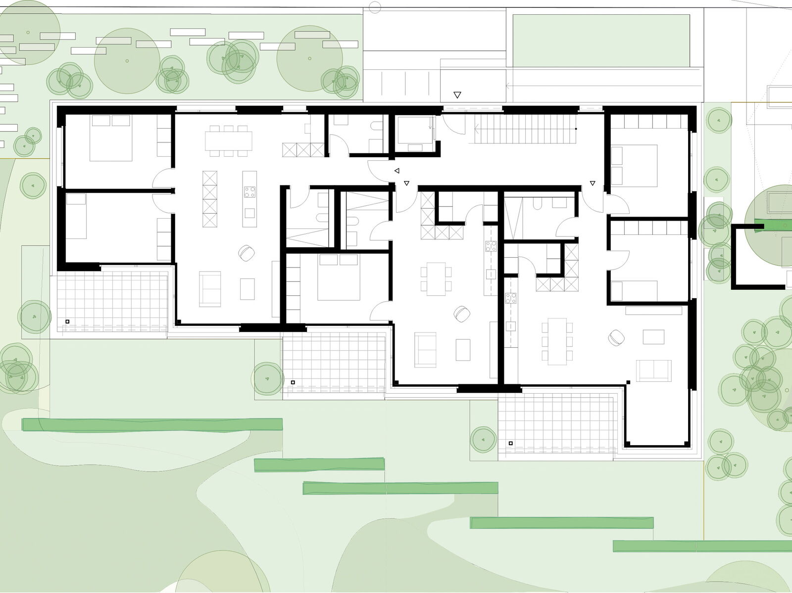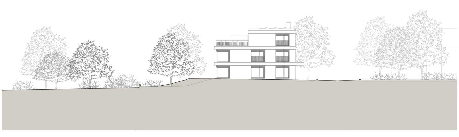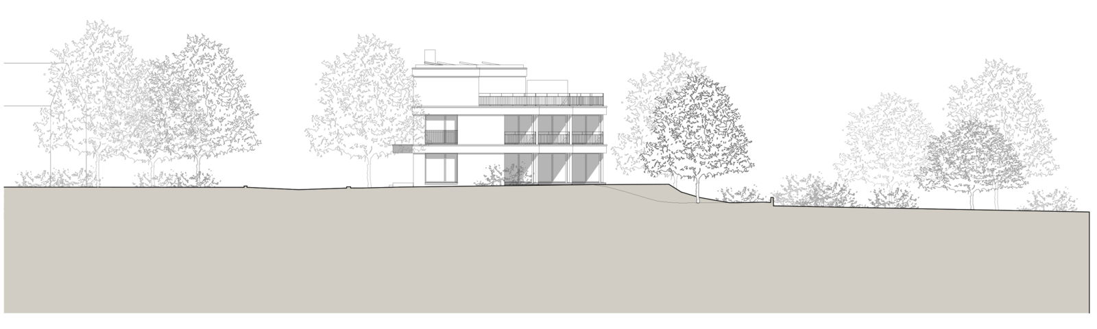 Zusätzlich ortsspezifisch ist die Gartenseite mit aneinander gereihten Privatgärten. Sie zeichnen sich dadurch aus, dass kaum Hecken oder Mauern zwischen den Gärten den Raum verschliessen. Dieser Freiraum zeigt sich daher als zusammenhängendes grünes Band. Dieses sich zwischen Häuserzeile und Hangfuss erstreckende Gartenband wird aufgenommen und analog gestaltet. Das Kontinuum des charakteristischen Grünraumbandes kann zumindest im südlichen Abschnitt, dem Hangfuss entlang, weiterhin gesichert werden. Auch wird in der Aussenraumgestaltung darauf geachtet, dass Durchblicke zwischen den benachbarten Gartenbereichen weiterhin möglich bleiben. Um die privaten Vorräume der Erdgeschosswohnungen angemessen zu schützen ist eine lockere, durchlässige Heckenstruktur zwischen Privat- und Gemeinschaftsgarten vorgesehen.