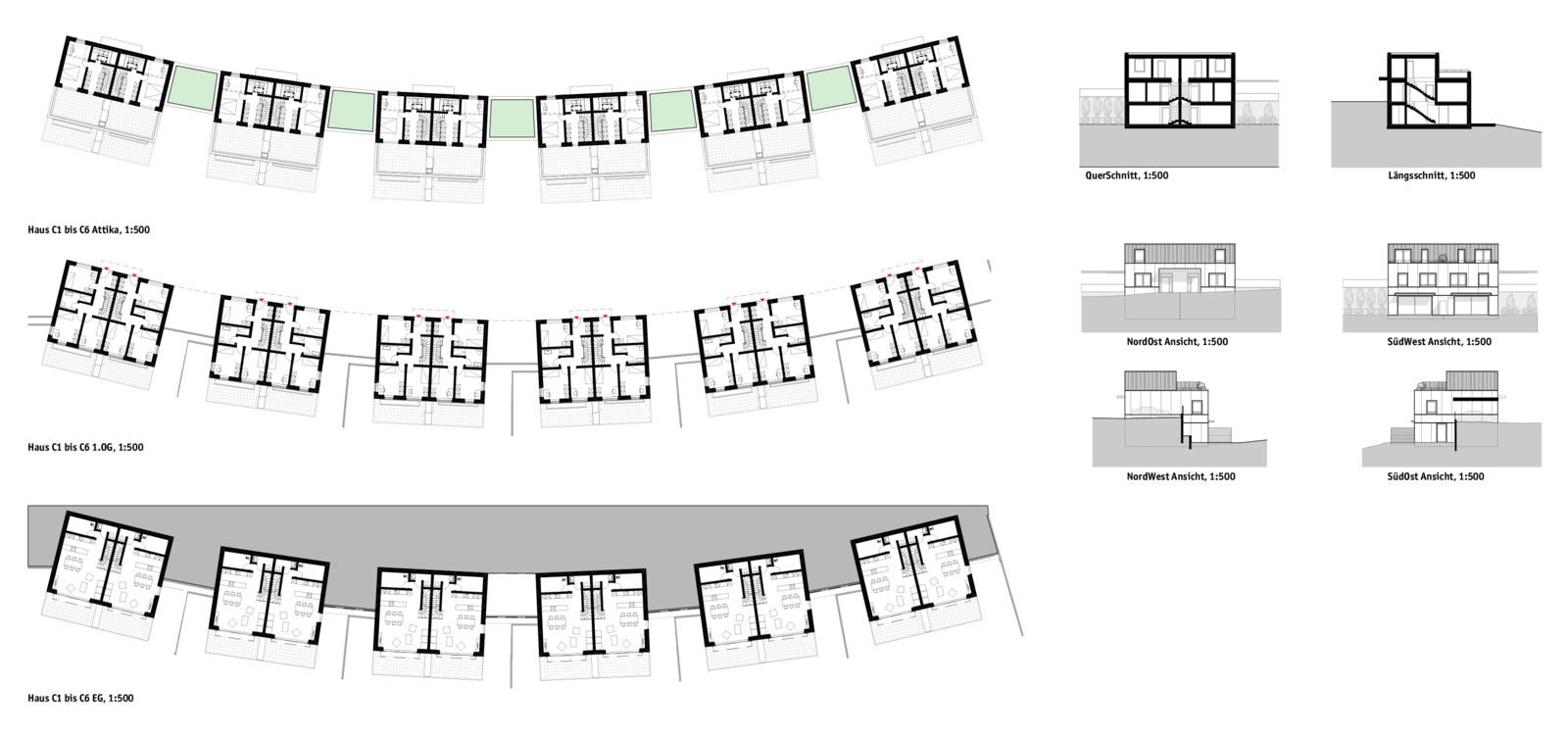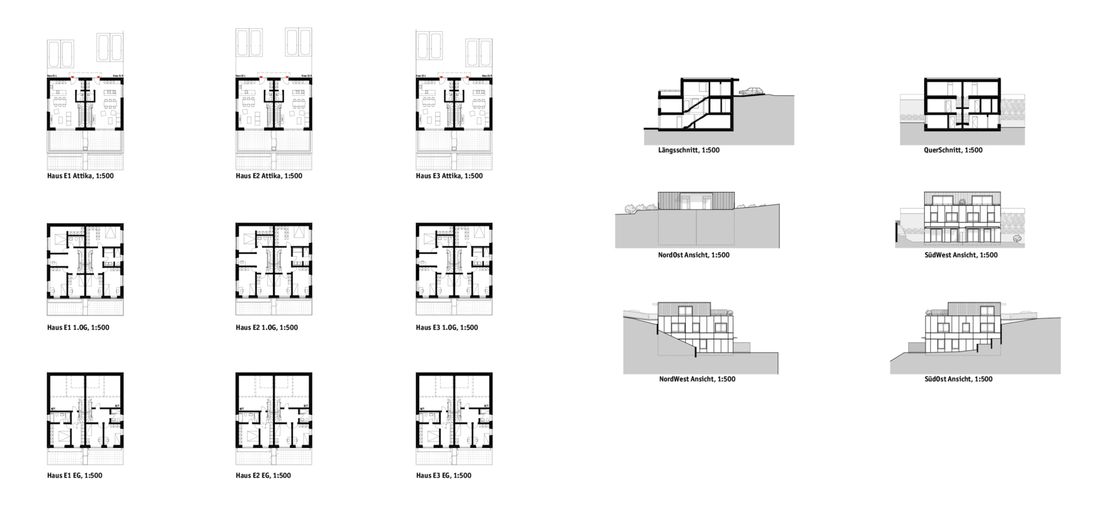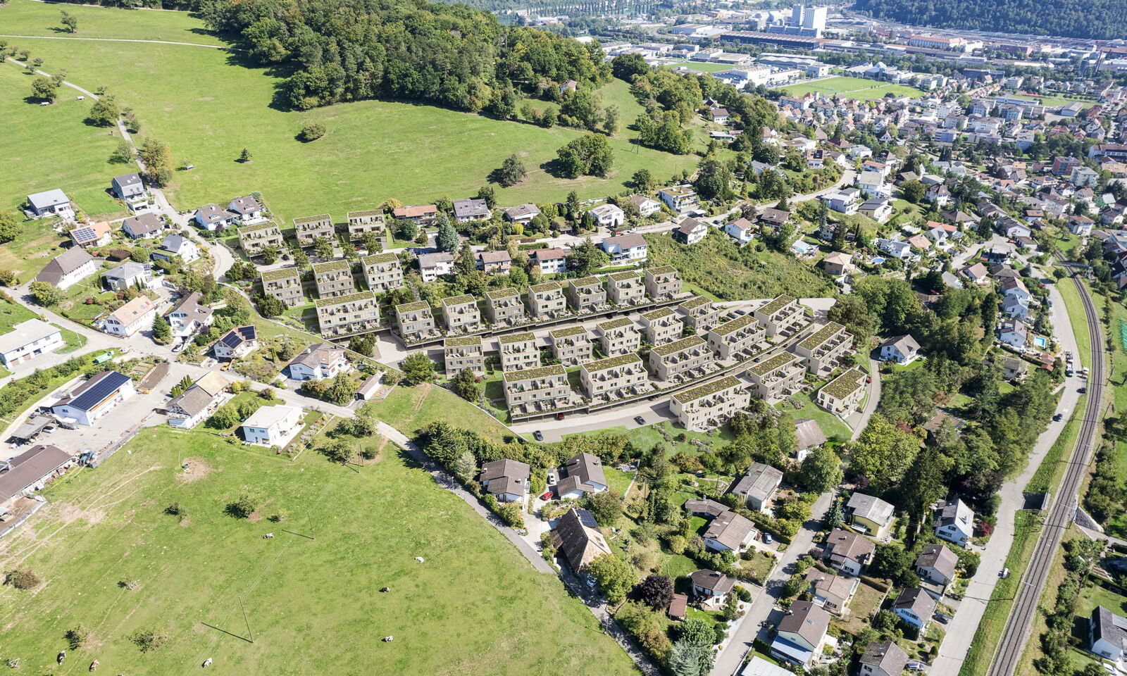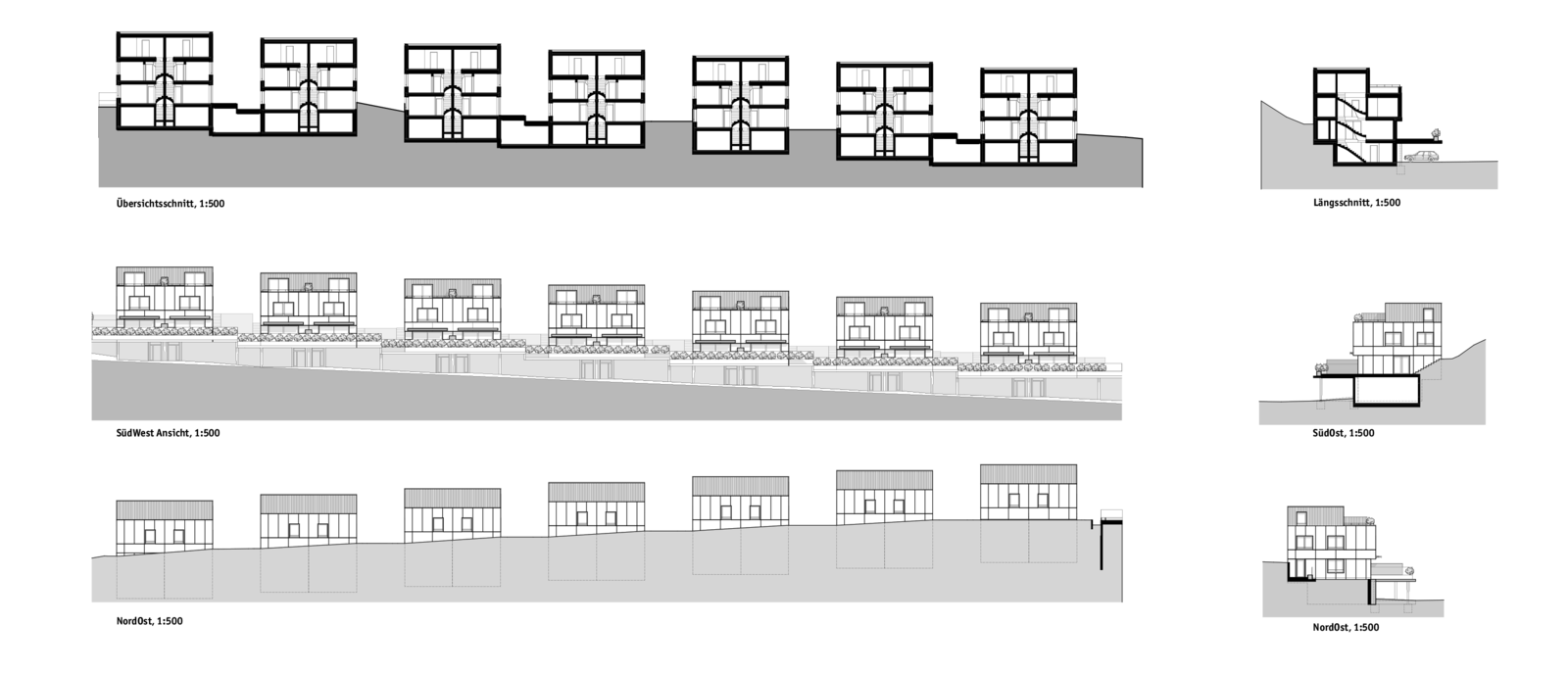 Die jeweils beidseitig der Erschliessung angeordneten Baufelder ermöglichen eine individuelle Realisierung von Einfamilienhäusern, Doppelhäusern oder Reihenhäusern. Die Höhenstaffelung der Hauptgebäude erlaubt, dass die Hauptgebäude mit Nebenbauten verbunden sein können, ohne die Aussicht zu beeinträchtigen.