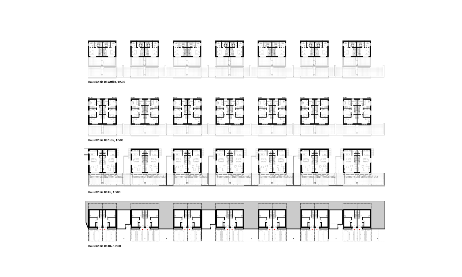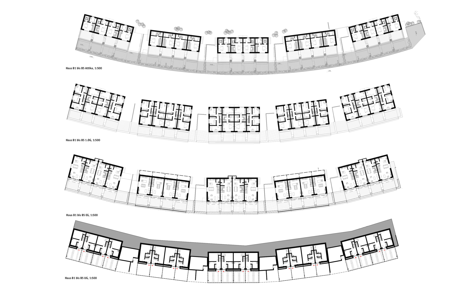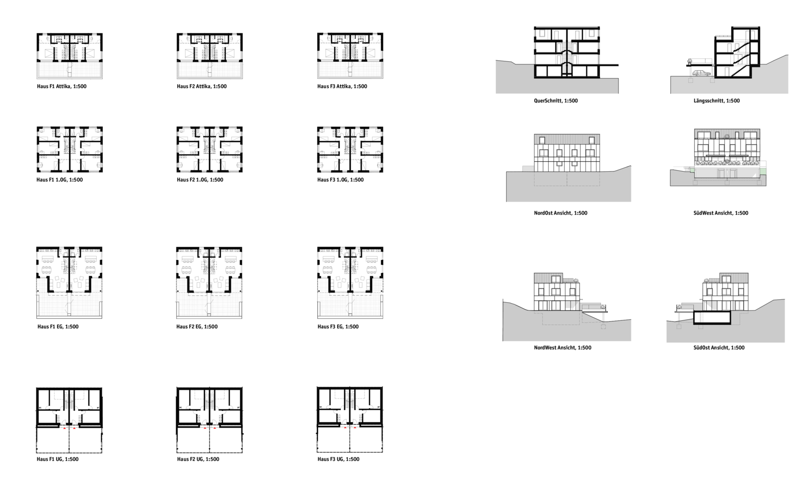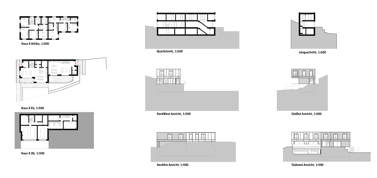 Die jeweils beidseitig der Erschliessung angeordneten Baufelder ermöglichen eine individuelle Realisierung von Einfamilienhäusern, Doppelhäusern oder Reihenhäusern. Die Höhenstaffelung der Hauptgebäude erlaubt, dass die Hauptgebäude mit Nebenbauten verbunden sein können, ohne die Aussicht zu beeinträchtigen.