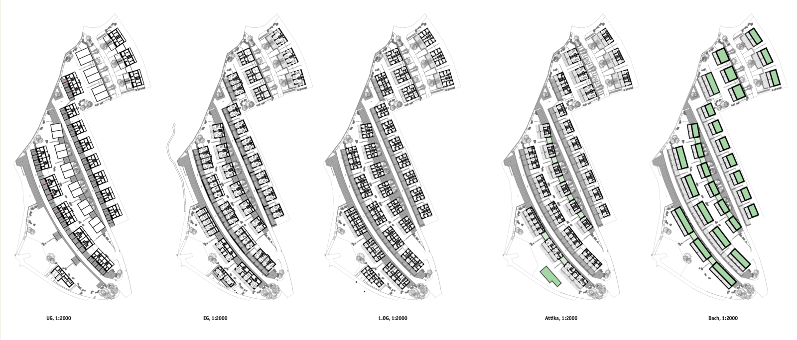 Der Planungsperimeter wird durch die neuen Erschliessungen entlang der Höhenkurven in horizontale, höhenversetzte Streifen gegliedert, die entweder von Bauten oder Grünbereichen besetzt sind. Dadurch entsteht ein ruhiges, durchgrüntes, der Topographie angepasstes Siedlungsbild.