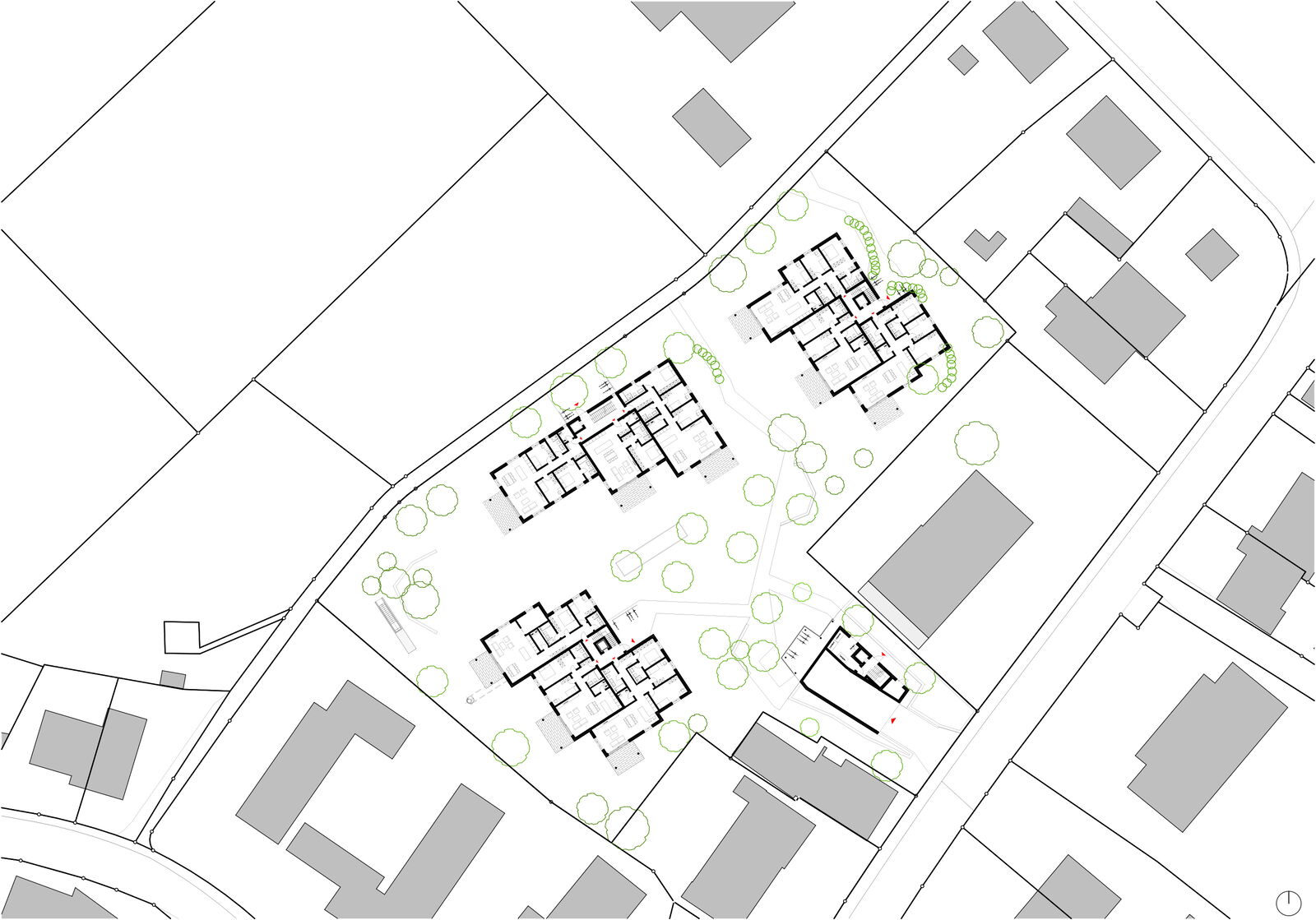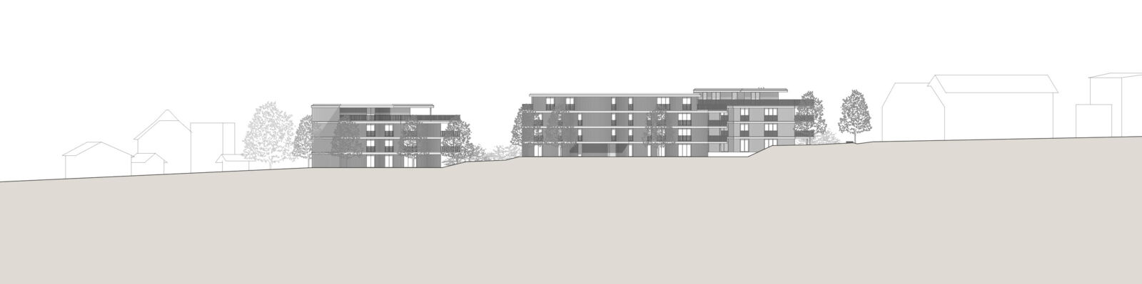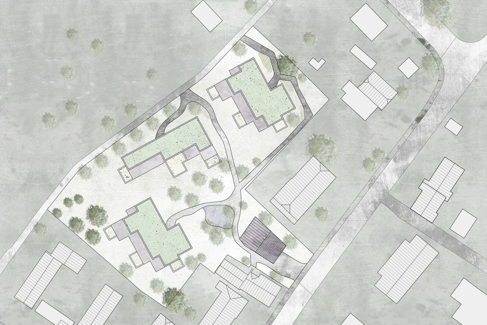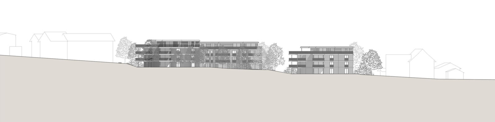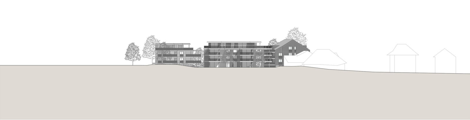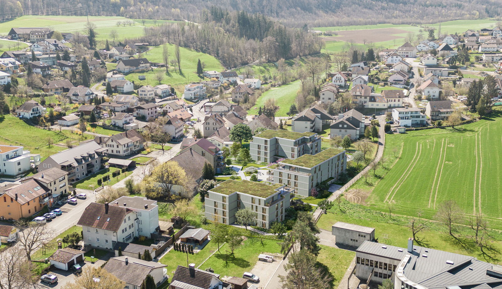 Die drei Mehrspänner liegen, in zweiter Bautiefe zur Strasse, in der W3 Zone. Sie bilden den Übergang von der dichten Bebauung an der Dorfstrasse zur unverbaubaren Landwirtschaftszone. Die Gebäude gruppieren sich um einen zentralen, sorgfältig gestalteten Aussenraum. Die Überbauung erfüllt die Kriterien für eine Arealüberbauung, was an dieser attraktiven Wohnlage eine Verdichtung nach innen erlaubt.