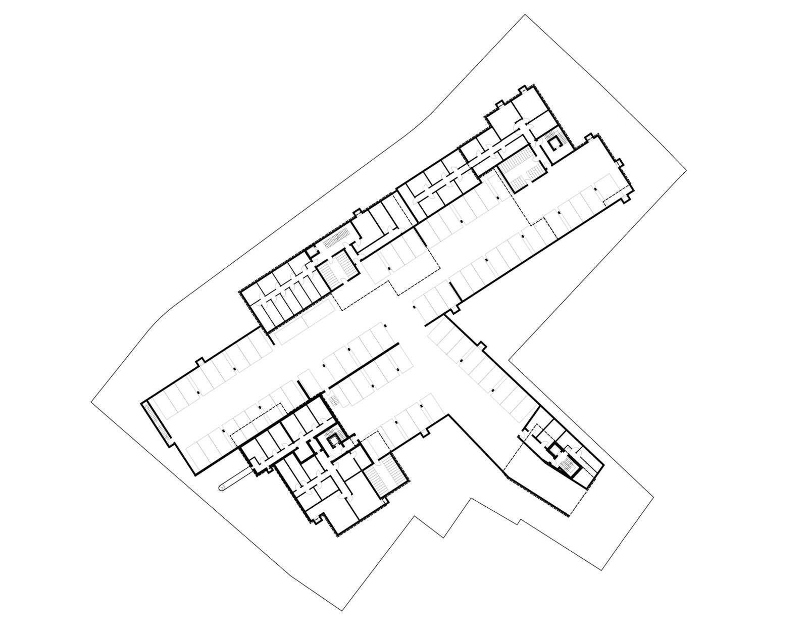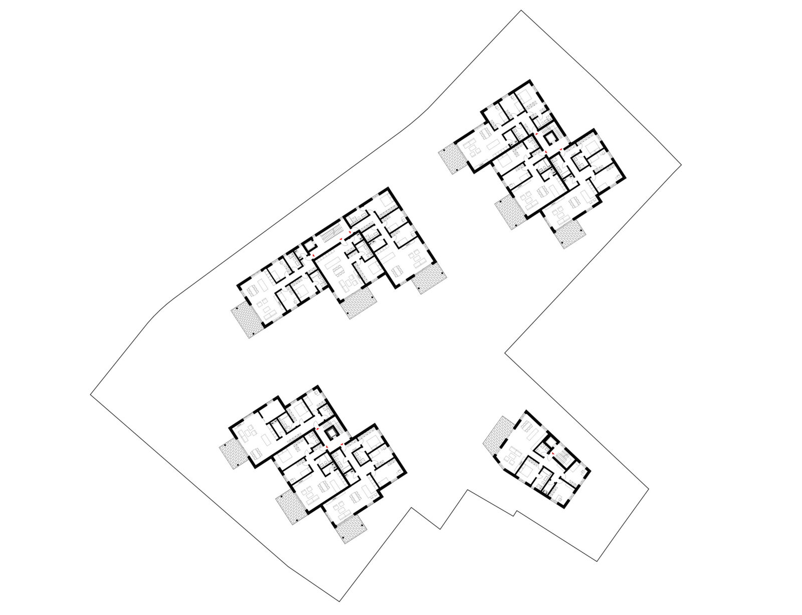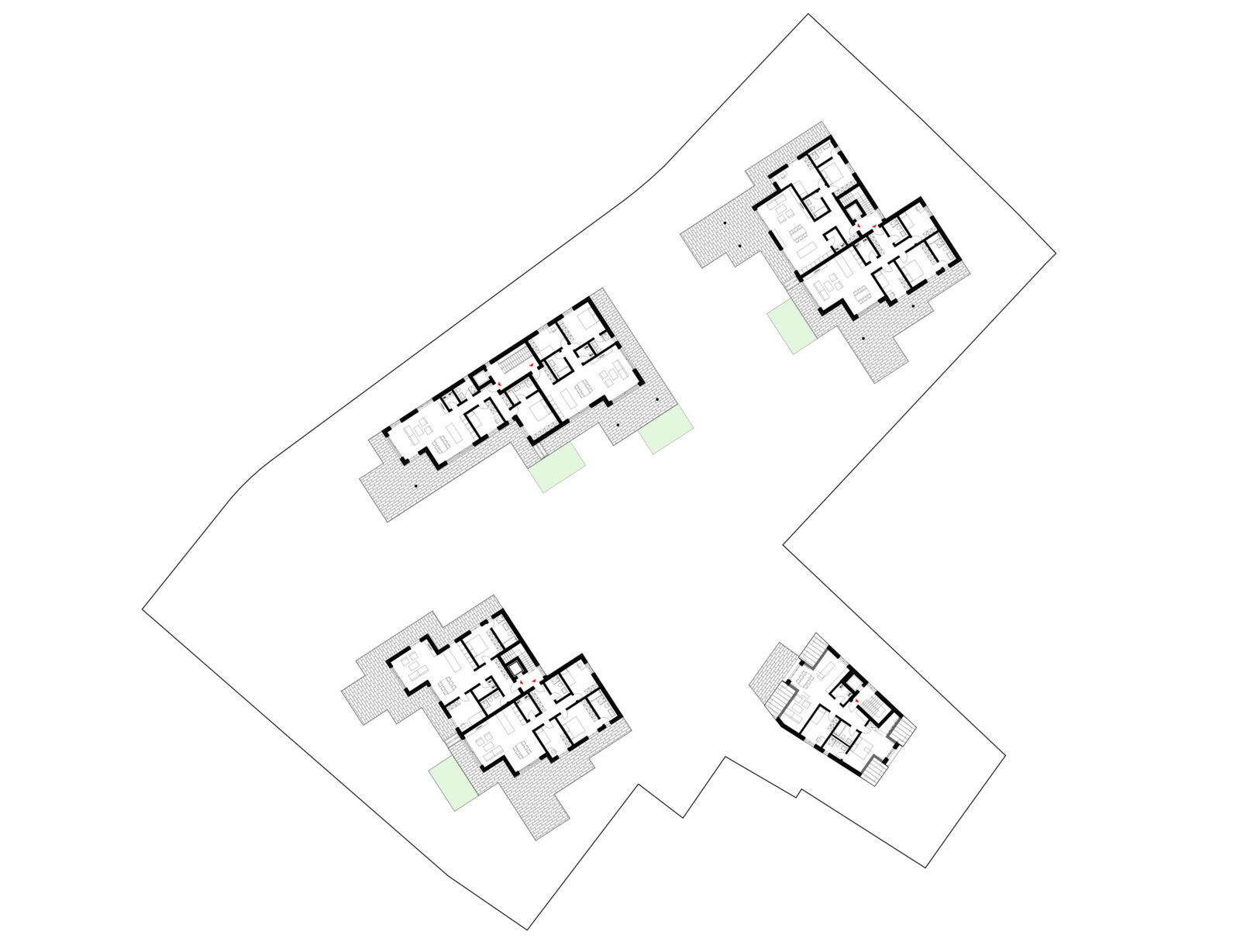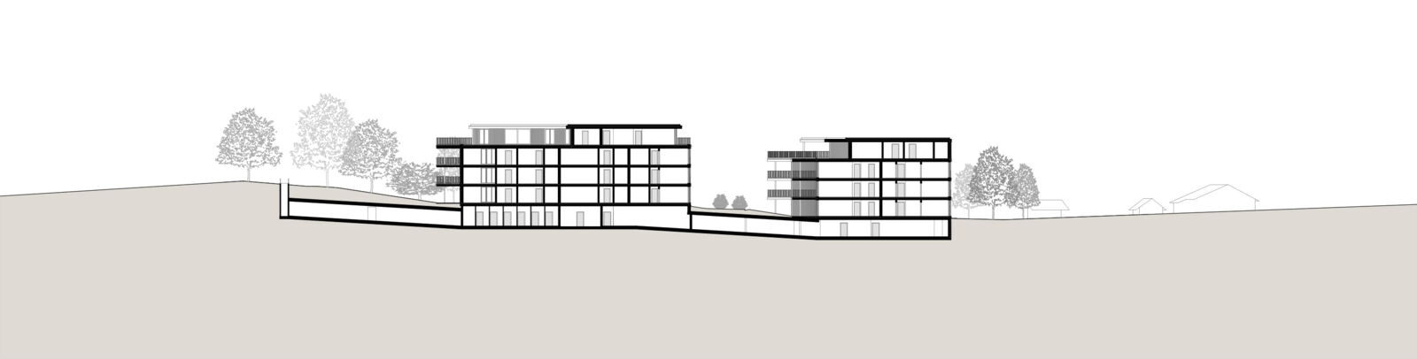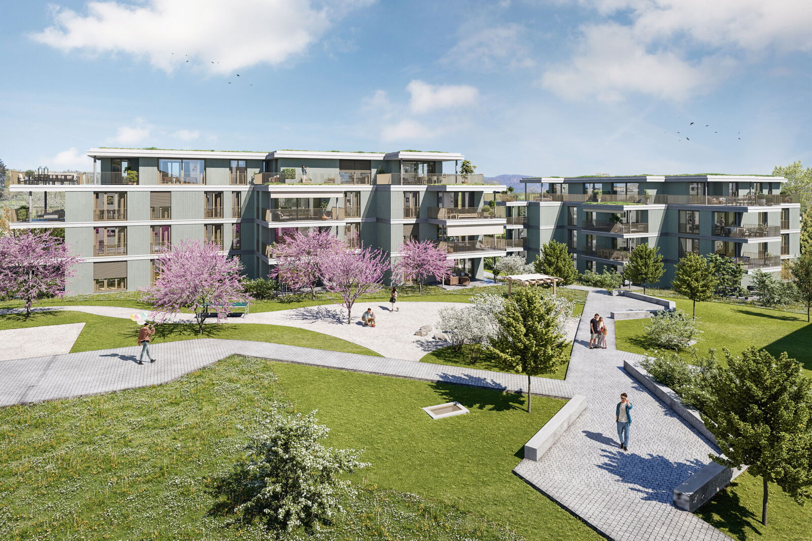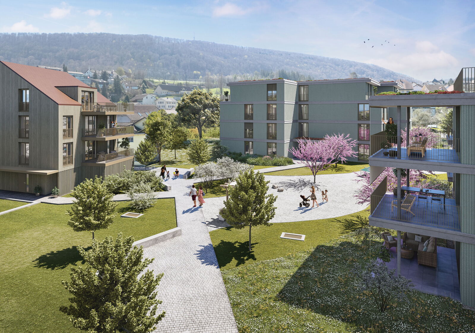 Die drei Mehrspänner liegen, in zweiter Bautiefe zur Strasse, in der W3 Zone. Sie bilden den Übergang von der dichten Bebauung an der Dorfstrasse zur unverbaubaren Landwirtschaftszone. Die Gebäude gruppieren sich um einen zentralen, sorgfältig gestalteten Aussenraum. Die Überbauung erfüllt die Kriterien für eine Arealüberbauung, was an dieser attraktiven Wohnlage eine Verdichtung nach innen erlaubt.