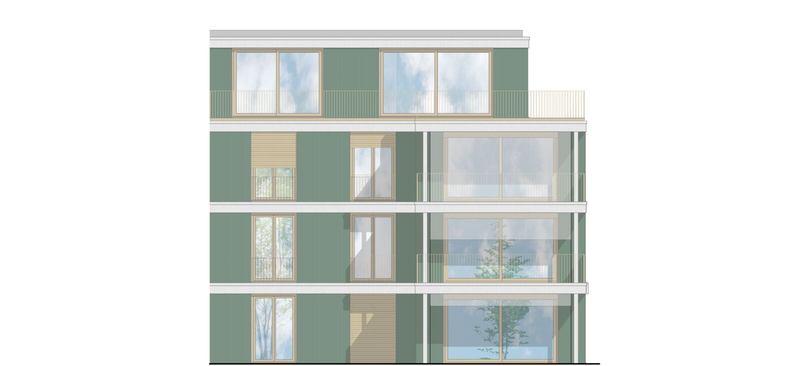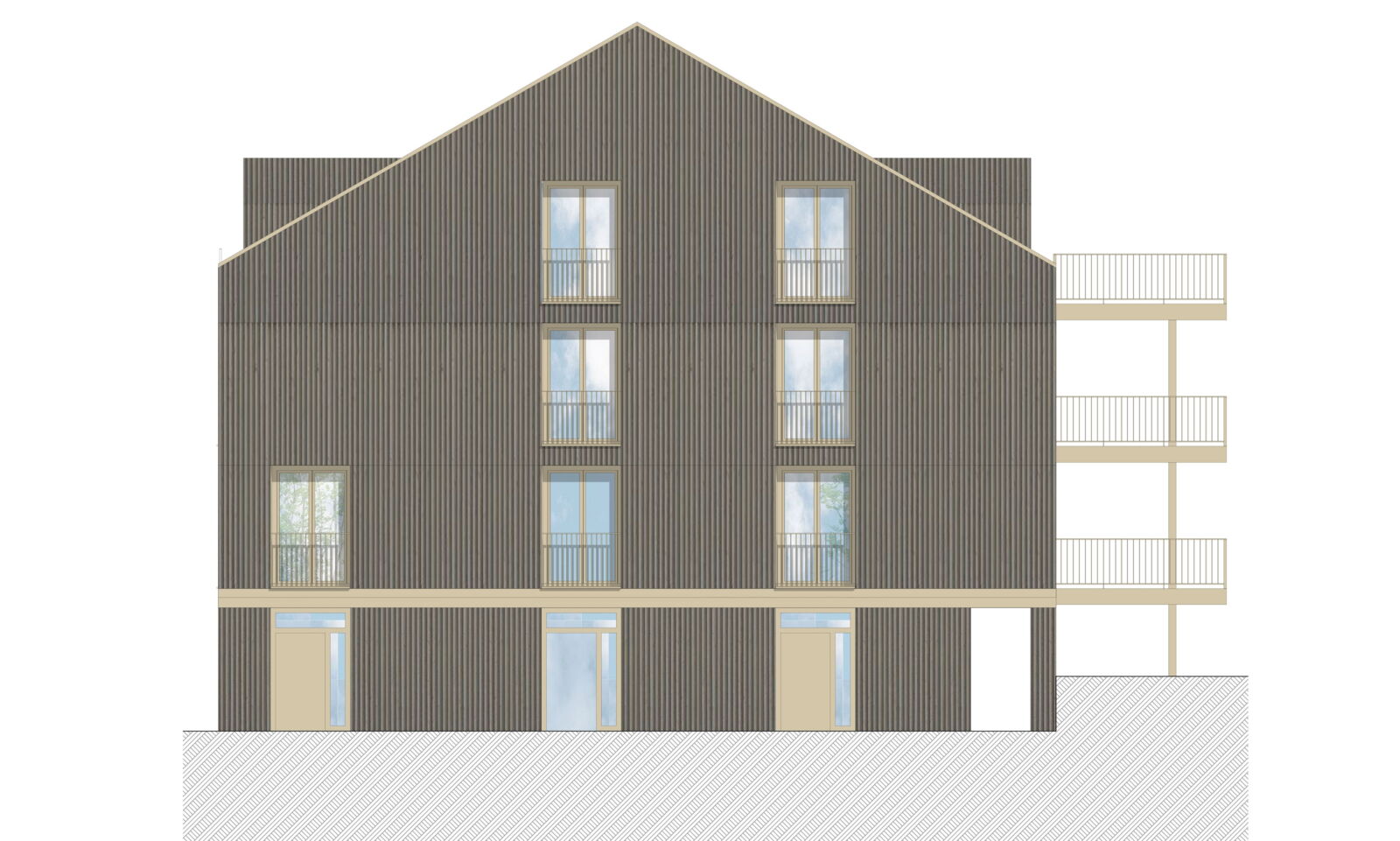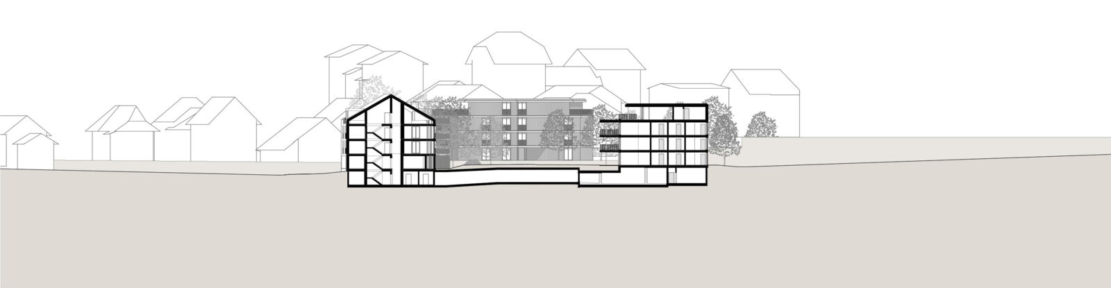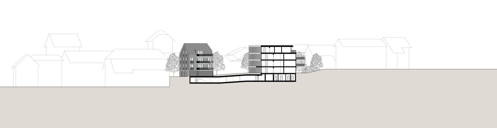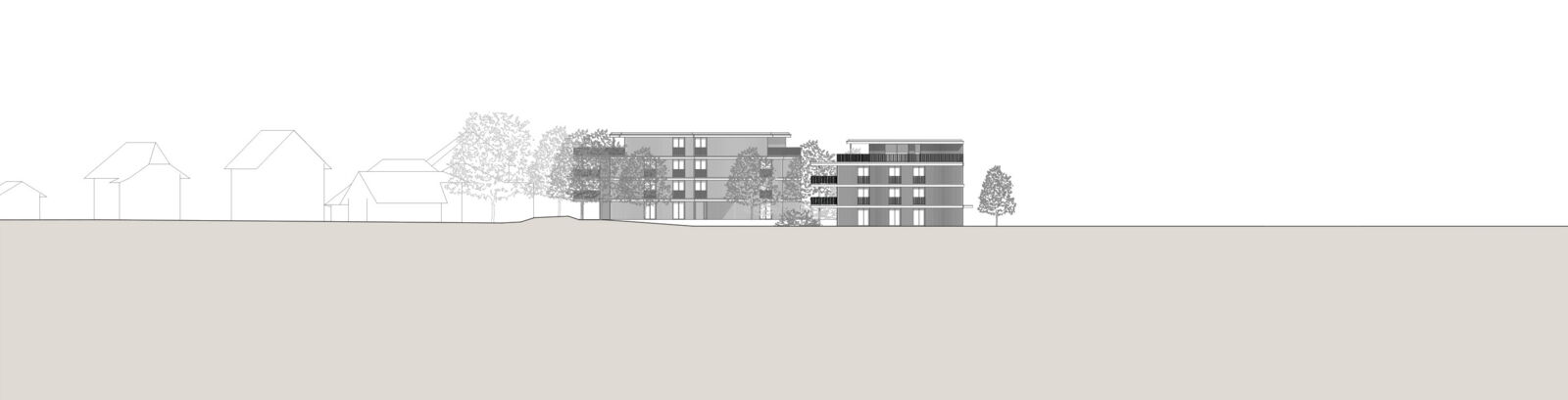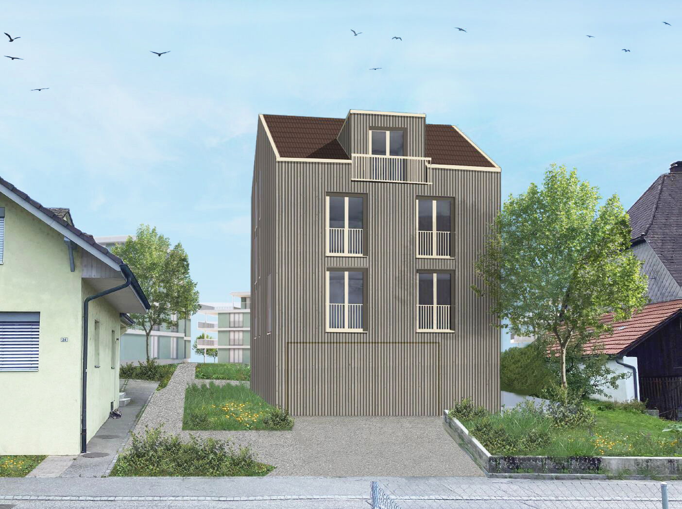 Die Adressierung der neuen Überbauung – bestehend aus vier Mehrfamilienhäusern – bildet ein Solitär an der Dorfstrasse. Mit diesem Gebäude schliessen wir die existierende Baulücke und nehmen das Thema der Vorgärten auf. Die vertikal gegliederte Fassade ist mit Holz verkleidet und verfügt über ein bündiges Satteldach. Die Erschliessung der vier Wohnbauten erfolgt durch den Vorgartenbereich, einmal als Zufahrt zur gemeinsamen Tiefgarage sowie als Fussgängerweg.