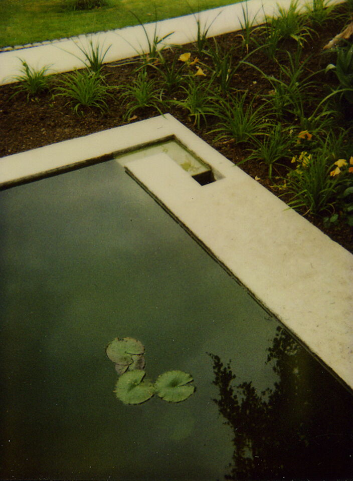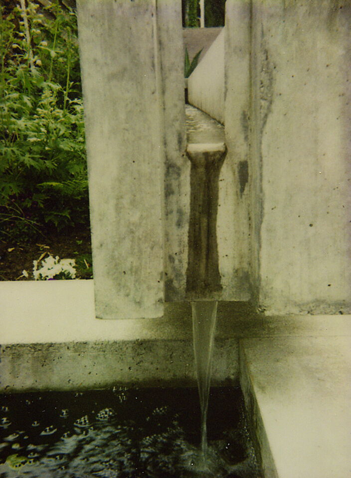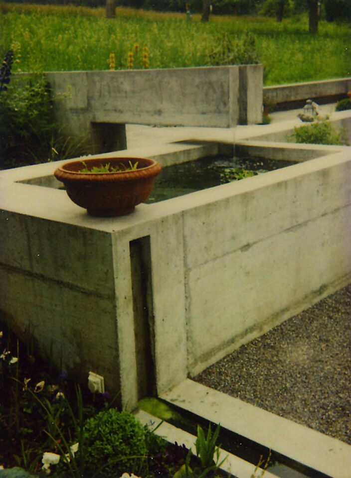 Die terrassierte Anordnung der bestehenden Anlage gab das Thema für den neuen, kleinen Garten vor. Betonbänder - zwei- und dreidimensional angelegt - strukturieren den Garten in ein Geflecht von Natur, Geometrie und Kaskaden. Das leichte Klingen des Wassers steht im Diskurs zur Schwere des Betons: der Wasserlauf wird akustisch gestaltet. Vom Ton des fallenden Elementes über das Plätschern hin zur flüsternden Verabschiedung am Auslauf.
