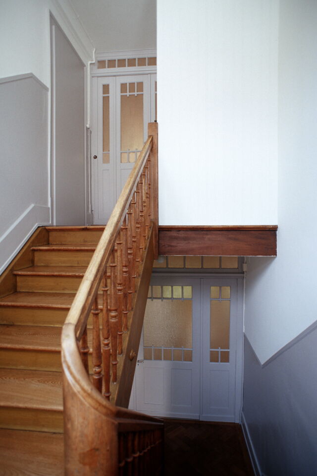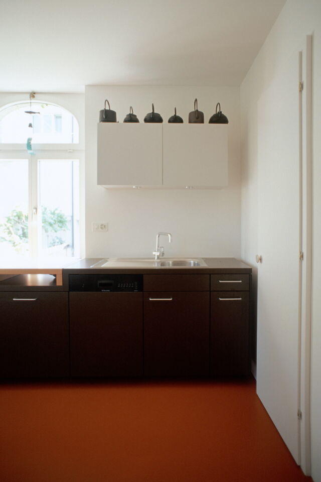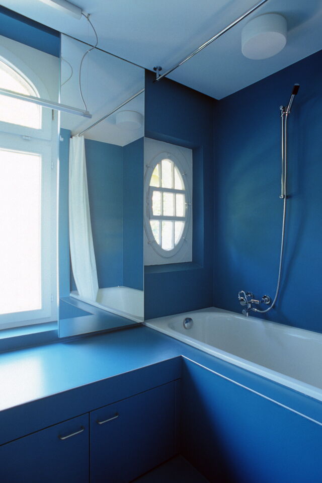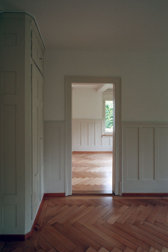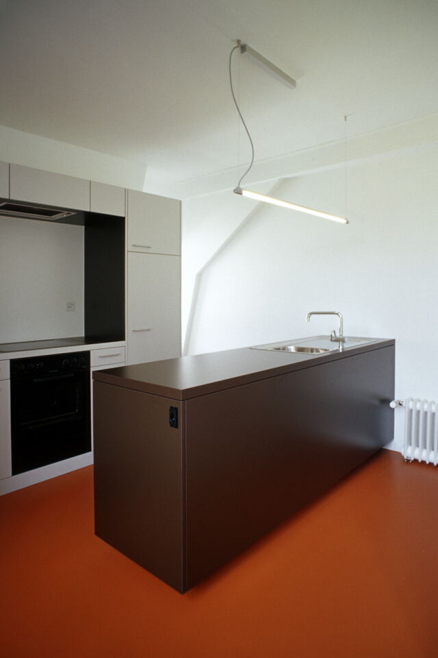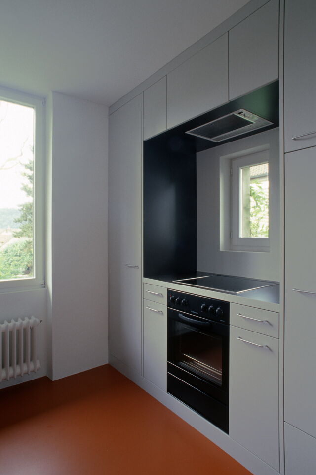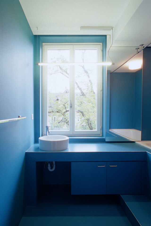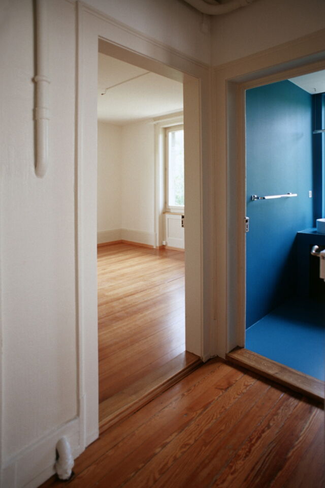 Unter Beibehalten der guten Struktur des Hauses, werden die Wohnungen auf einen zeitgemässen Stand gebracht. Im engen Kostenrahmen entwickeln wir spezifische Details und eine entsprechende Materialisierung. Das Farb- und Materialkonzept befasst sich mit dem Thema von Bild und Abbild: Farben und Materialien spielen mit Typologien von Möbeln, Analogien (Holz zu Kunstharz) und künstlichen Welten.