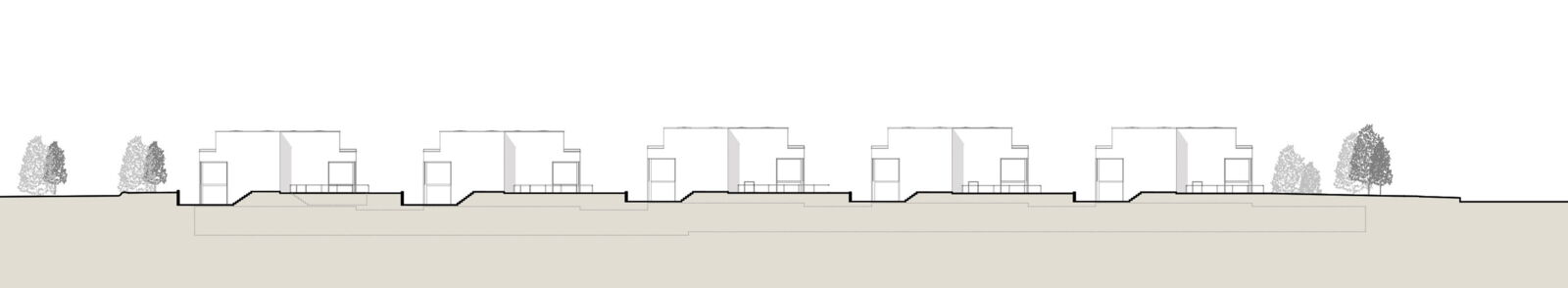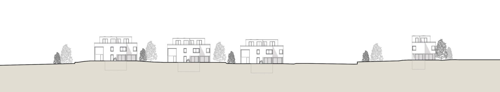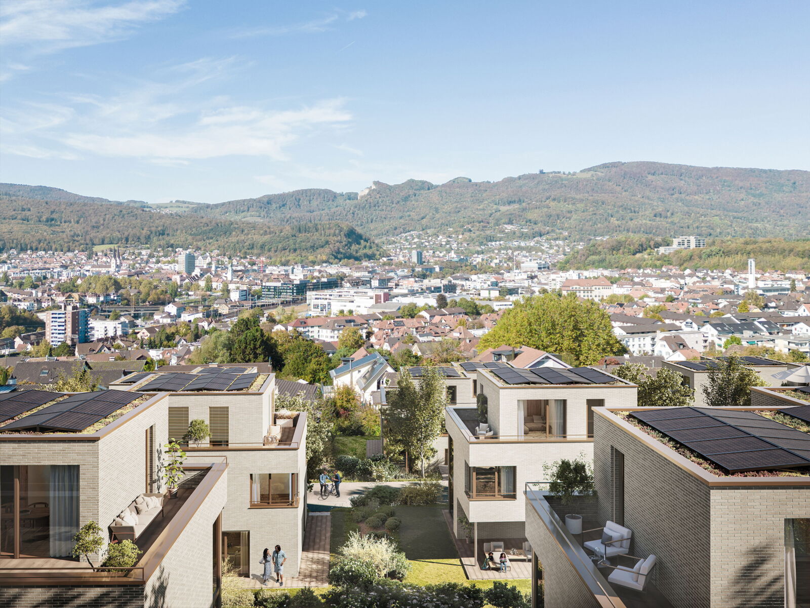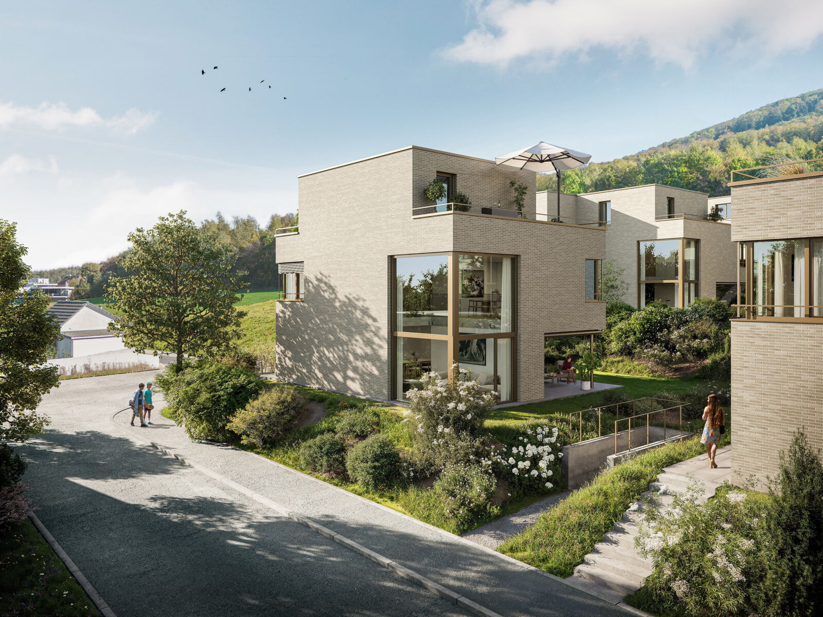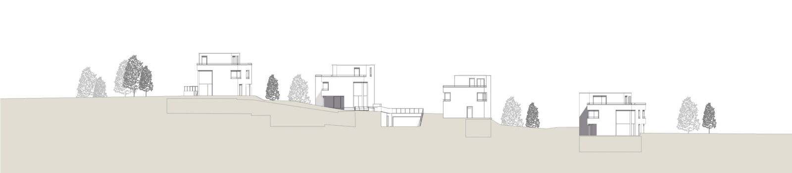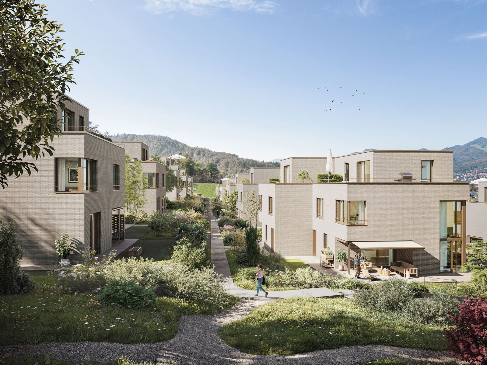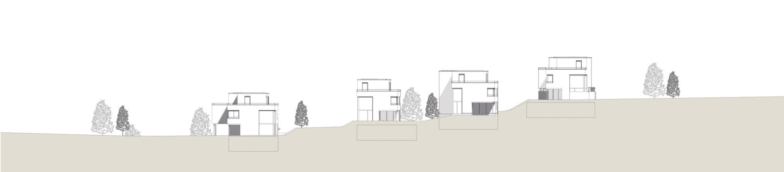 Die Häuser sind zweigeschossig und verfügen über ein Attikageschoss. Im Erdgeschoss befinden sich der offene Koch- / Essbereich mit angegliedertem Sitzplatz und der zweigeschossige Wohnbereich. Damit wird ein räumlicher Bezug geschaffen zum Obergeschoss mit den Zimmern und einer Galerie. Das Attikageschoss mit grosszügiger Terrasse dient als Masterbedroom mit Ankleide und Bad.