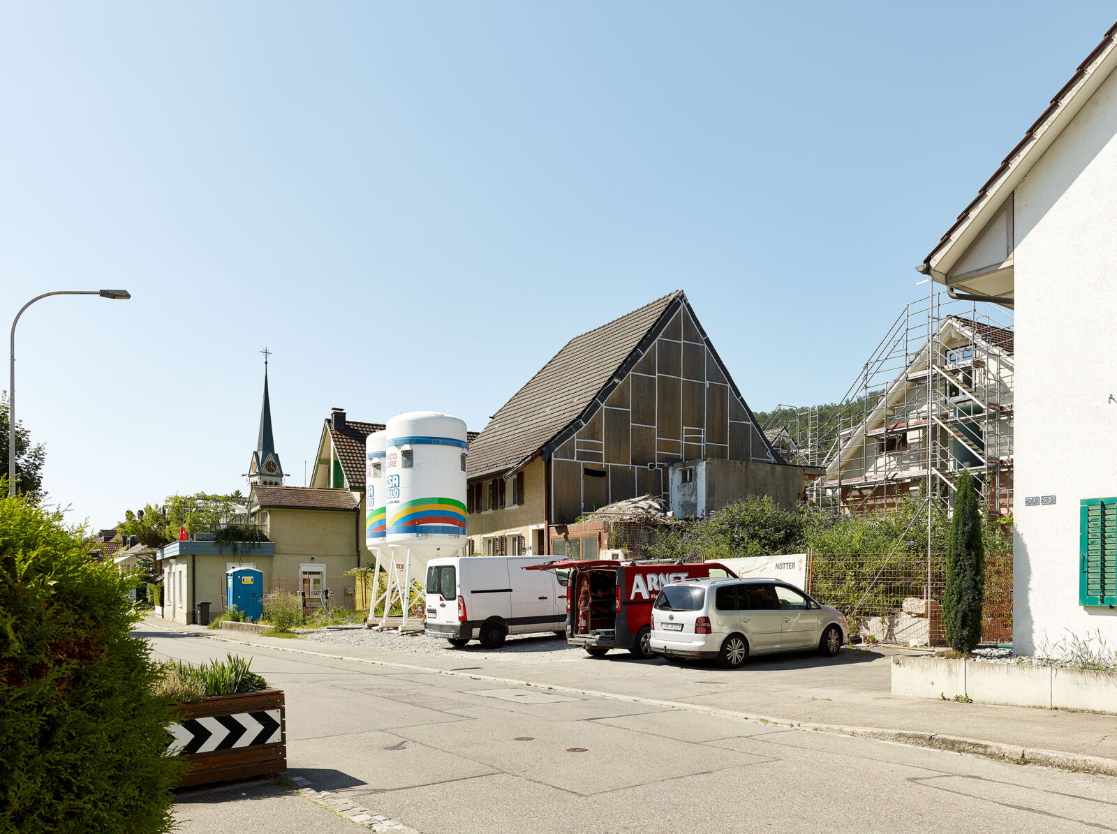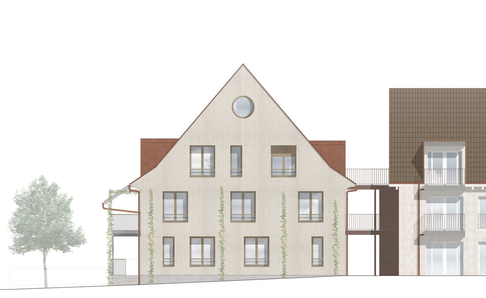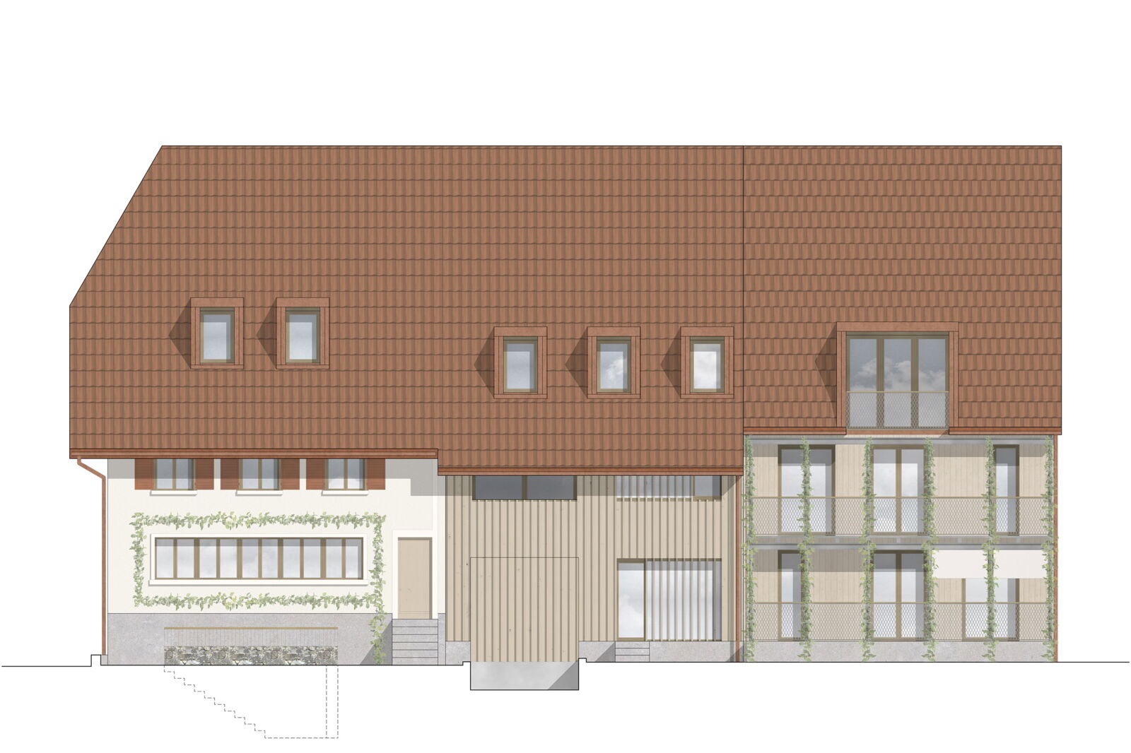 Der angrenzende Ersatzneubau ist eine Neuinterpretation des Bestands und entspricht dem ursprünglichen Volumen. Die ursprüngliche Dreiteiligkeit des Gebäudes ist Teil des Konzepts und wird wiederaufgenommen. Anstelle des ehemaligen Tenns in der Mitte wird die Einfahrt in die Einstellhalle zu liegen kommen und die Fassade mit einer offenen Holzschalung verkleidet. Der östlich gelegene Gebäudeteil zeichnet sich durch eine Balkonschicht nach Süden und einer weiss lasierten Holzfassade aus, welche durch die Anordnung der Fenster ein modernes Erscheinungsbild erhält.