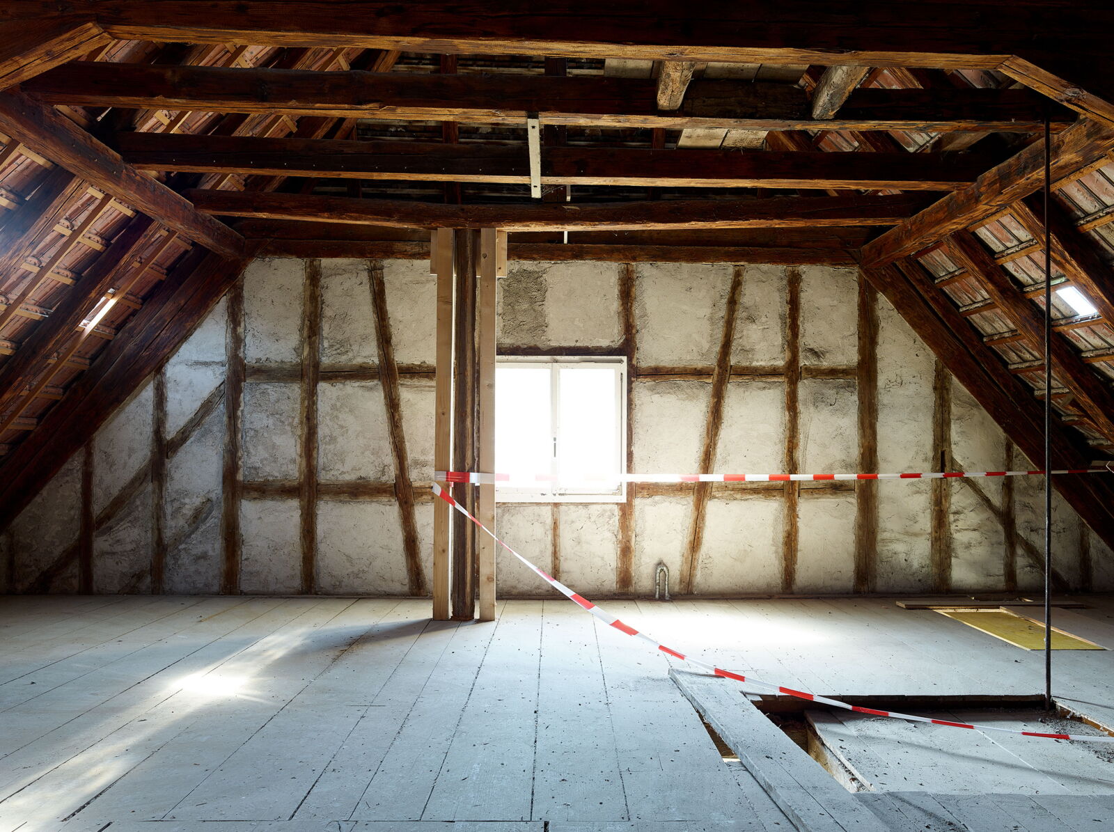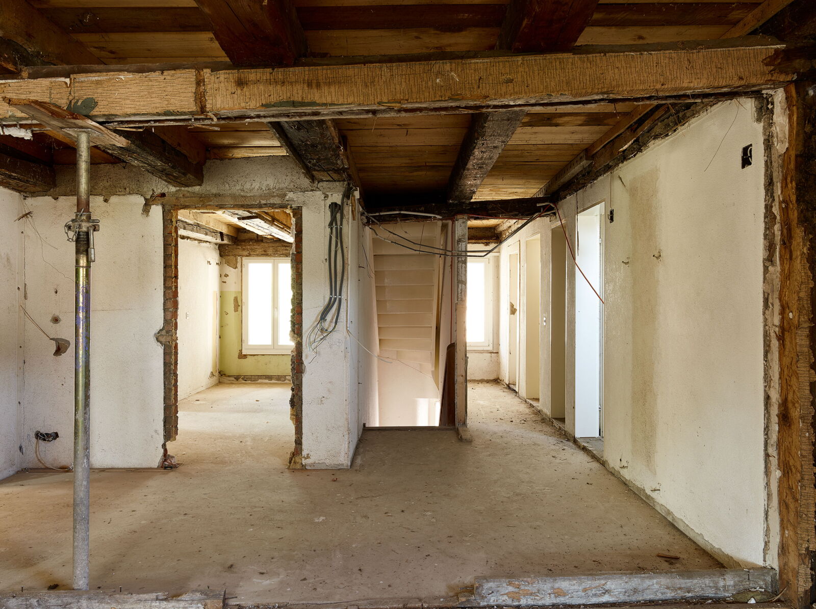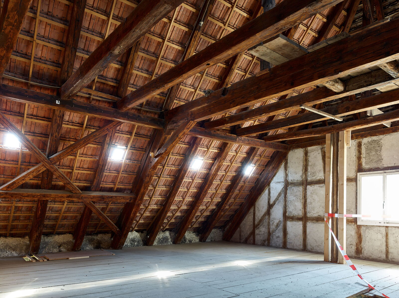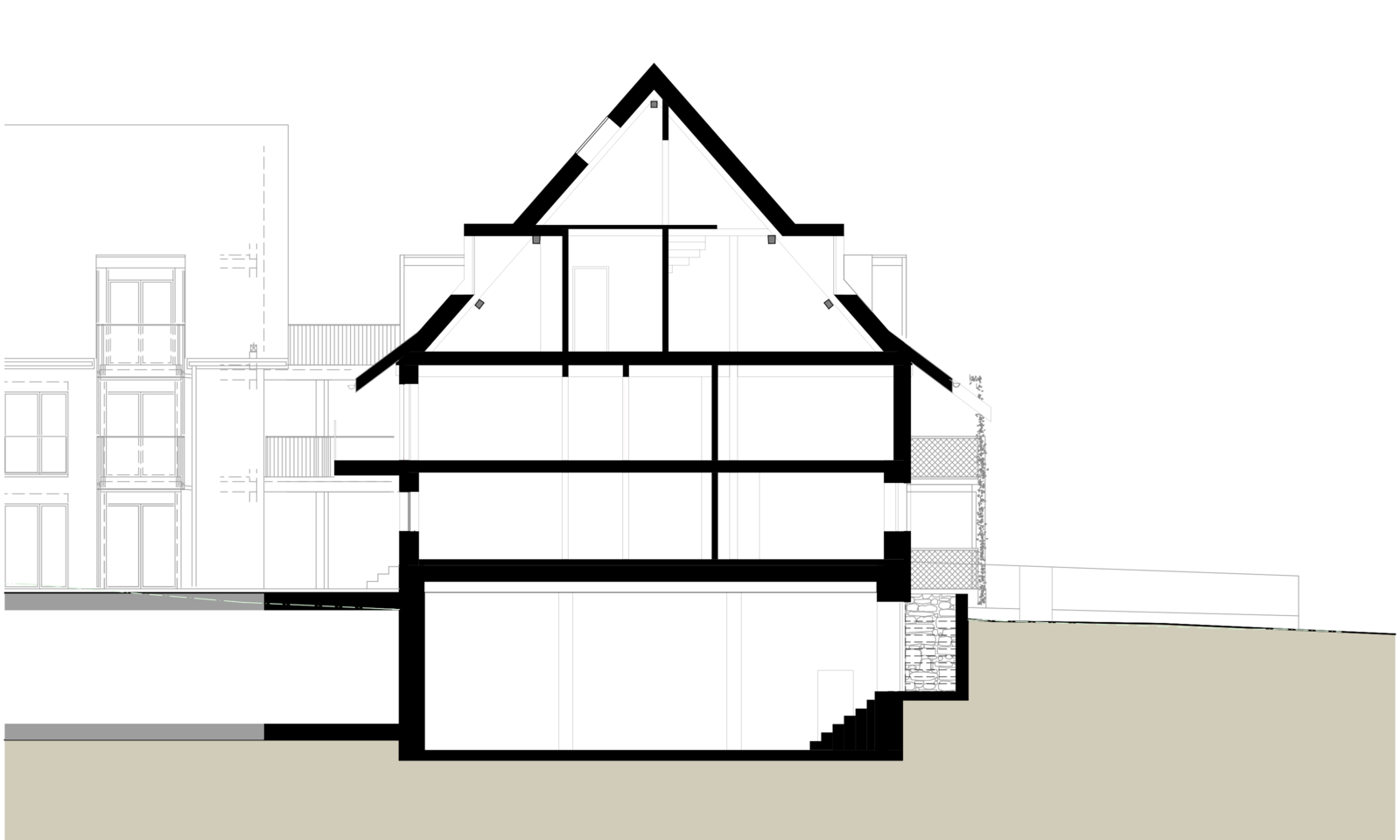 Der Bestandsbau wird sorgfältig umgebaut, wobei der bestehenden Stützenlage im Keller und der Balkenlage im Dachgeschoss grosse Beachtung geschenkt wird, um die statischen Herausforderungen zu meistern. Der Dachstuhl soll bewohnbar gemacht und die alten Balken gezeigt werden.
