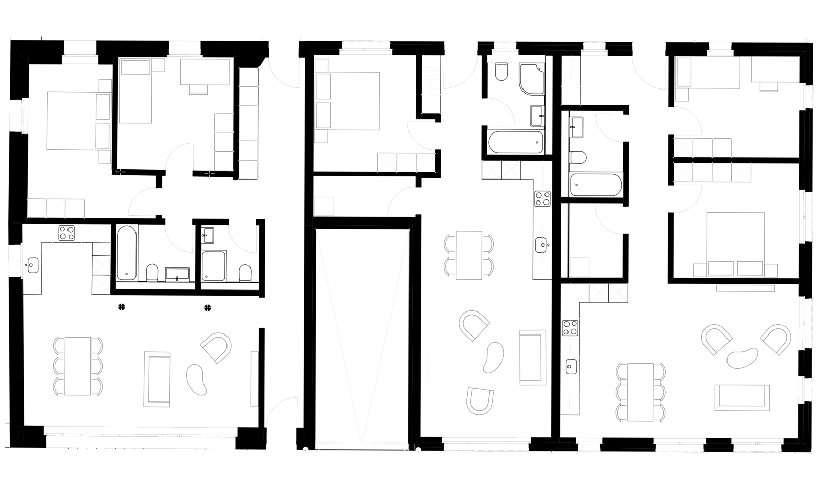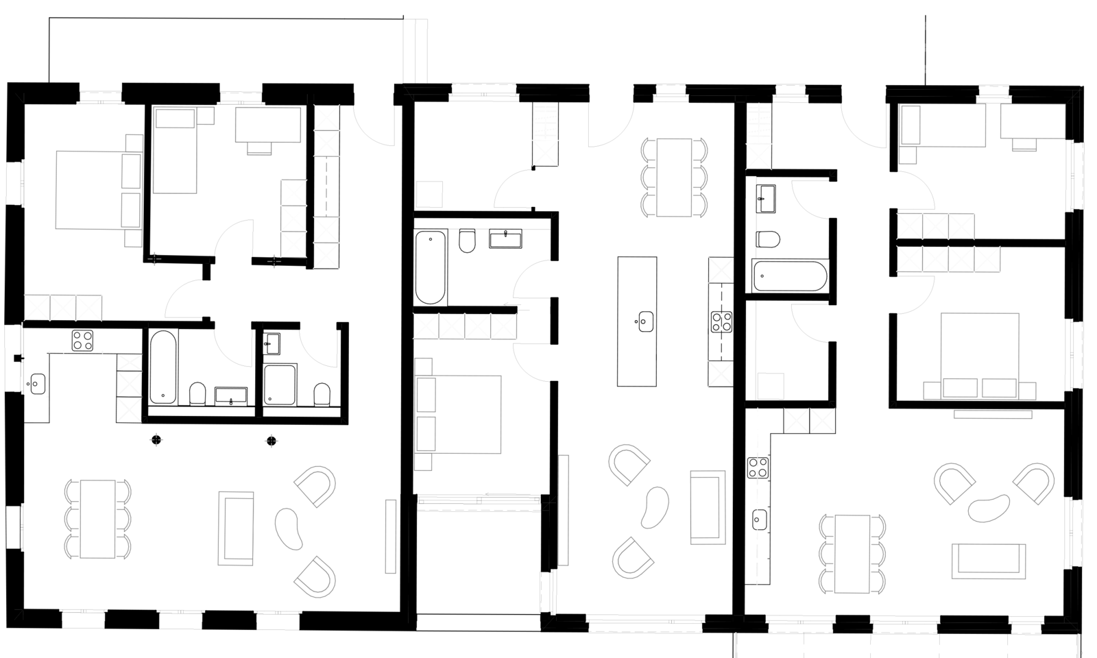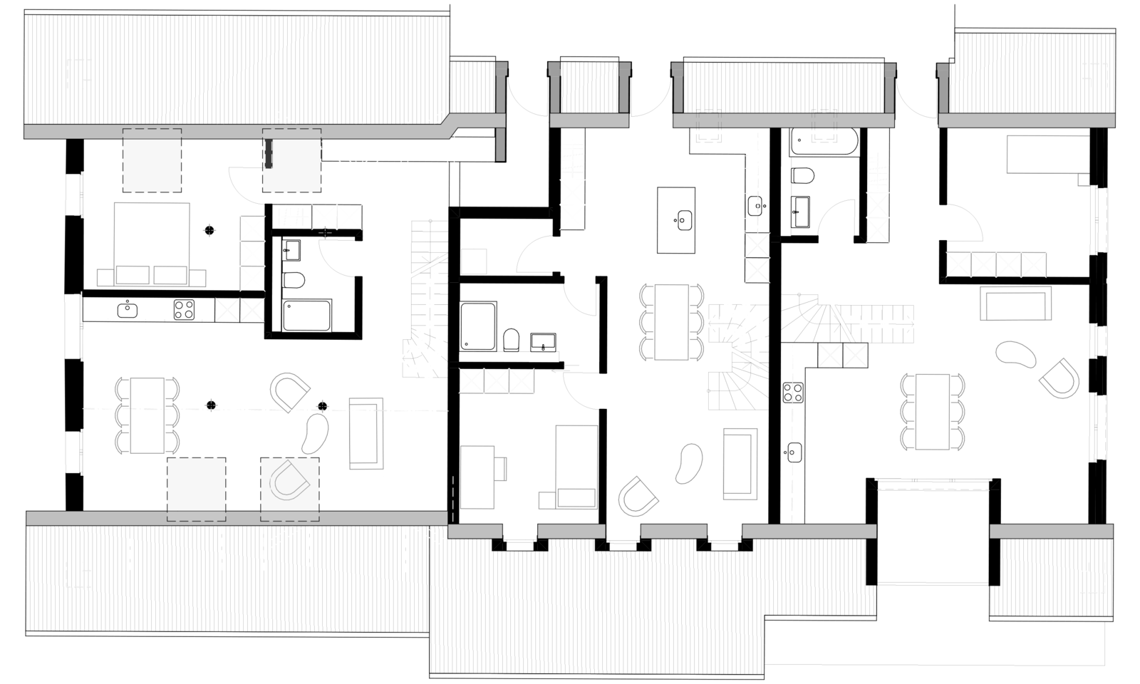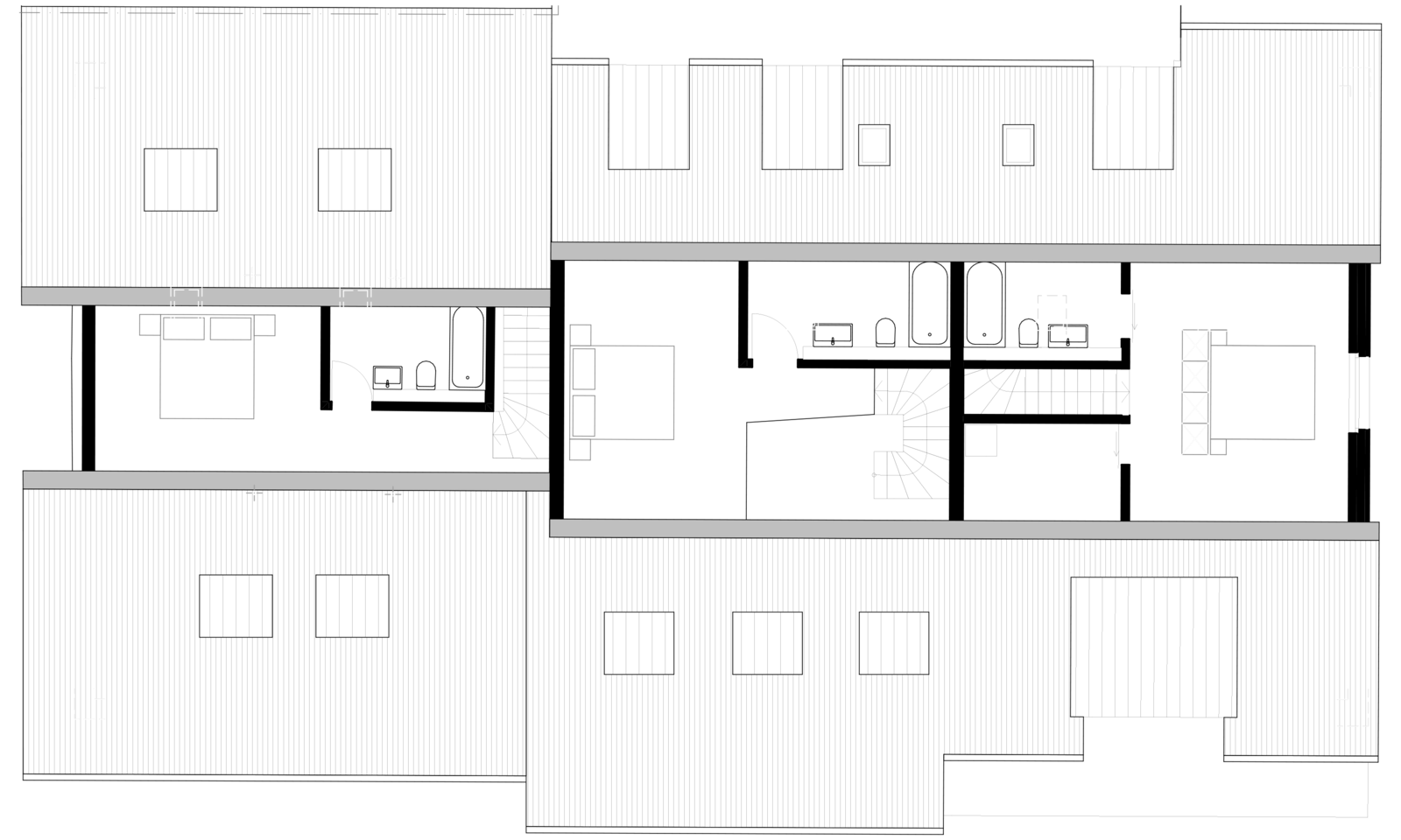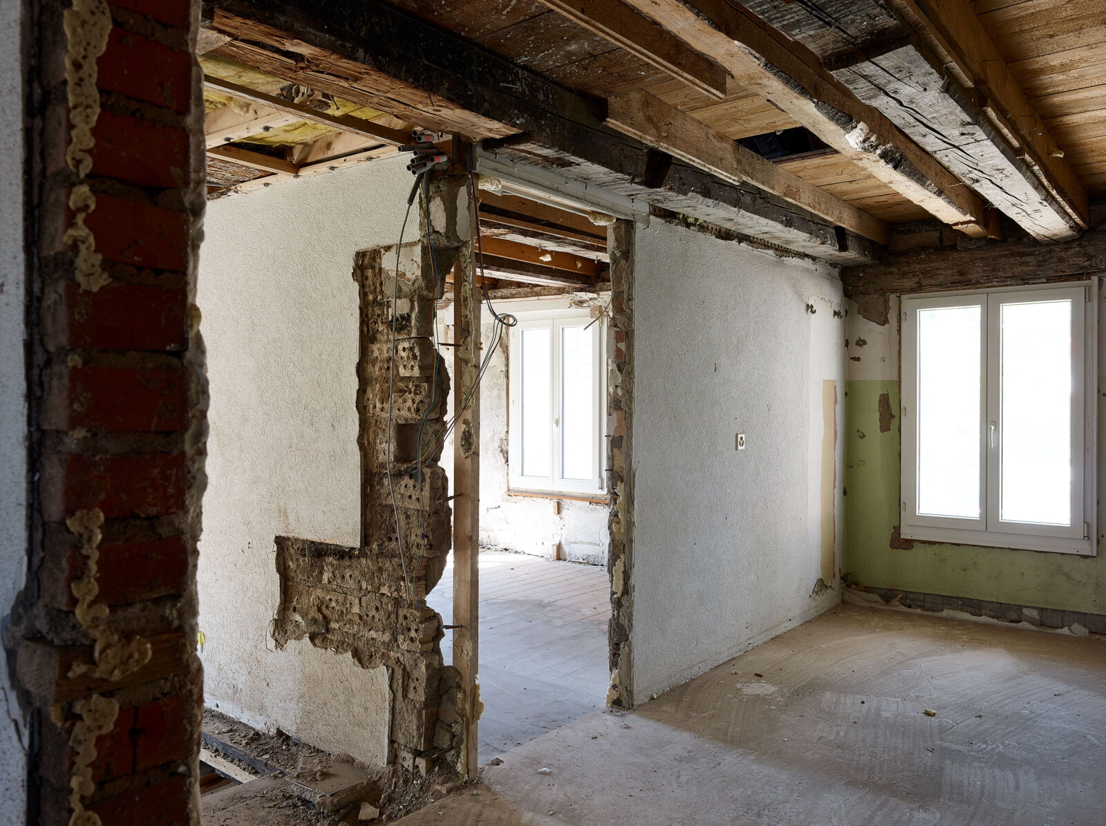 Der Bestandsbau wird sorgfältig umgebaut, wobei der bestehenden Stützenlage im Keller und der Balkenlage im Dachgeschoss grosse Beachtung geschenkt wird, um die statischen Herausforderungen zu meistern. Der Dachstuhl soll bewohnbar gemacht und die alten Balken gezeigt werden.