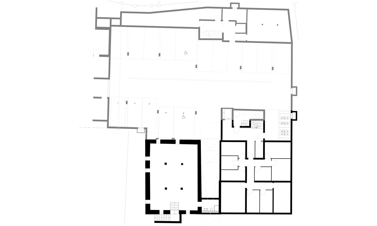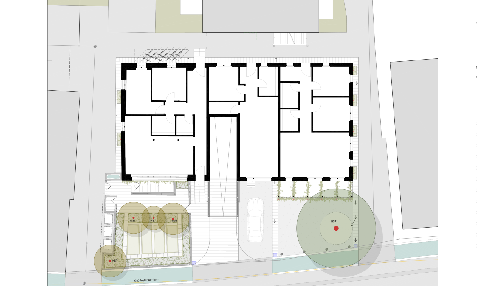 Neben den denkmalpflegerischen Ansprüchen ist auch die Anbindung an die bereits erstellten Wohngebäude im hinteren Teil ein wichtiger Faktor, da der Ersatzneubau die Treppen- und Liftanlage mit dem benachbarten Gebäude teilt.