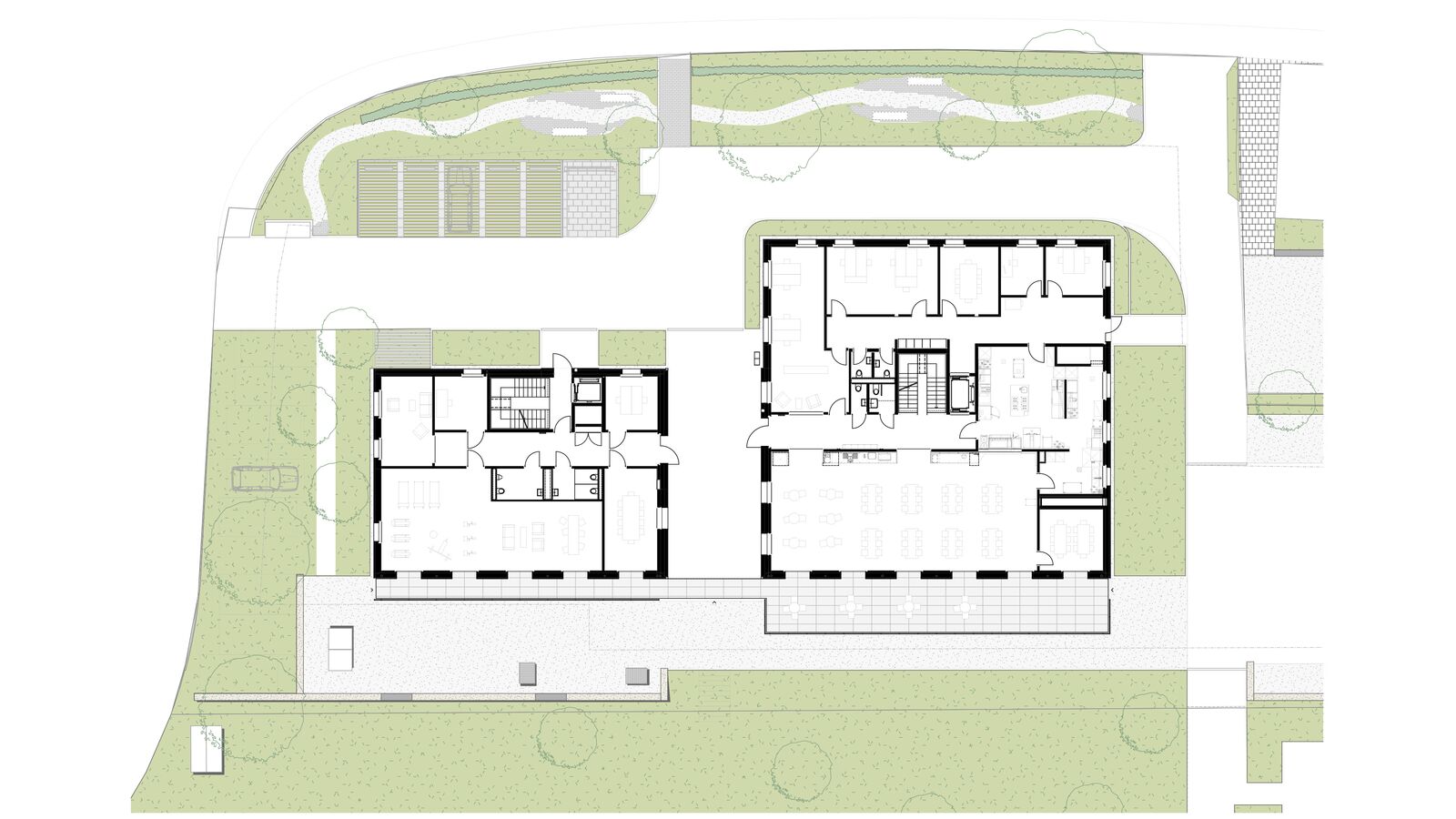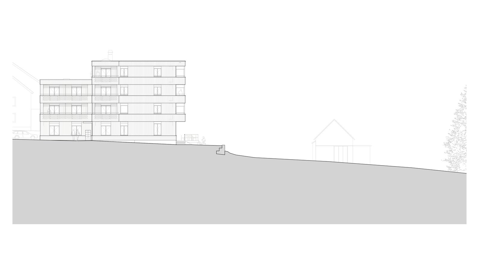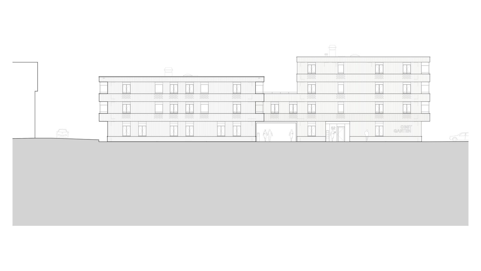 Der Ersatzneubau vereint das vielseitige Raumprogramm und passt sich den verschiedenen Massstäben des Kontextes an. Zwei rechteckige Gebäudeeinheiten werden im 1. Obergeschoss zu einem Gebäude verbunden, während im Erdgeschoss ein grosszügiger Durchgang frei bleibt. Ein zusammenhängendes Gebäude bringt aus betrieblicher Sicht Vorteile und ist für die vorgesehene Nutzung als Wohnheim nachvollziehbar. Das Raumprogramm ist dennoch kompakt angeordnet, dass der Baukörper einen vergleichsweisen geringen Fussabdruck aufweist. Die Volumetrie ist in der Höhe differenziert und im Grundriss versetzt und passt sich so der unmittelbaren Umgebung an.