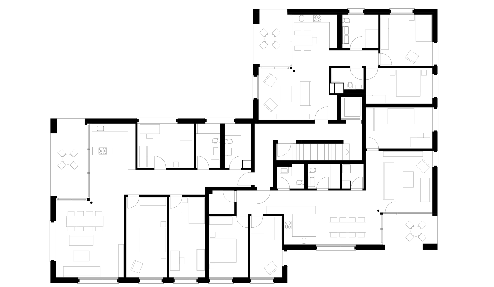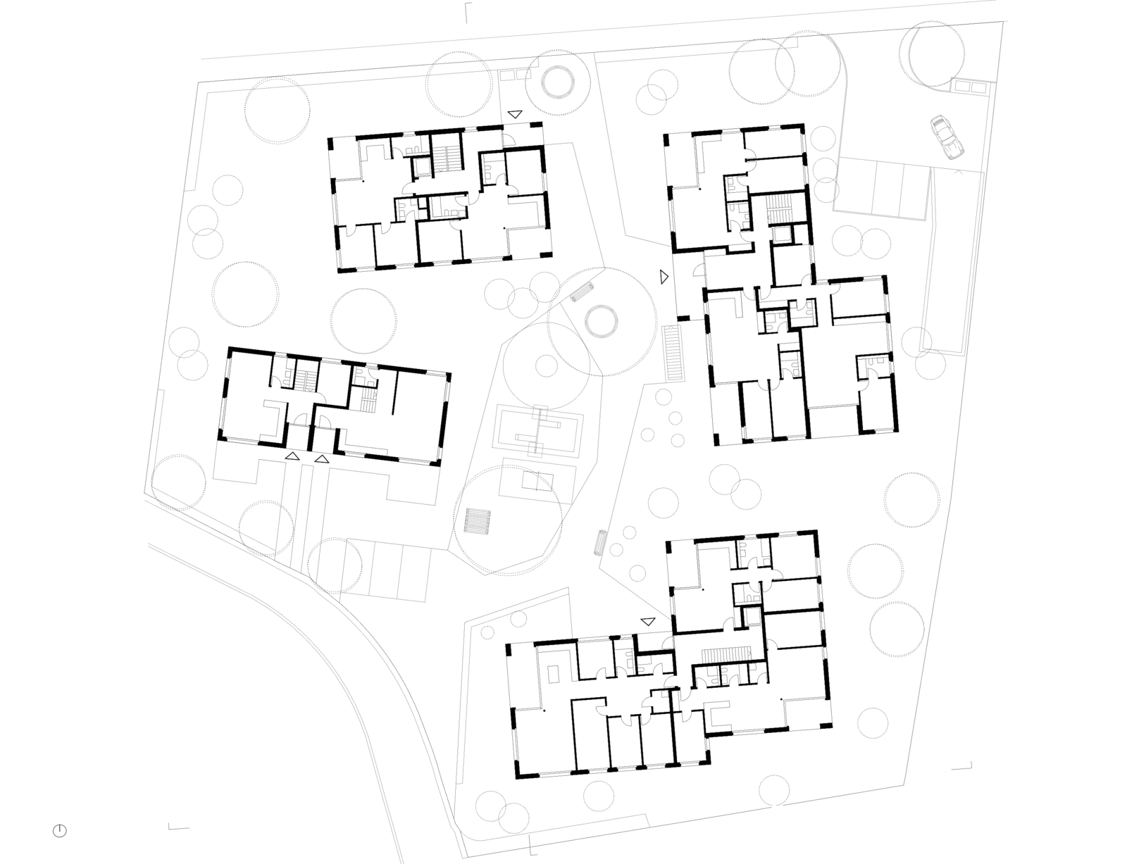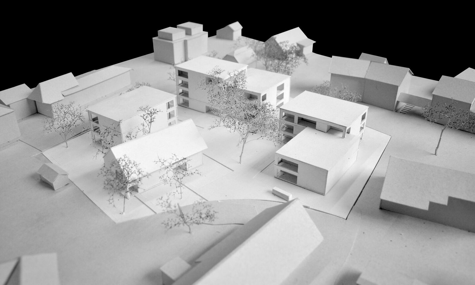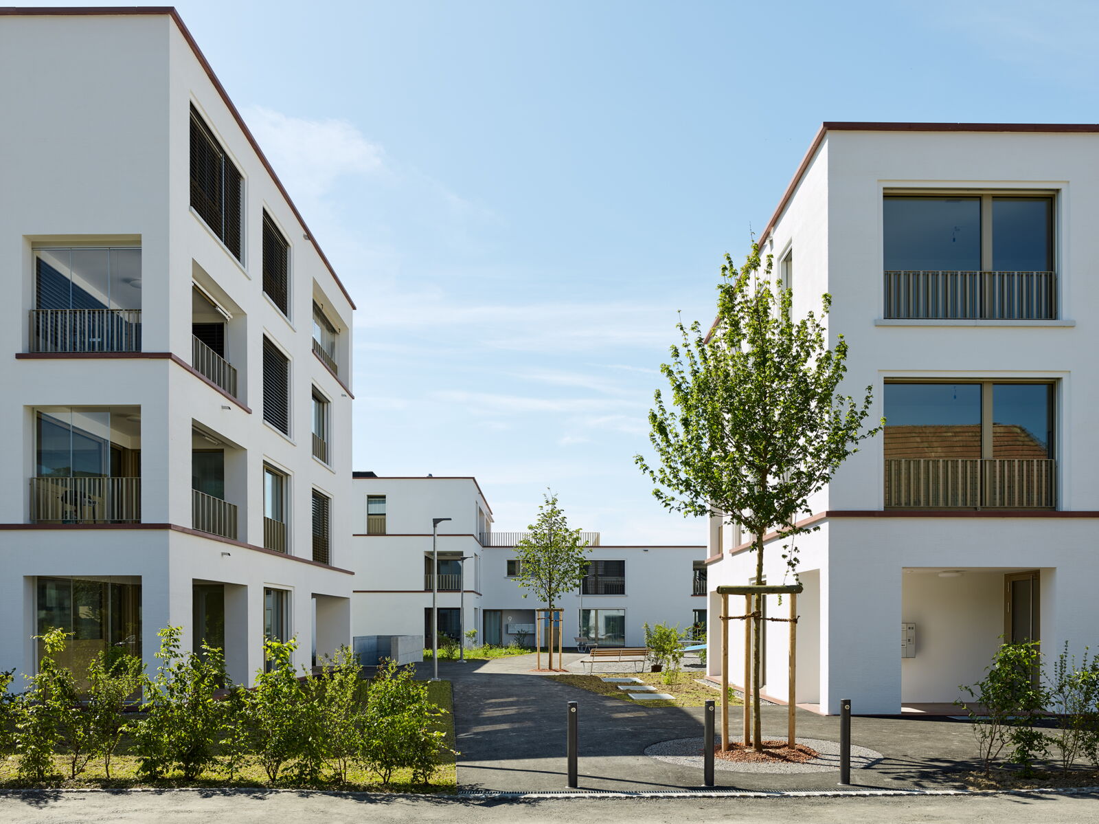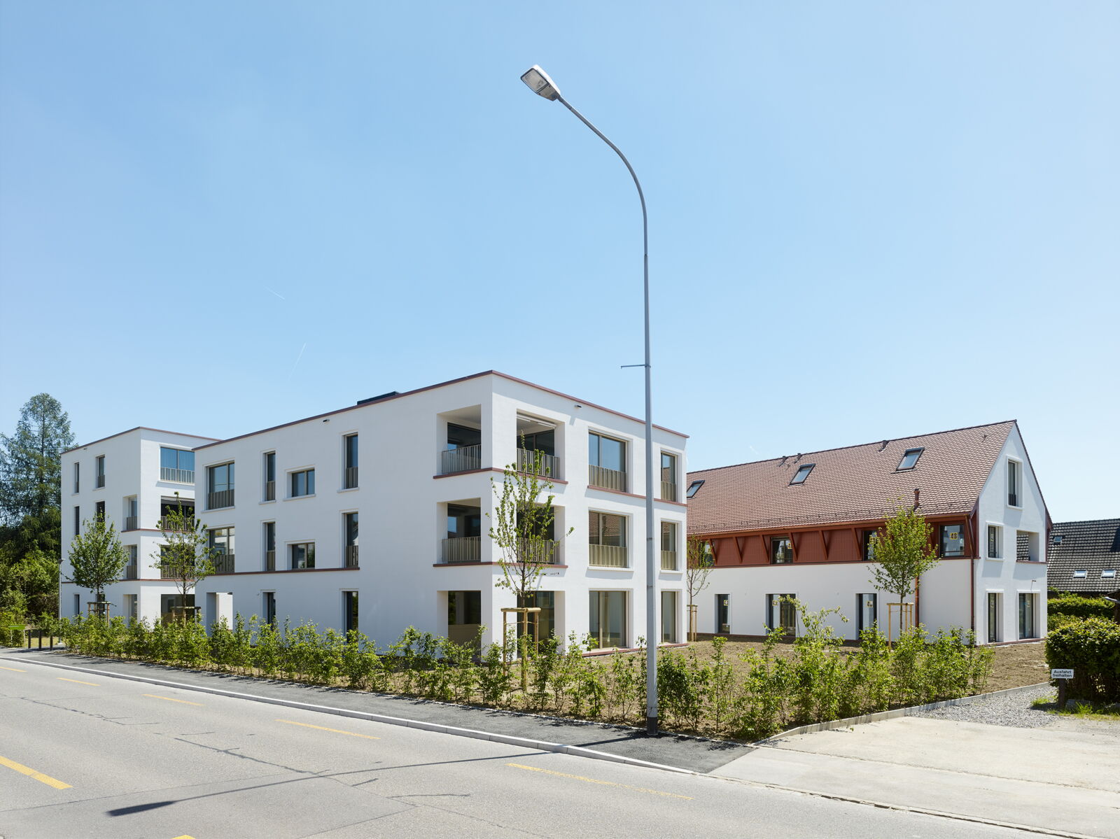 Das volumengeschützte Haus mit Steildach und die drei Mehrfamilienhäuser sind ein Ensemble mit verwandten Eigenarten, das sich in Form, Material und Oberfläche abbildet.