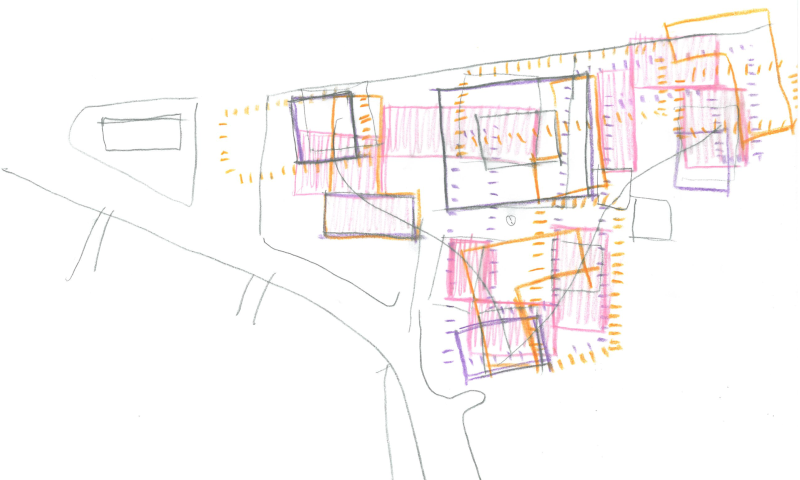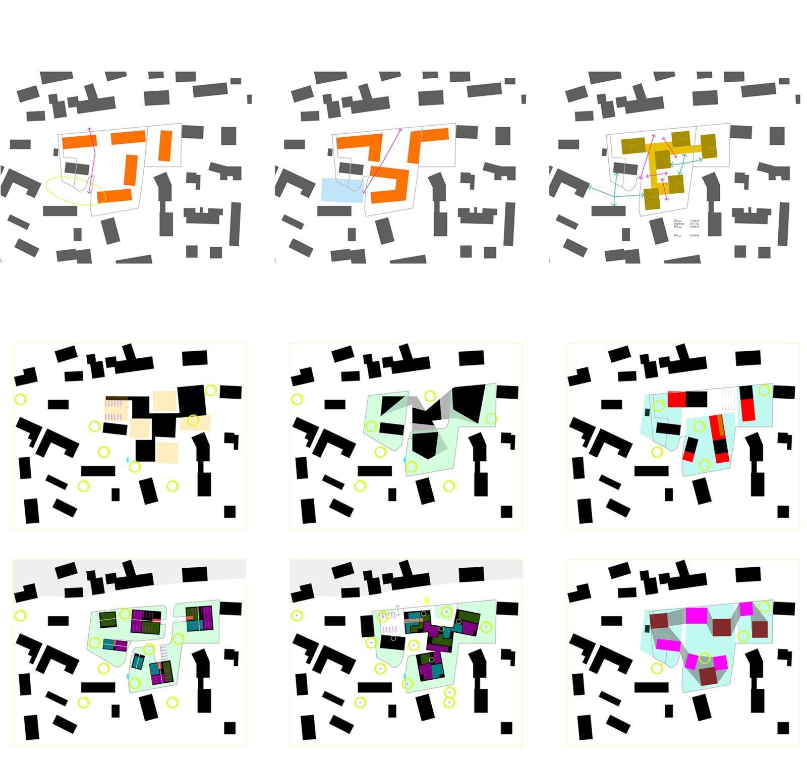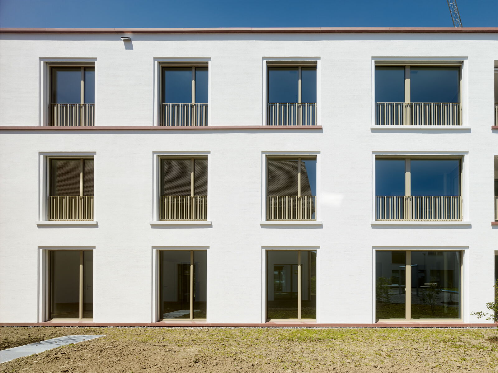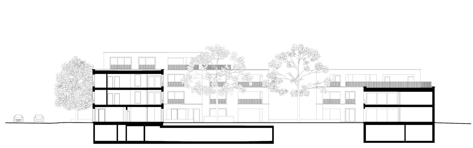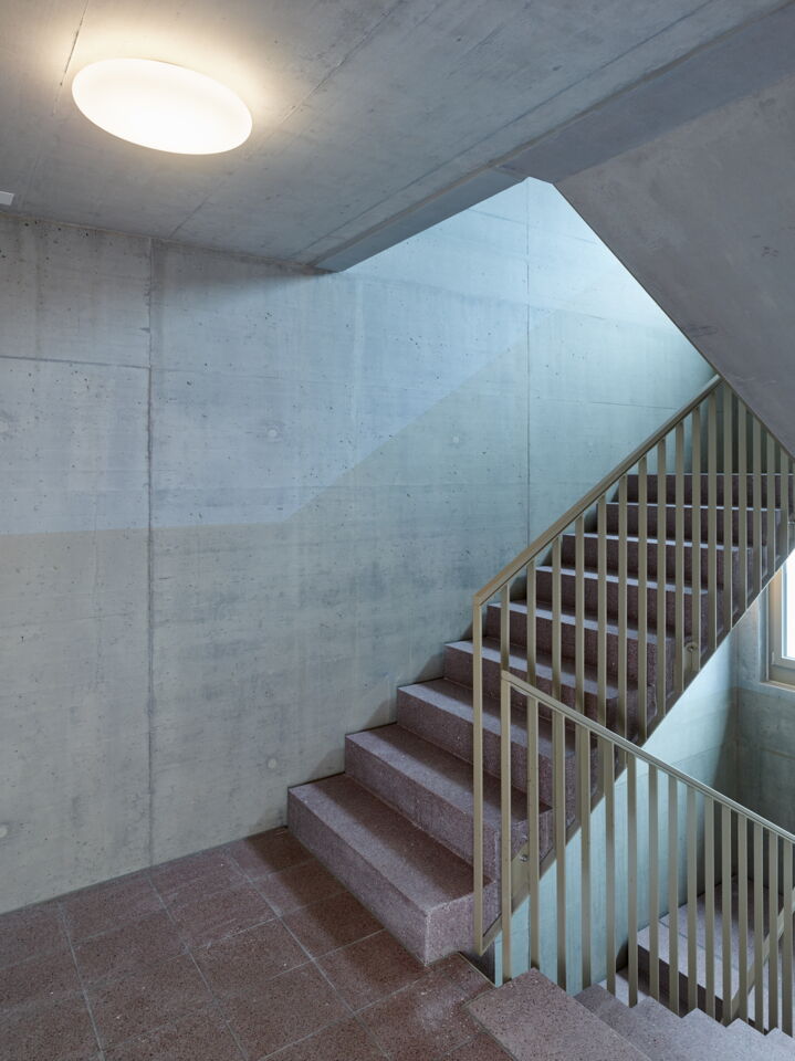 Die Volumina sind der feinkörnigen Nachbarschaft entsprechend gestaffelt und gegliedert: Attikageschosse treten als überhöhte Gebäudehälften in Erscheinung und nehmen so die Massstäblichkeit der Nachbarbauten auf.
