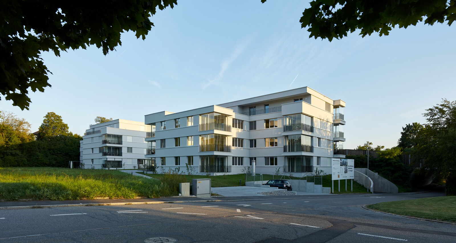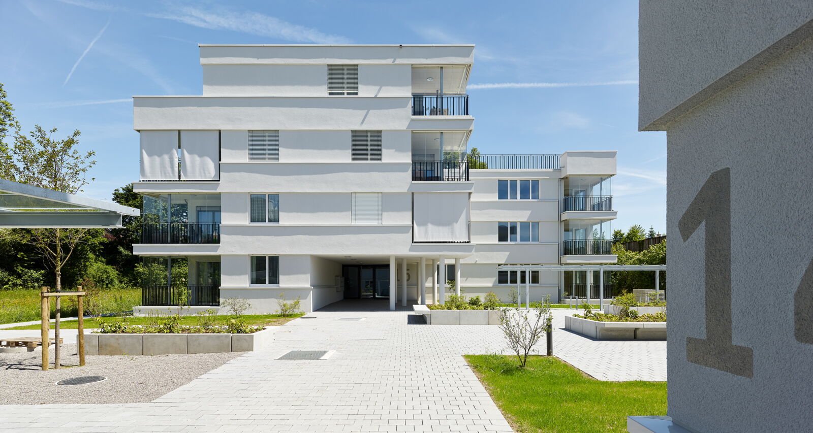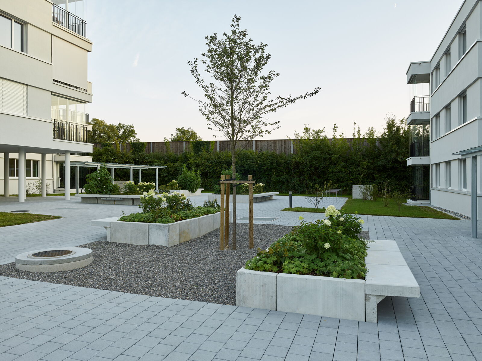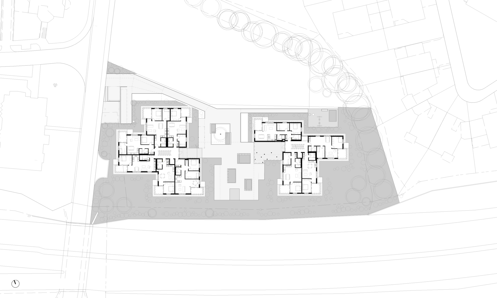 Zwei mehrflügelige Gebäude verzahnen sich mit dem fliessenden Aussenraum, der aus bestehenden und neuen Heckenkörpern sowie hohen Bäumen einen reich strukturierten Grünraum bildet. Durch die Hauptlärmexposition der Süd- und Westfassaden und die abgeschirmten Nord- und Ostfassaden, ergeben sich unterschiedlich geartete Wohnseiten. In den jeweils dreiflügelig gegliederten Geschossen werden mehrseitig orientierte, kompakte Kleinwohnungen angeboten. Die fünf- und sechsspännig organisierte Wohnungserschliessung ermöglicht eine grosszügige, teils natürlich belichtete Treppenanlage mit Geschossumgang.