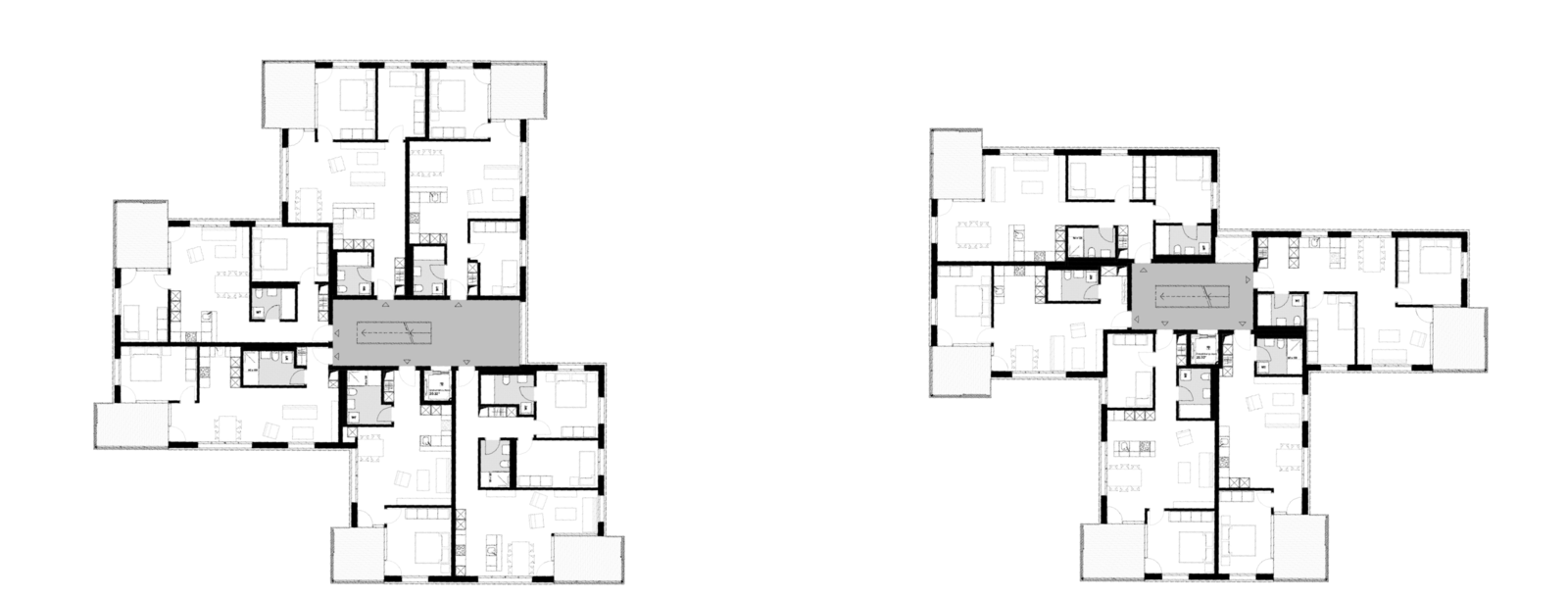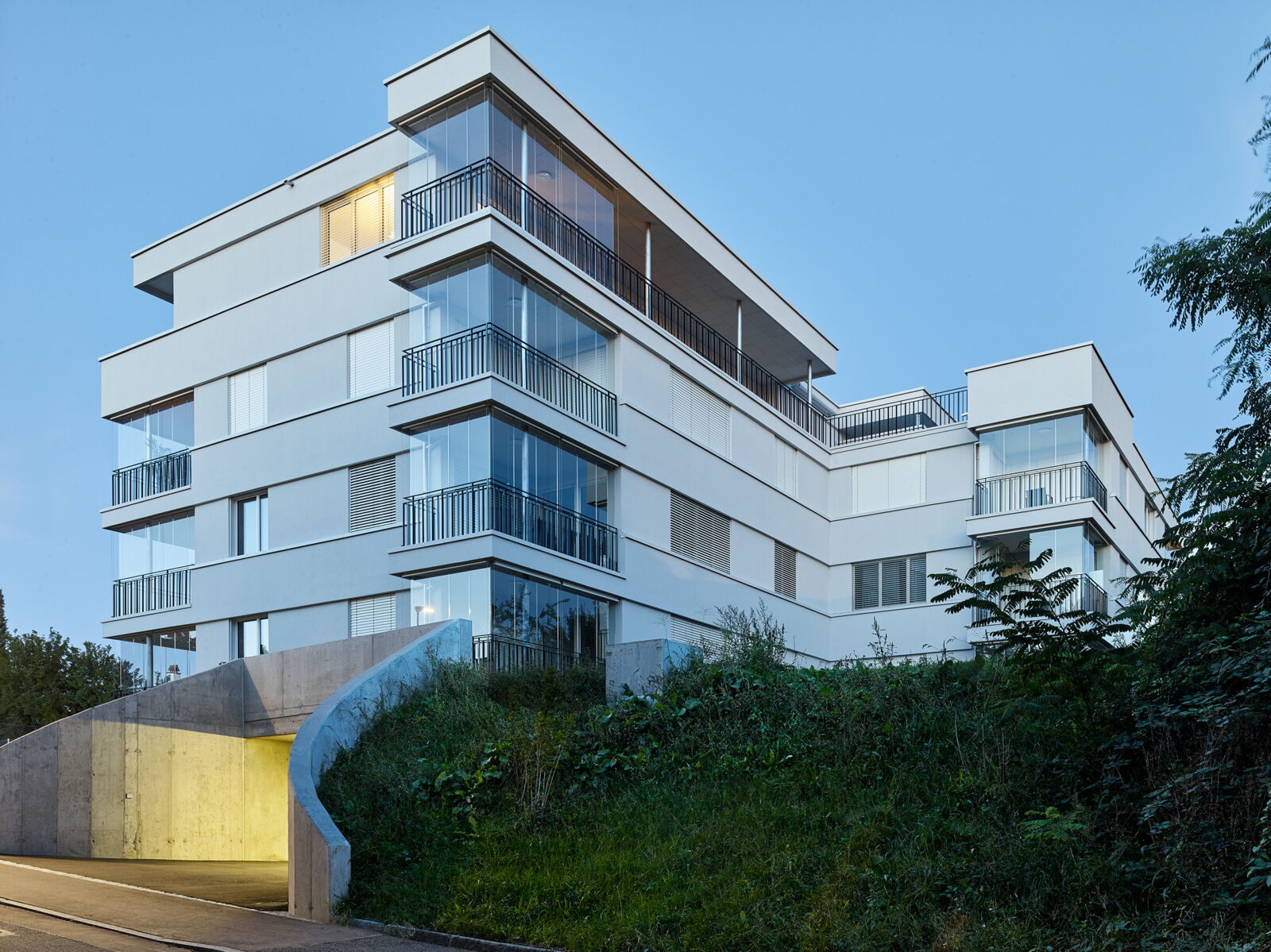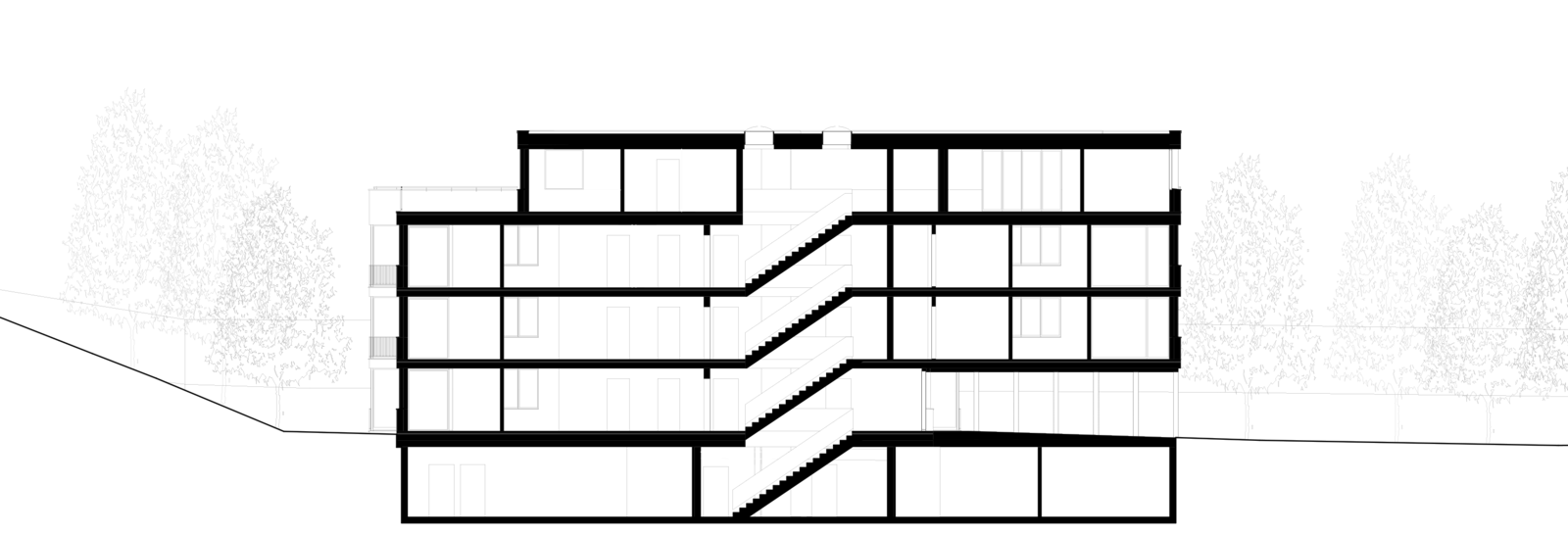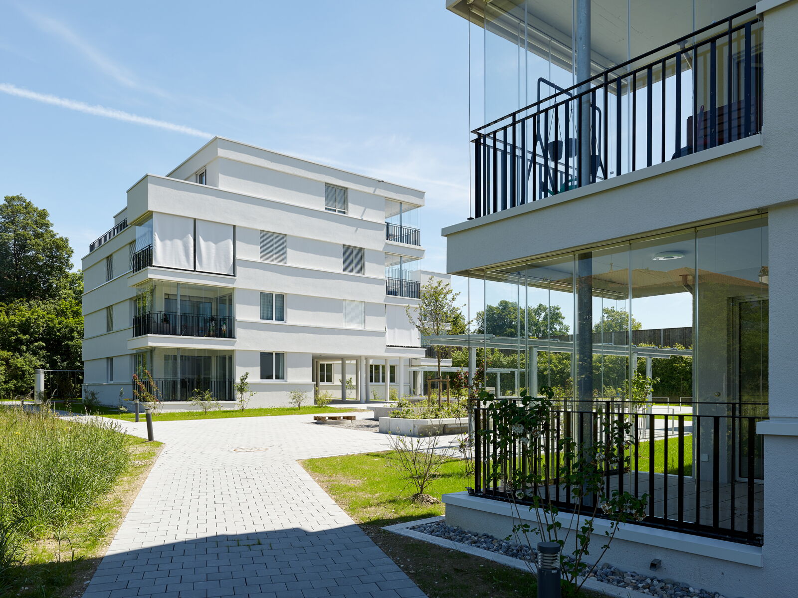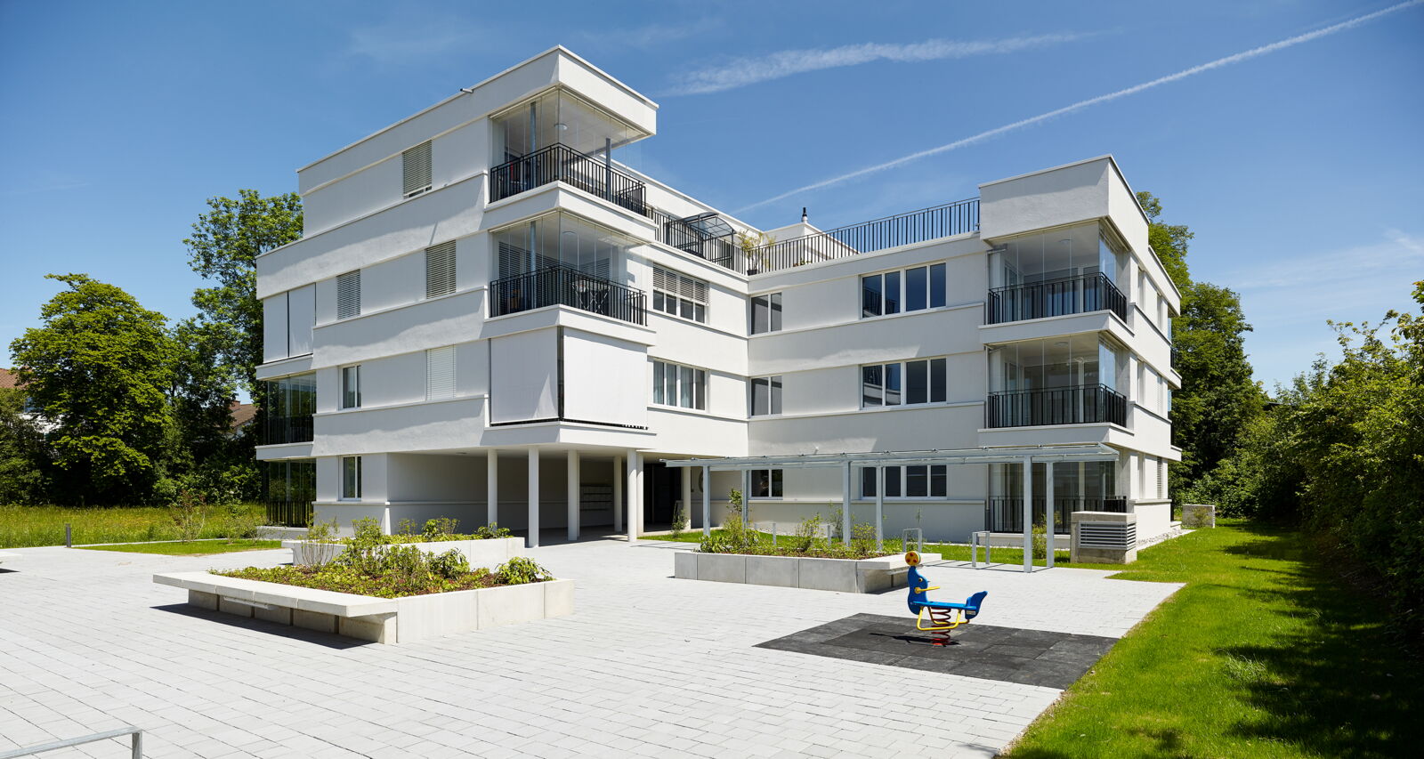 Zwei mehrflügelige Gebäude verzahnen sich mit dem fliessenden Aussenraum, der aus bestehenden und neuen Heckenkörpern sowie hohen Bäumen einen reich strukturierten Grünraum bildet. Durch die Hauptlärmexposition der Süd- und Westfassaden und die abgeschirmten Nord- und Ostfassaden, ergeben sich unterschiedlich geartete Wohnseiten. In den jeweils dreiflügelig gegliederten Geschossen werden mehrseitig orientierte, kompakte Kleinwohnungen angeboten. Die fünf- und sechsspännig organisierte Wohnungserschliessung ermöglicht eine grosszügige, teils natürlich belichtete Treppenanlage mit Geschossumgang.