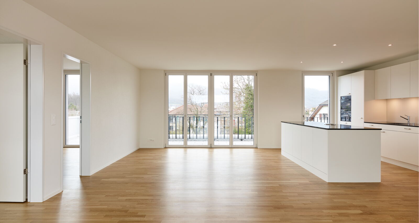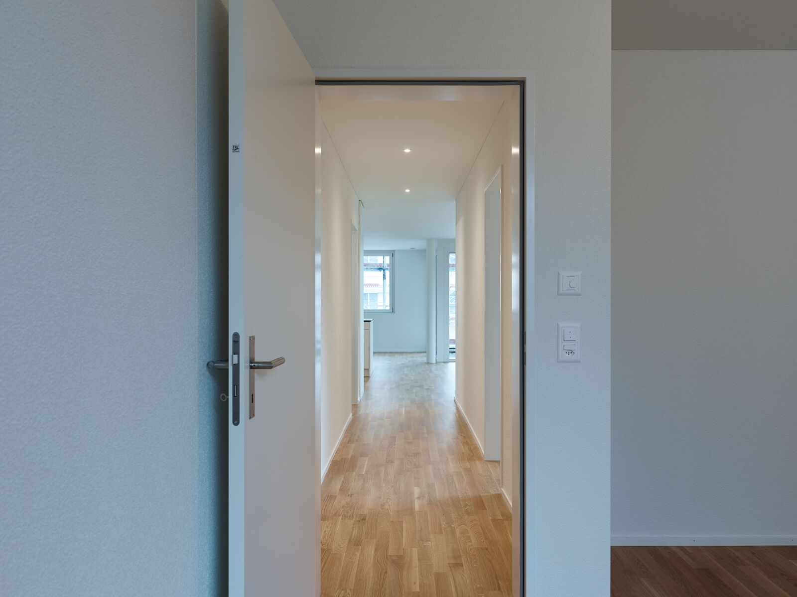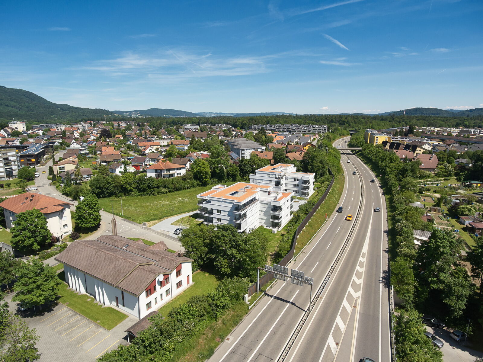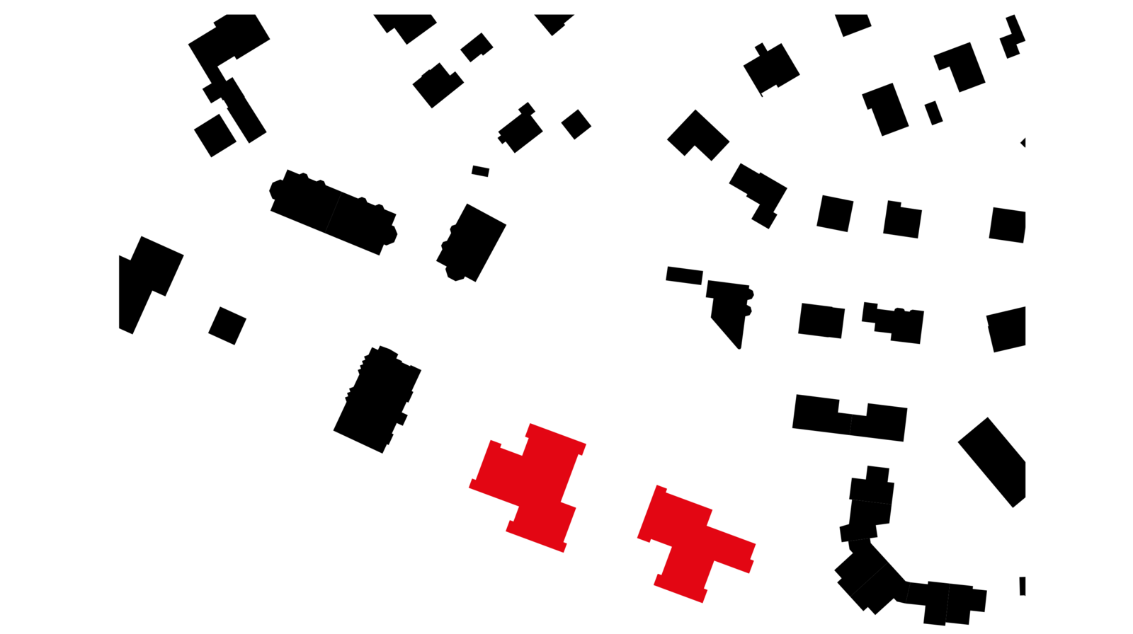 Zwei mehrflügelige Gebäude verzahnen sich mit dem fliessenden Aussenraum, der aus bestehenden und neuen Heckenkörpern sowie hohen Bäumen einen reich strukturierten Grünraum bildet. Durch die Hauptlärmexposition der Süd- und Westfassaden und die abgeschirmten Nord- und Ostfassaden, ergeben sich unterschiedlich geartete Wohnseiten. In den jeweils dreiflügelig gegliederten Geschossen werden mehrseitig orientierte, kompakte Kleinwohnungen angeboten. Die fünf- und sechsspännig organisierte Wohnungserschliessung ermöglicht eine grosszügige, teils natürlich belichtete Treppenanlage mit Geschossumgang.