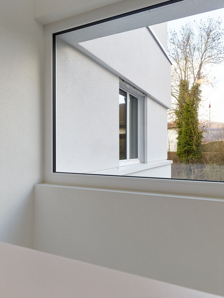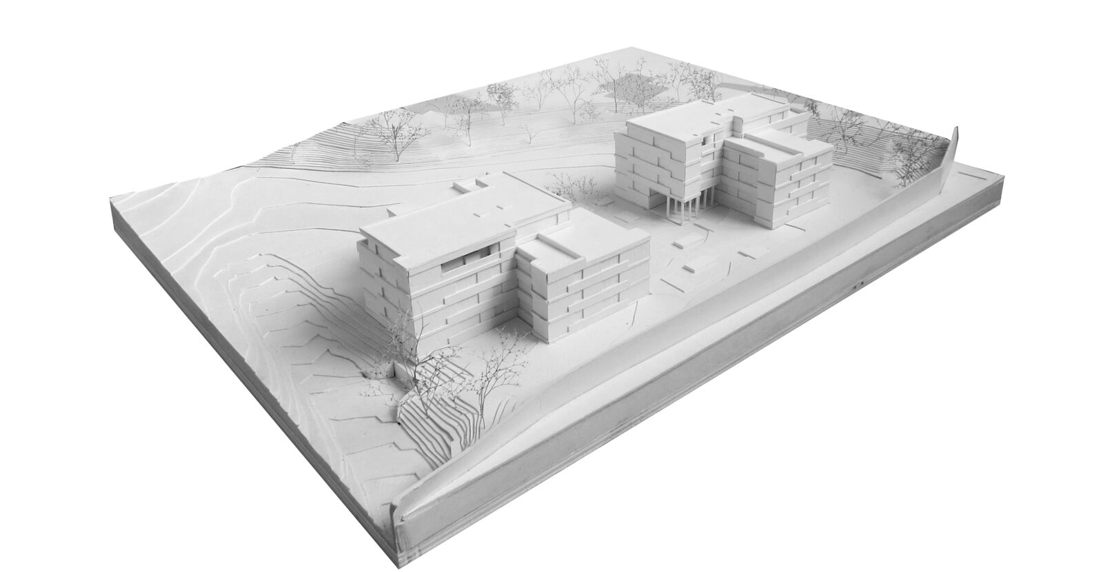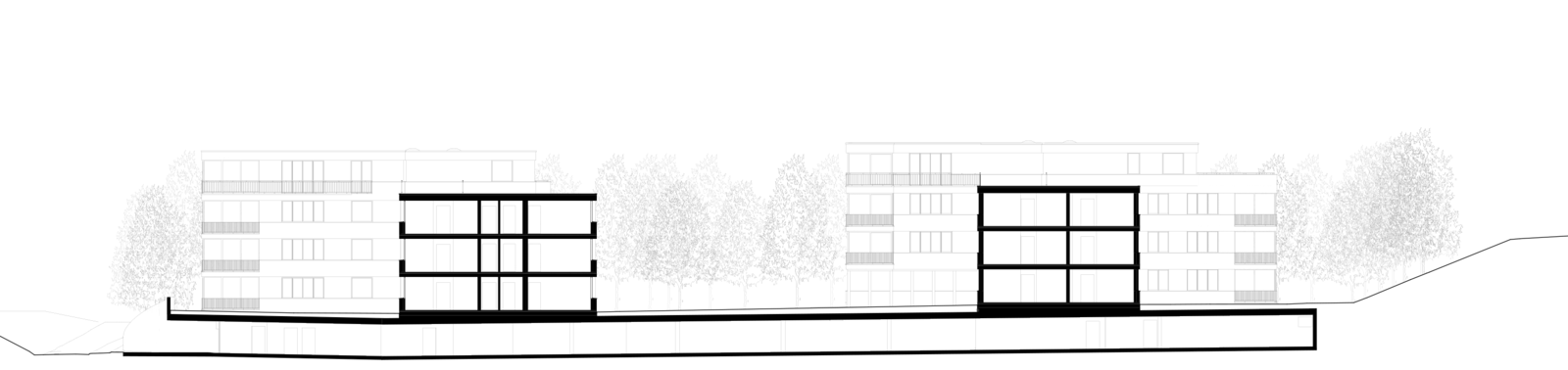 Die feingliedrig durchwirkten Gebäudekörper fügen sich durch die genannten Massnahmen sowohl in die Körnigkeit des Quartiers, wie auch in die vorhandenen Naturelemente wie Hecken und Geländeversprung ein.