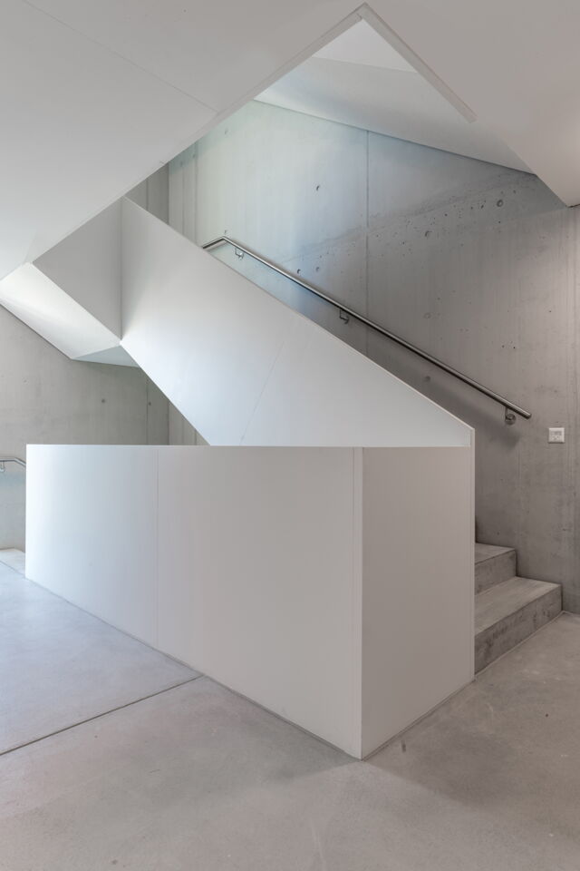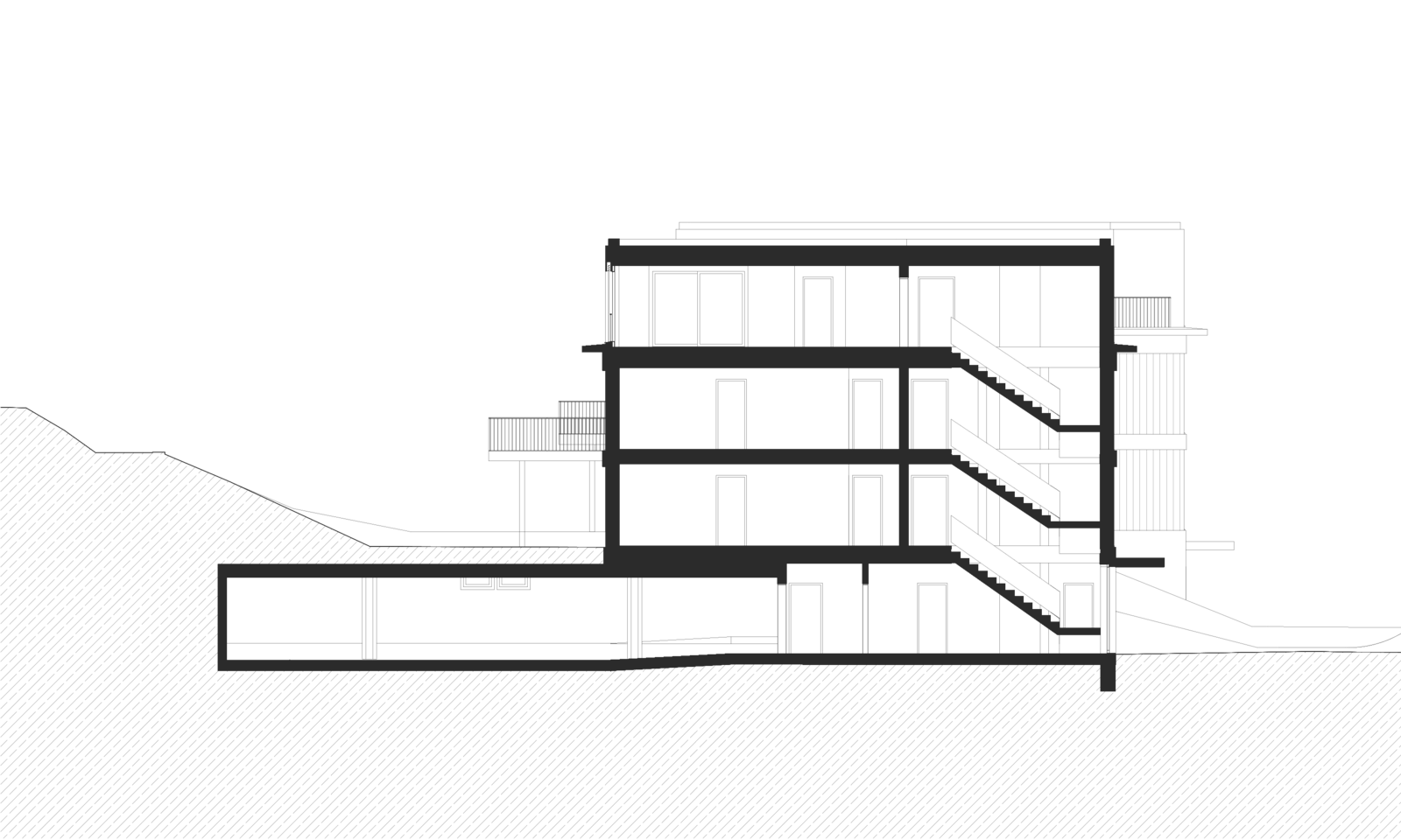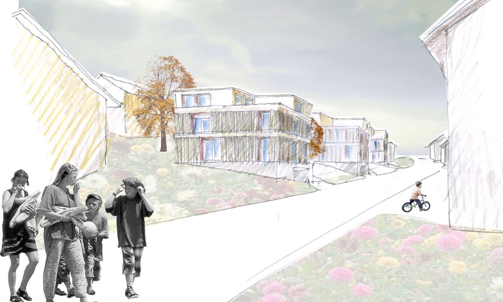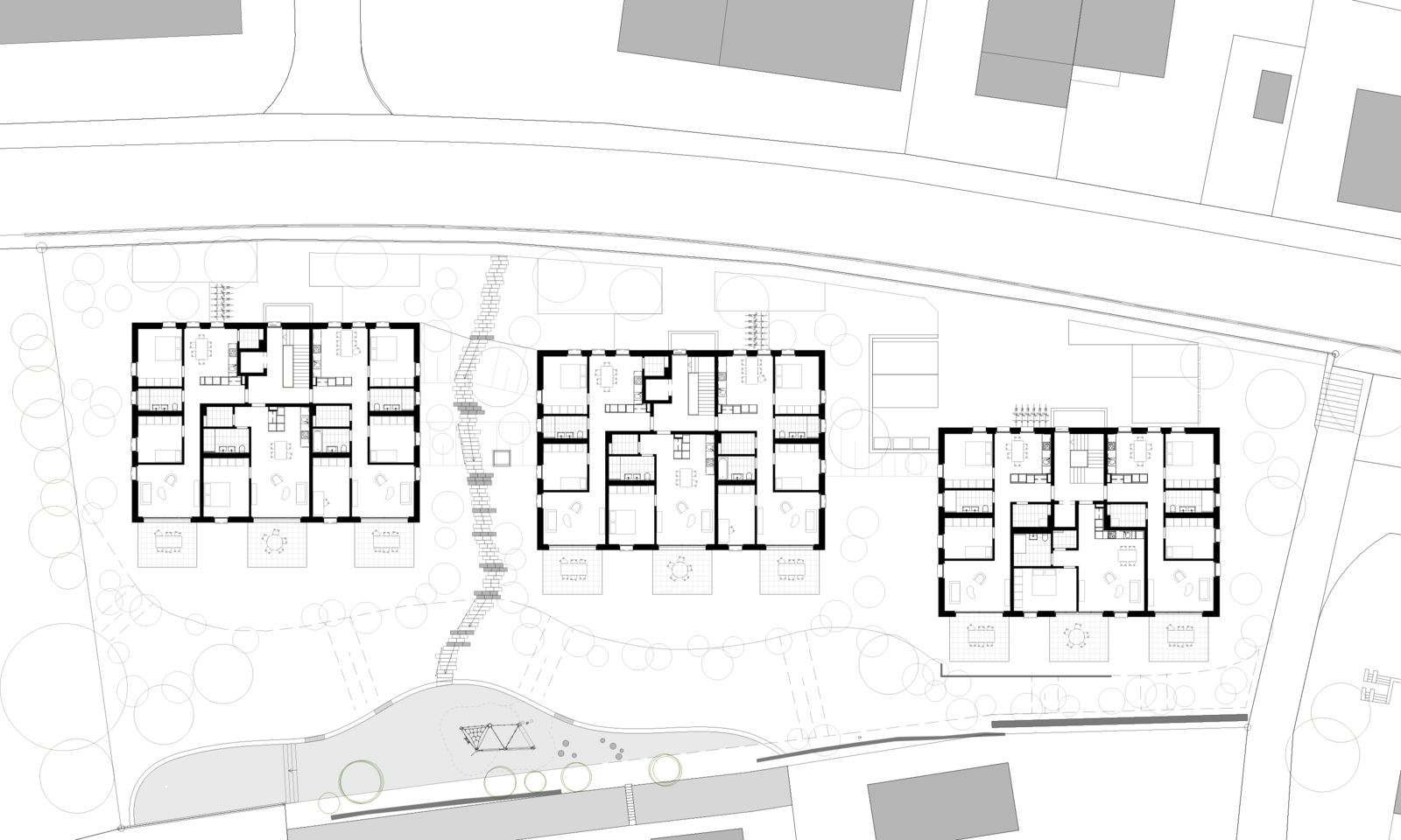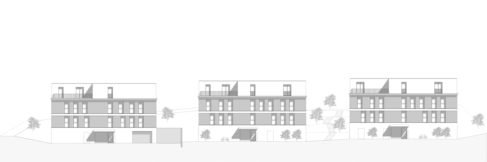 Die Volumina sitzen im Hang, dazwischen verläuft das geneigte Gelände bis zur Strasse. Um die Verbindung der einzelnen Baukörper zu unterstreichen, nehmen die der Strasse zugewandten Attikafassaden die Flucht der jeweiligen Nachbarbaute auf. Die vorspringenden Gesimse auf Höhe der Attika nehmen Bezug auf die Dachüberstände der ortskerntypischen Satteldachhäuser. Dabei wird meist traufseitig ein grösserer Überstand als giebelseitig vorgesehen. Die Gebäude werden in drei Ebenen unterteilt: Sockel- Körper- Dach. Die klassische Akzentuierung ist eine Referenz zum gewachsenen Ortsbild.
