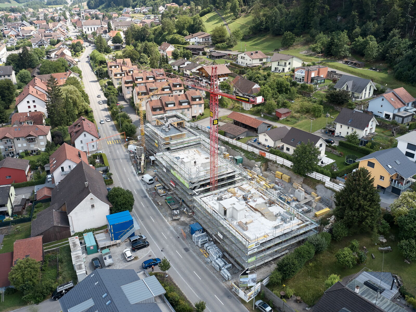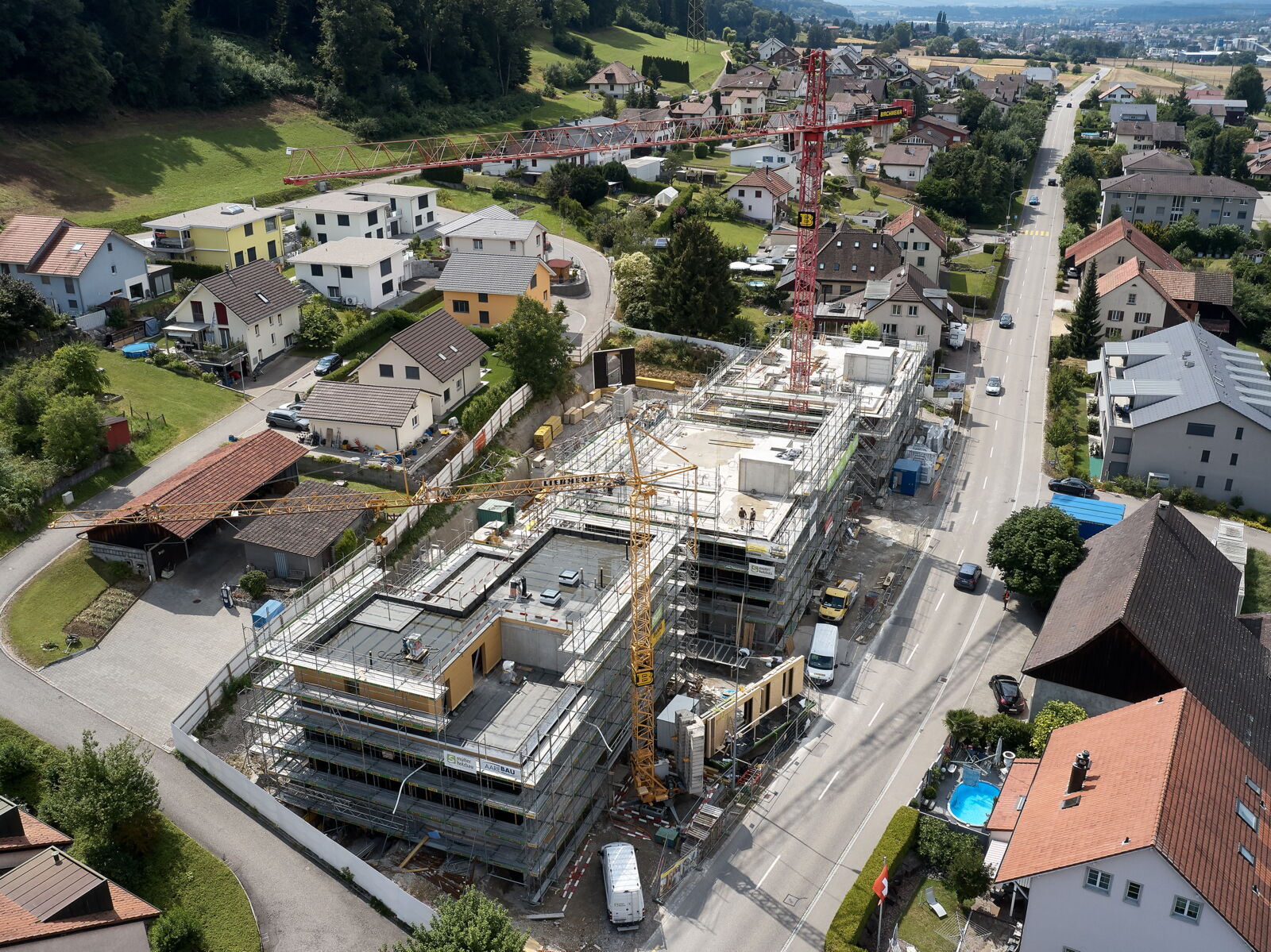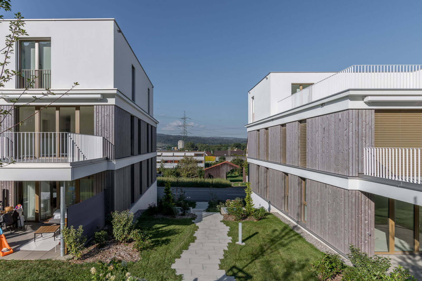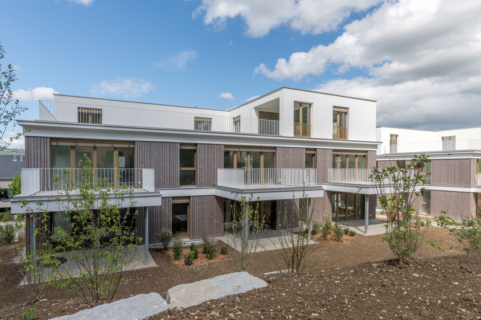 Drei zweispännig organisierte Mehrfamilienhäuser bieten Platz für insgesamt 21 Eigentumswohnungen. Die 2.5- bis 4.5-Zimmerwohnungen werden dreiseitig besonnt. Nördlich geniesst man eine Aussicht bis hin zum Schwarzwald und südlich bildet der bewaldete Hügel das optische Rückgrat.