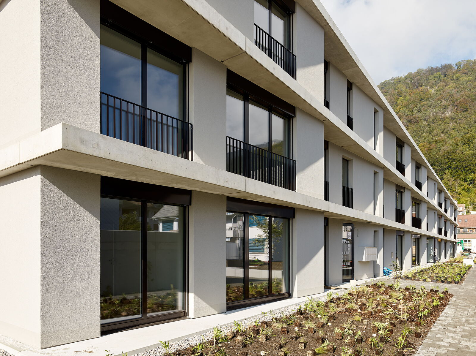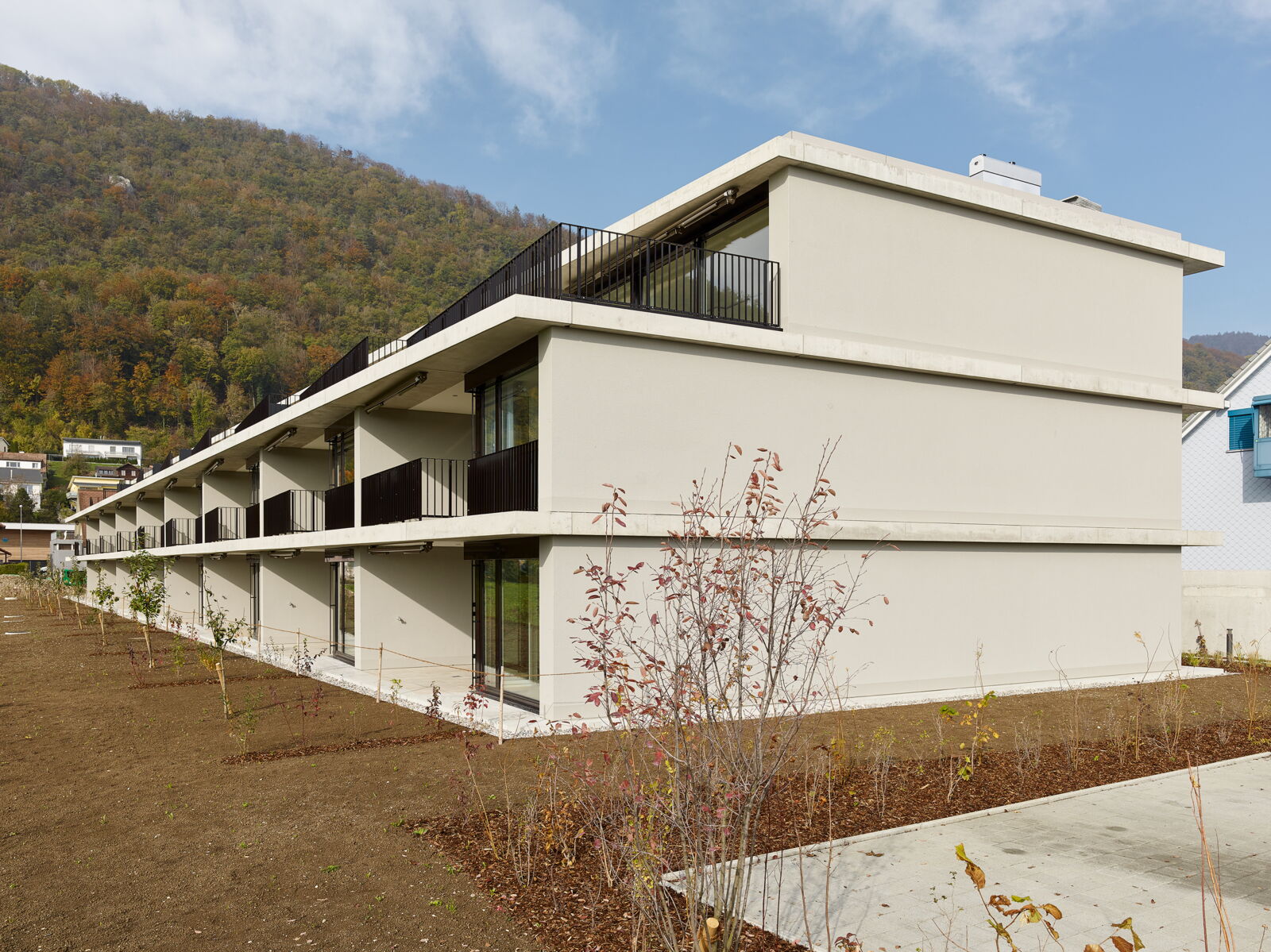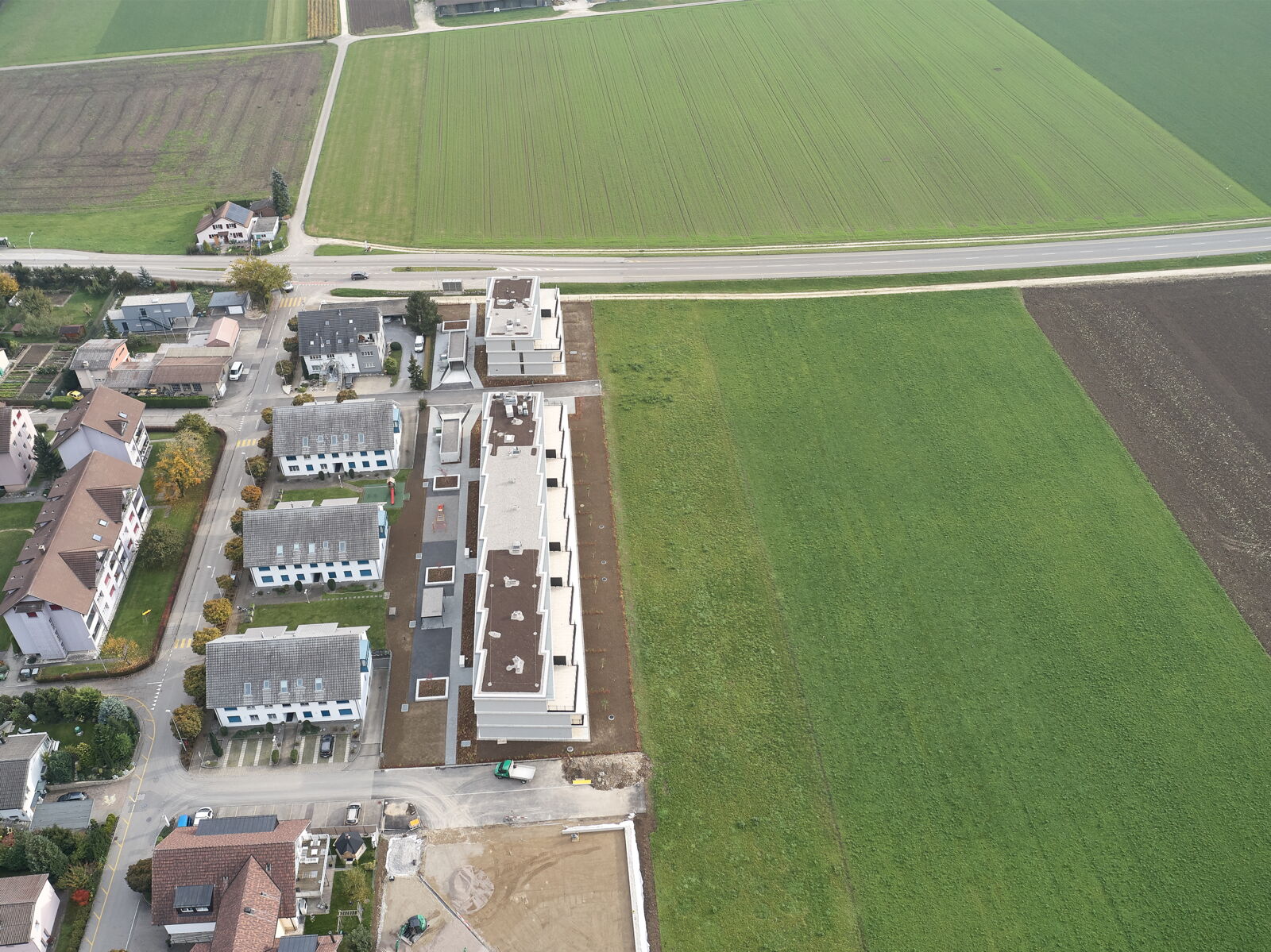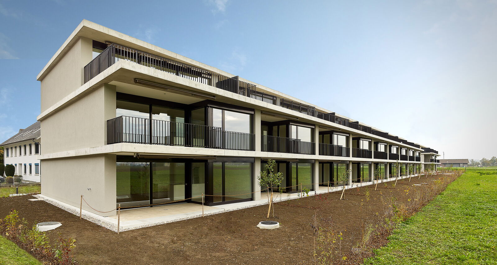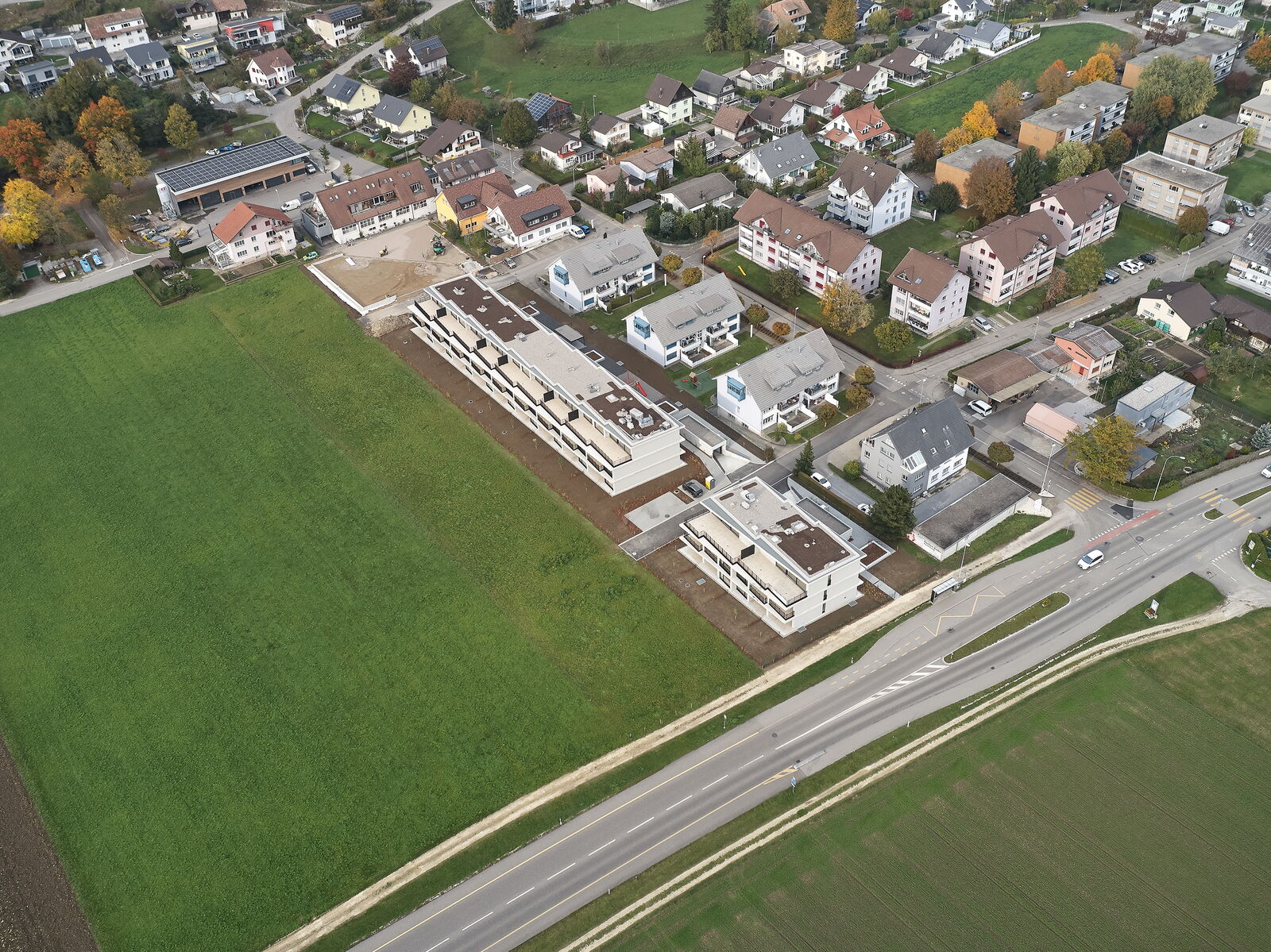 Die nach Südwesten orientierten Gebäude schliessen die gebaute Siedlungsstruktur ab und bilden einen Übergang zur angrenzenden Landwirtschaftszone.