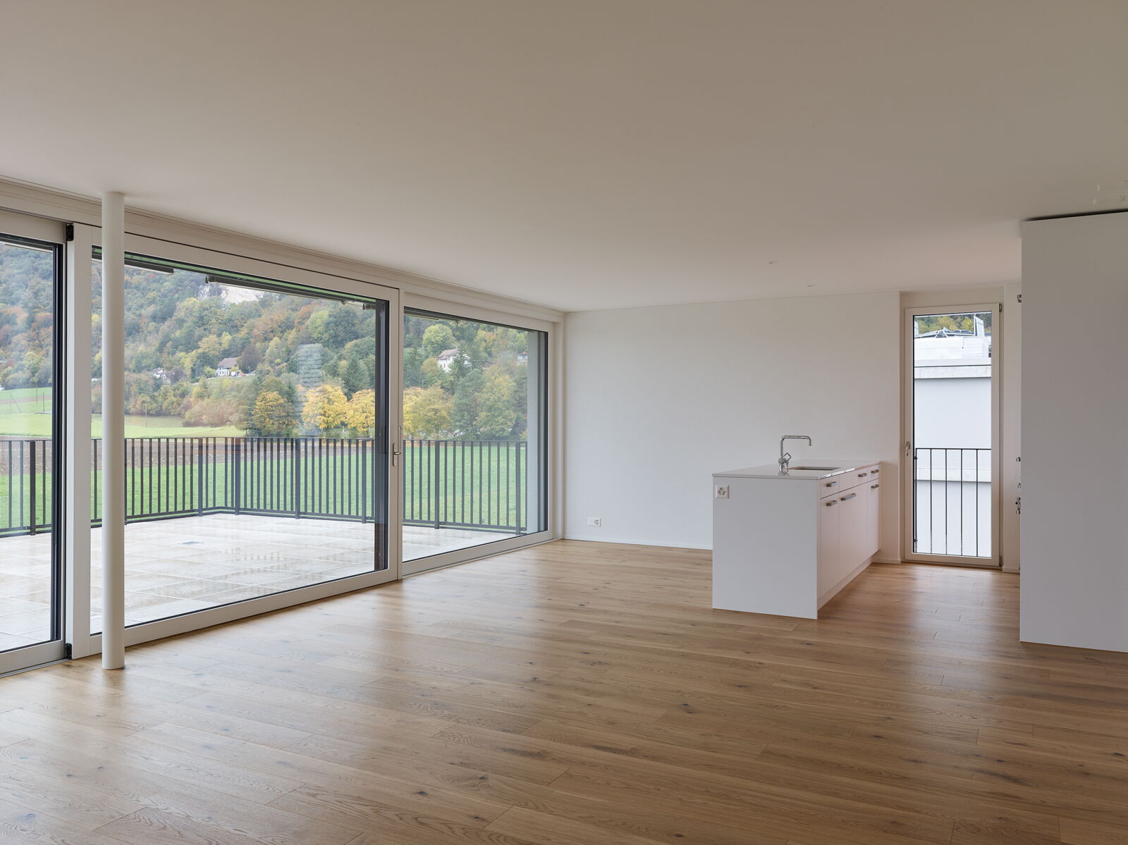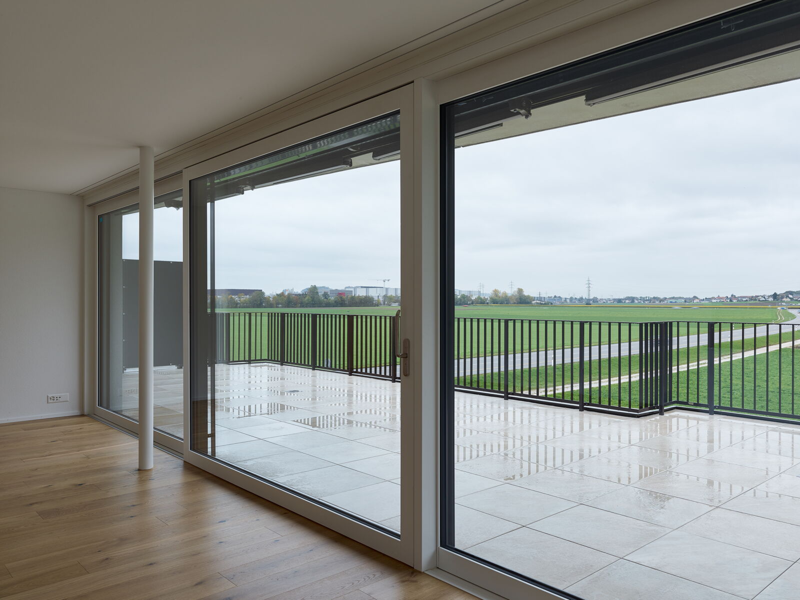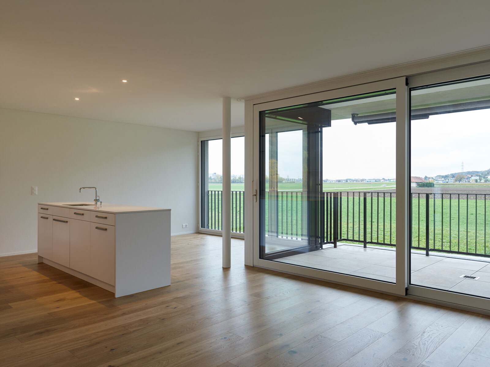 Die grosszügigen Gemeinschaftsflächen mit gedecktem Pavillon bieten den Bewohnern Raum für gemeinschaftliche Aktivitäten. Im Westen befinden sich die privaten Aussenbereiche der Erdgeschosswohnungen. Einzelne hochstämmige Bäume vermitteln zwischen den landwirtschaftlich genutzten Feldern und den Gärten der Wohnungen.