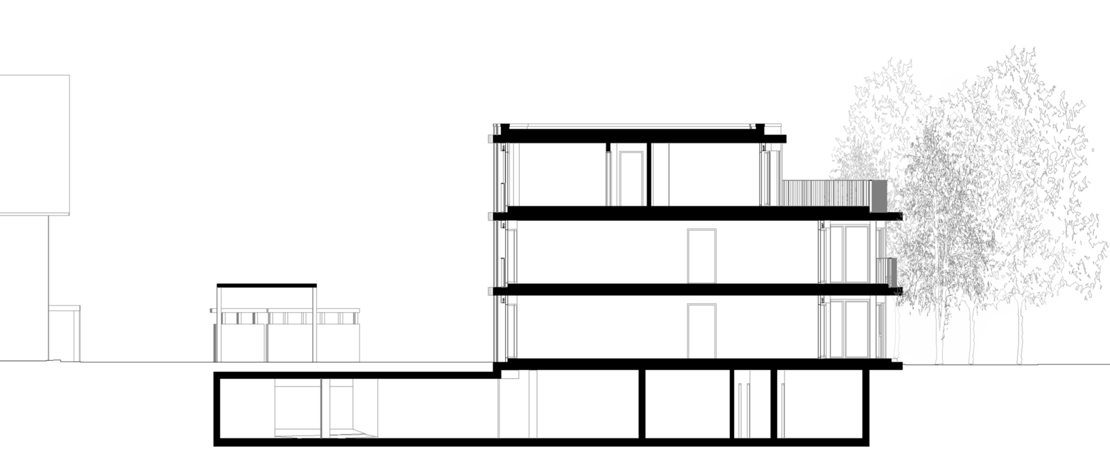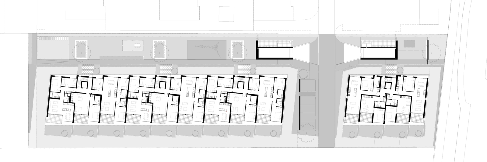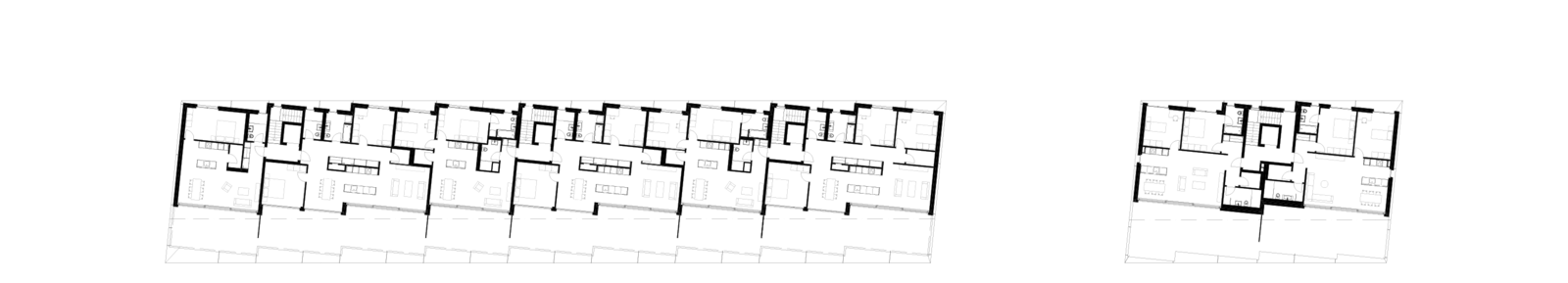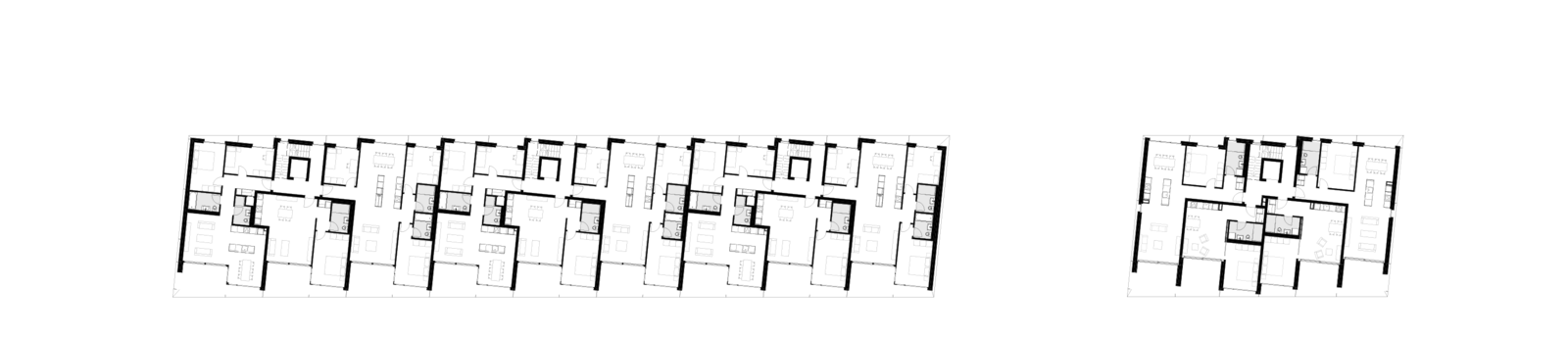 Die feinen Versätze der einzeln ablesbaren Wohneinheiten gliedern die Volumen, sorgen für Privatsphäre und generieren gleichzeitig die privaten Aussenräume.