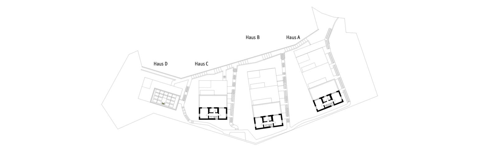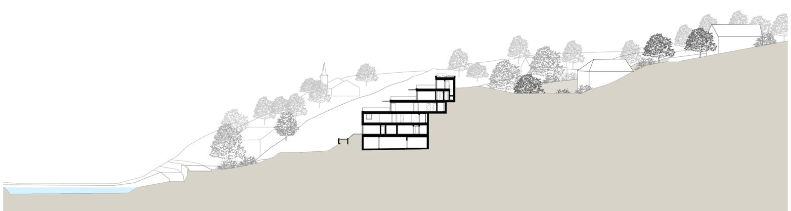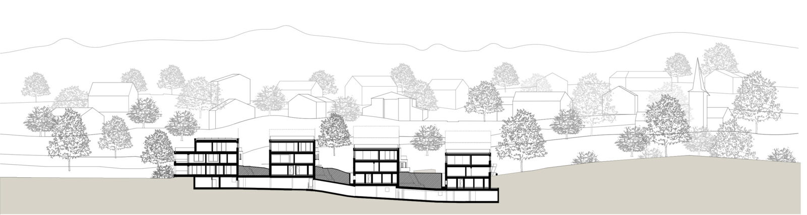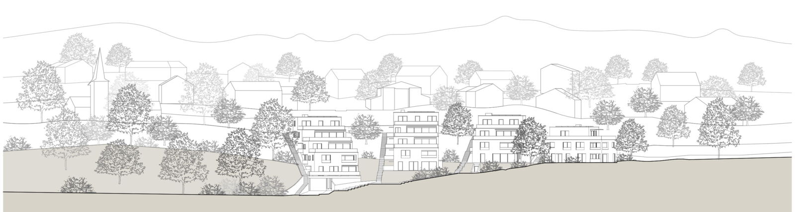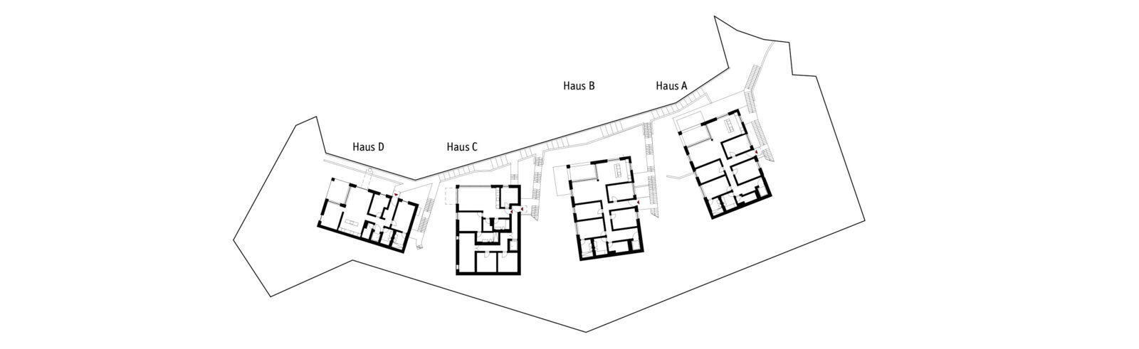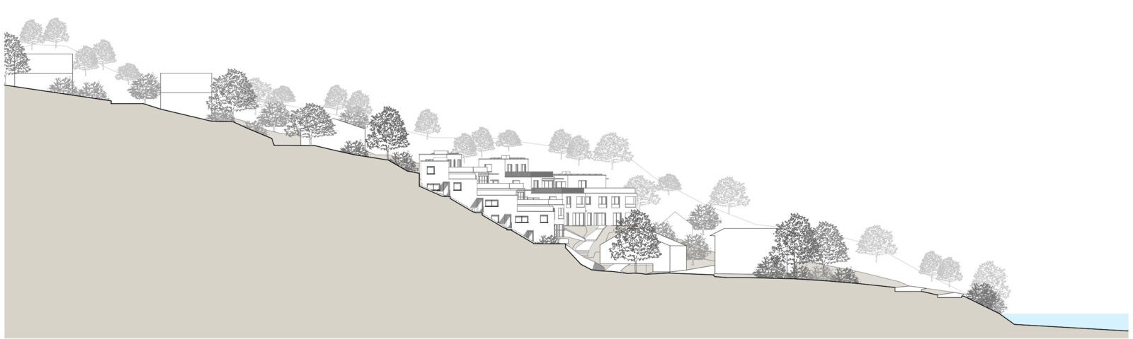 Vier schmale Baukörper werden so in den Hang gesetzt, dass die Hangsituation weiterhin gut erlebbar bleibt. Die Bauten sind abgetreppt konzipiert, so dass sie dem Hangverlauf folgen und diesen nachbilden. Mittels Abdrehung und Abstufung nutzen die Bauten die Platzverhältnisse der konischen Parzellenform optimal aus.