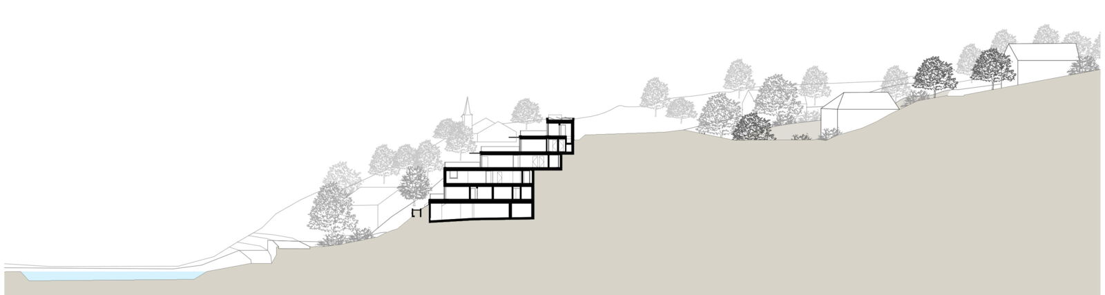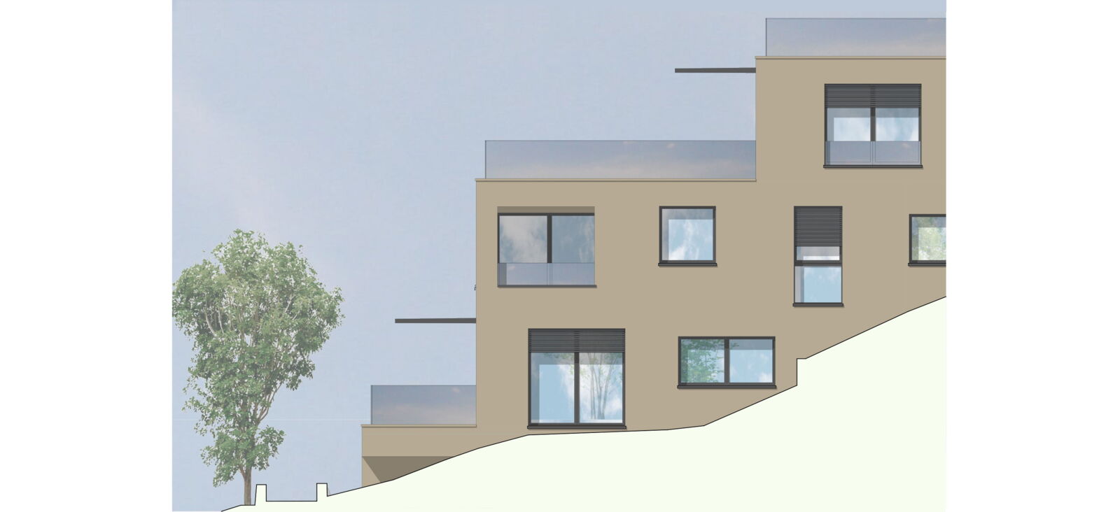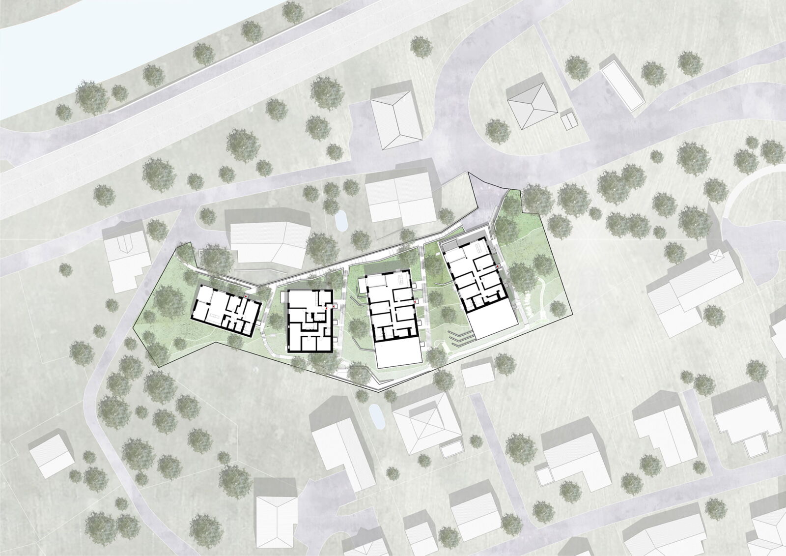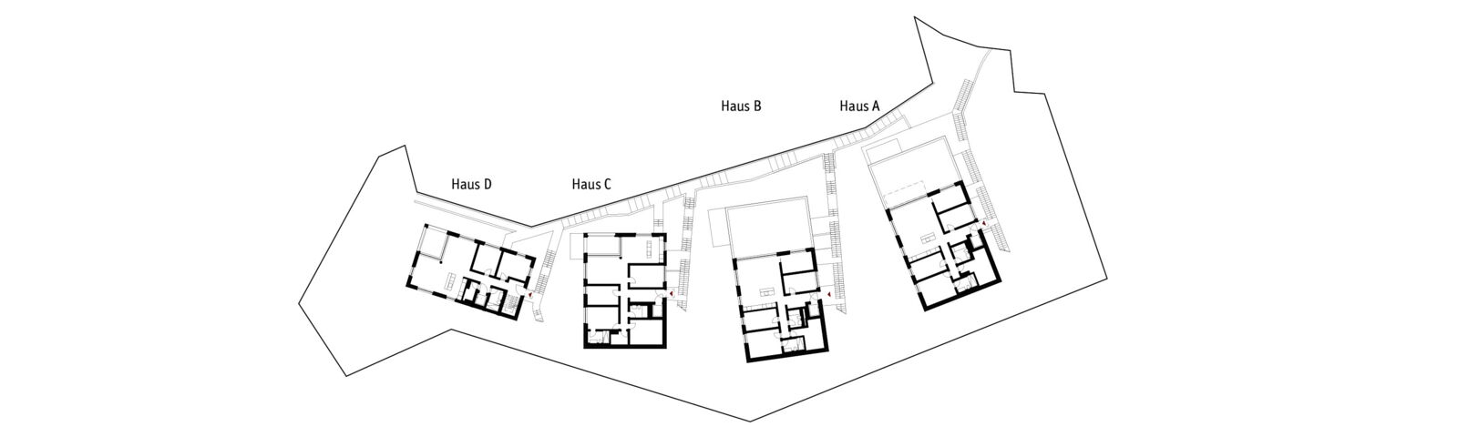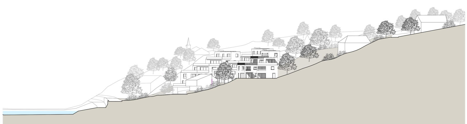 Vier schmale Baukörper werden so in den Hang gesetzt, dass die Hangsituation weiterhin gut erlebbar bleibt. Die Bauten sind abgetreppt konzipiert, so dass sie dem Hangverlauf folgen und diesen nachbilden. Mittels Abdrehung und Abstufung nutzen die Bauten die Platzverhältnisse der konischen Parzellenform optimal aus.