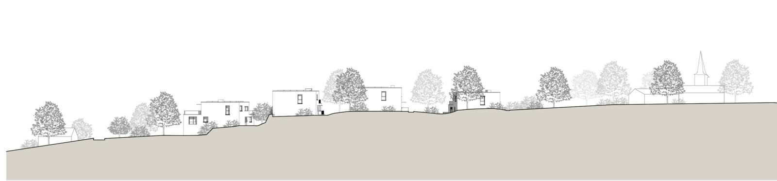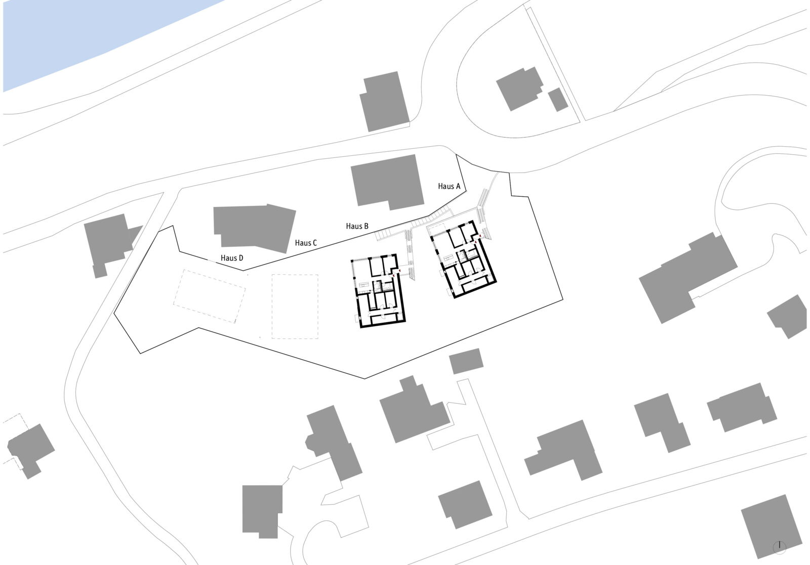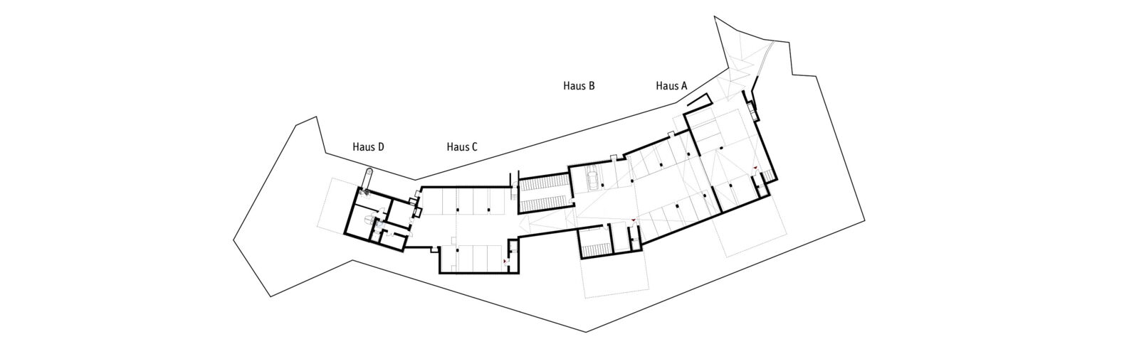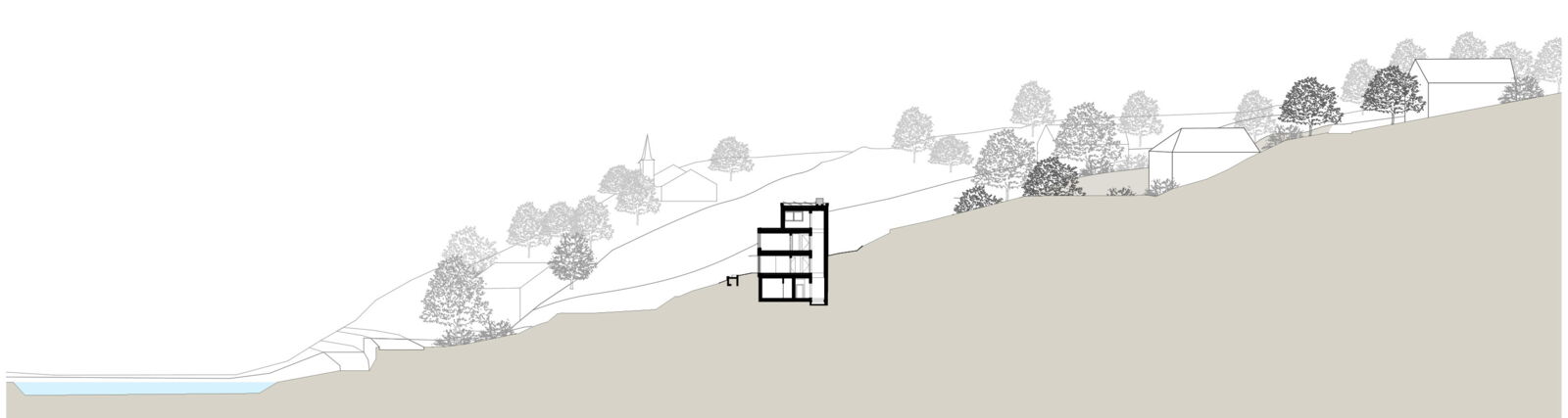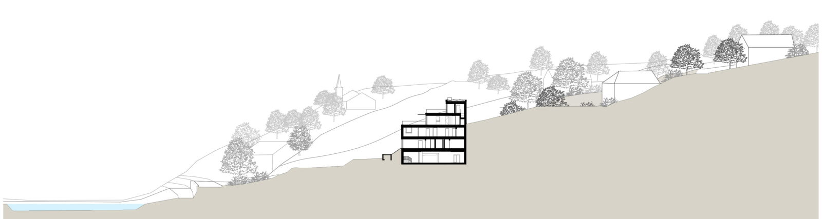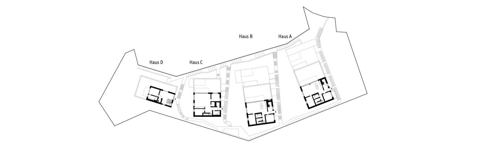 Vier schmale Baukörper werden so in den Hang gesetzt, dass die Hangsituation weiterhin gut erlebbar bleibt. Die Bauten sind abgetreppt konzipiert, so dass sie dem Hangverlauf folgen und diesen nachbilden. Mittels Abdrehung und Abstufung nutzen die Bauten die Platzverhältnisse der konischen Parzellenform optimal aus.