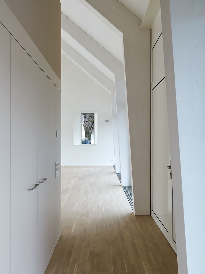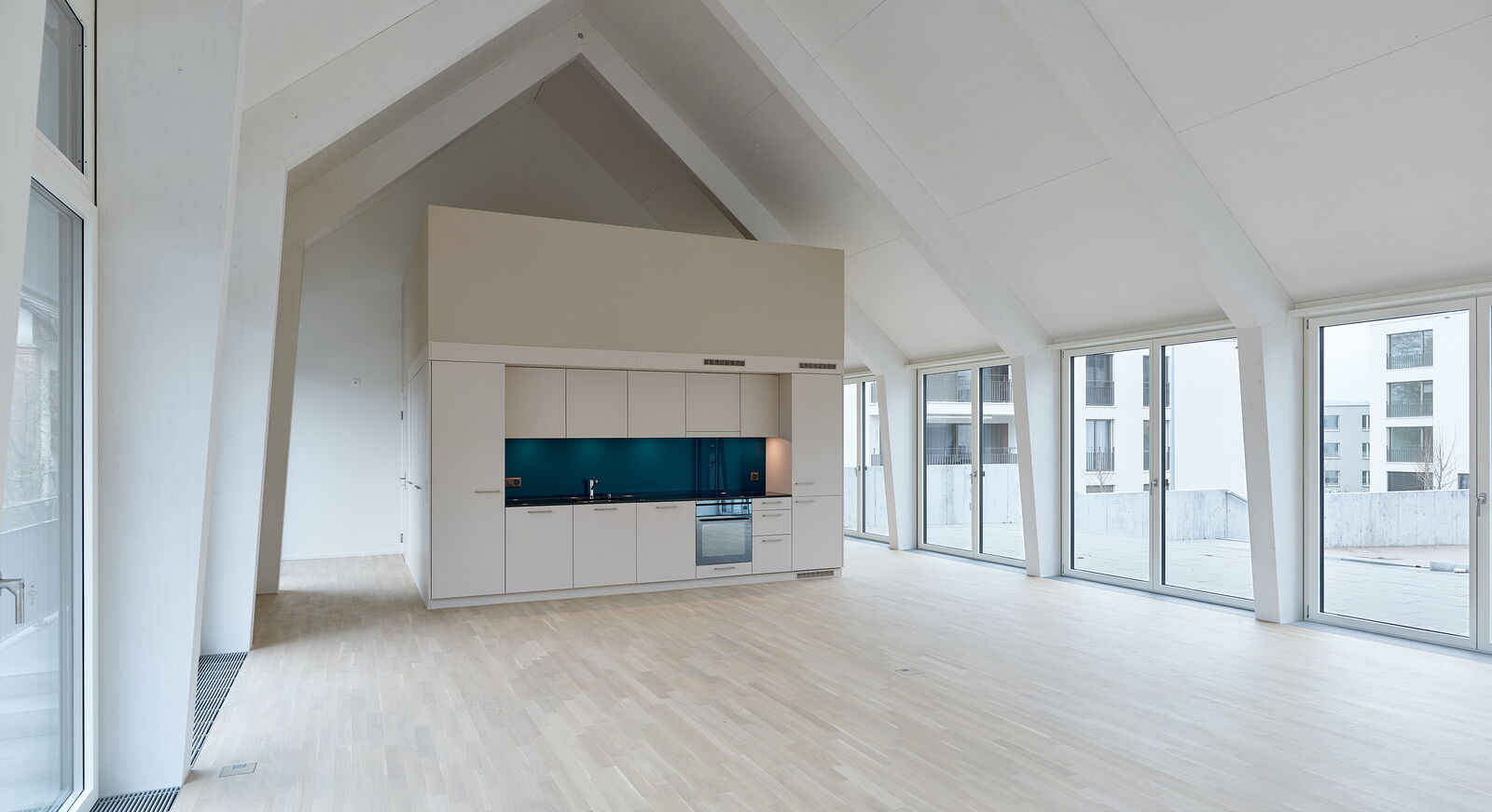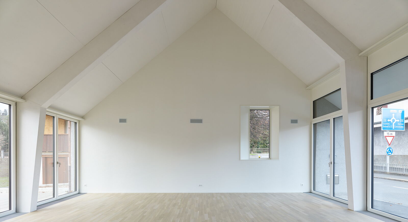 Der Innenraum lebt von der Dachkonstruktion, die sich in einer eleganten Abfolge von Portiken zeigt.