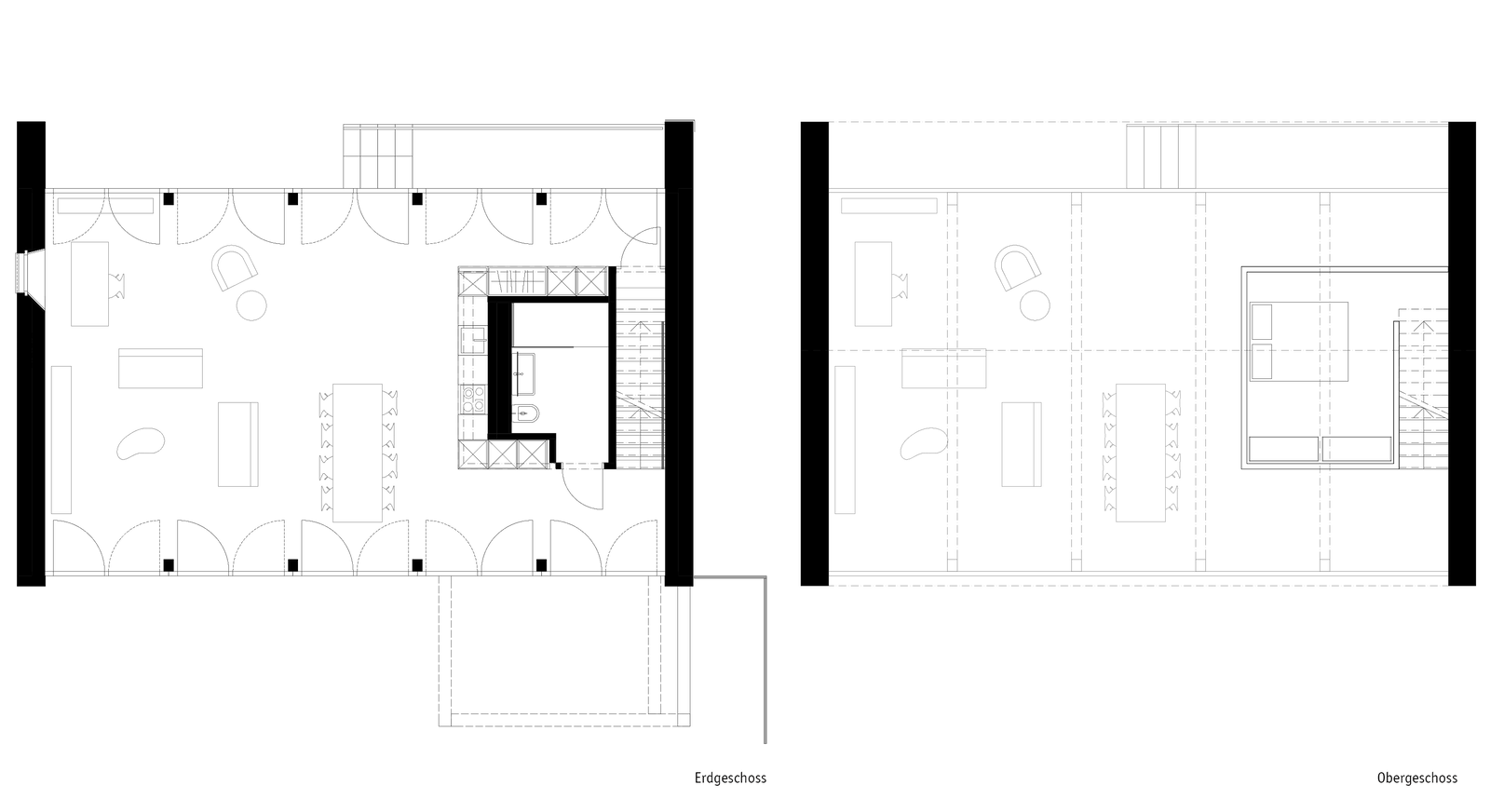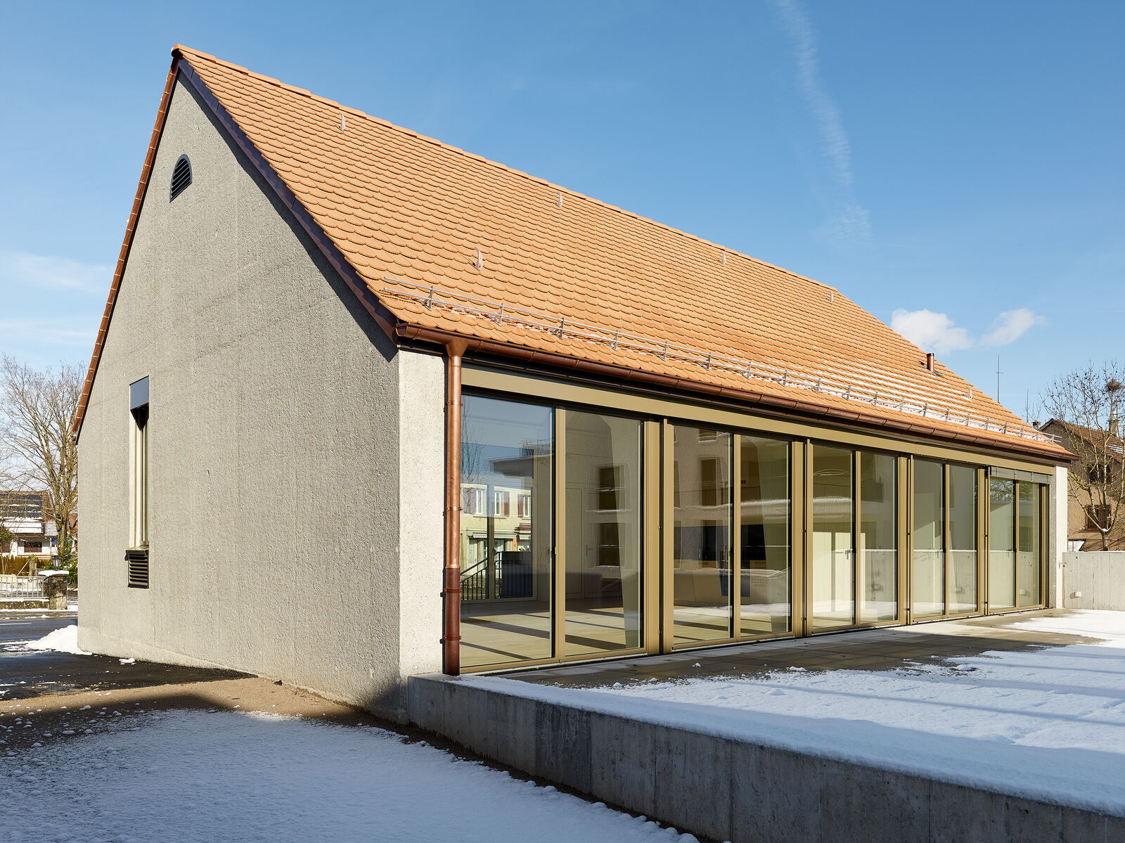 Die Längsfassaden sind verglast, so dass der Innenraum sich auf eine grosse rückseitige Terrasse erweitert.