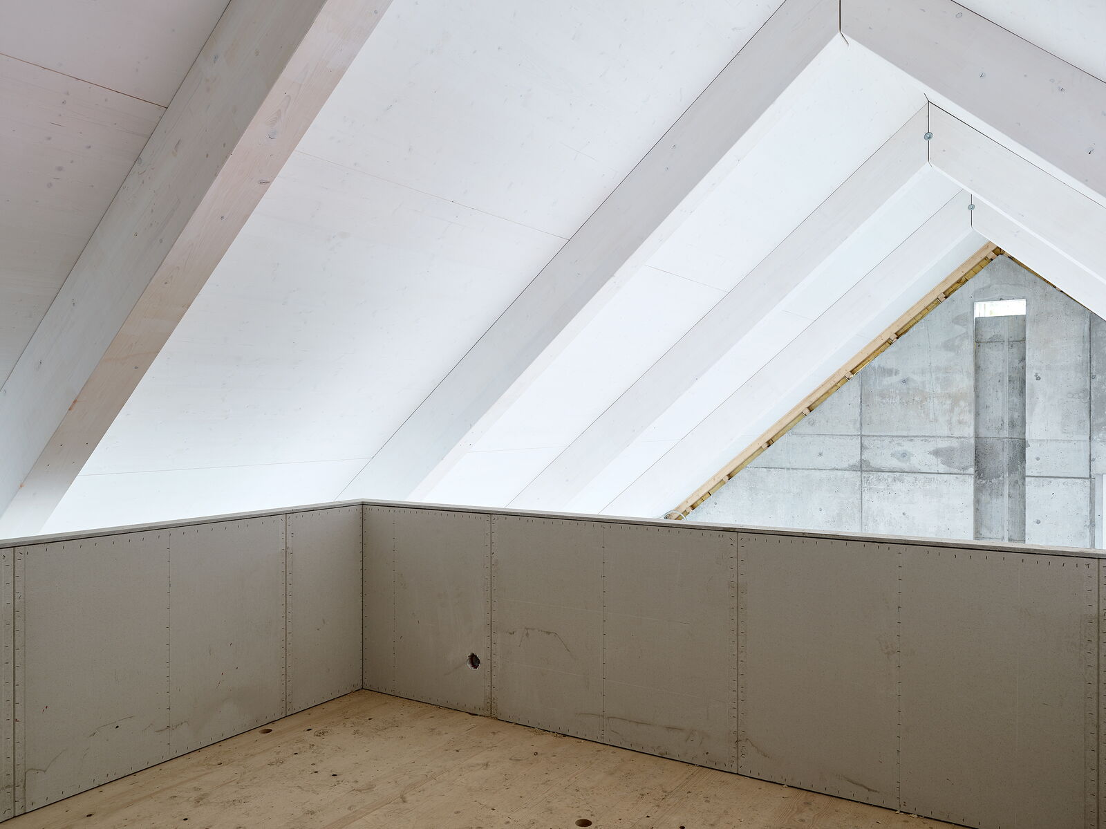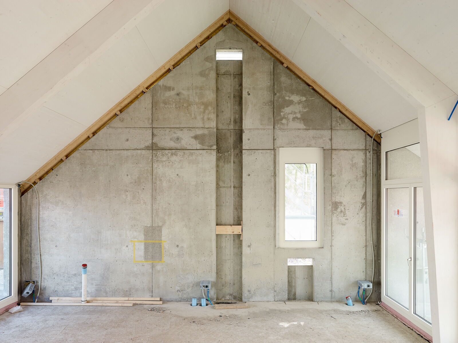 Als Referenz an den ehemaligen Bau sind die Stirnfassaden fast geschlossen gehalten und mit einem gestockten Beton in Anlehnung an die bestehende geschichtete Steinfassade ausgeführt.