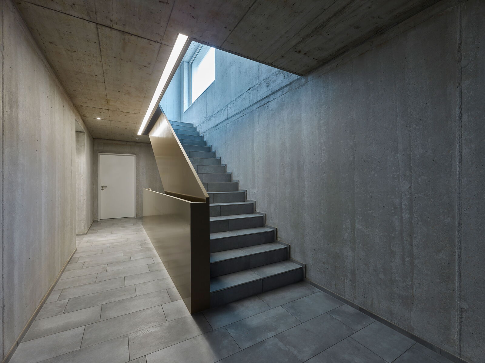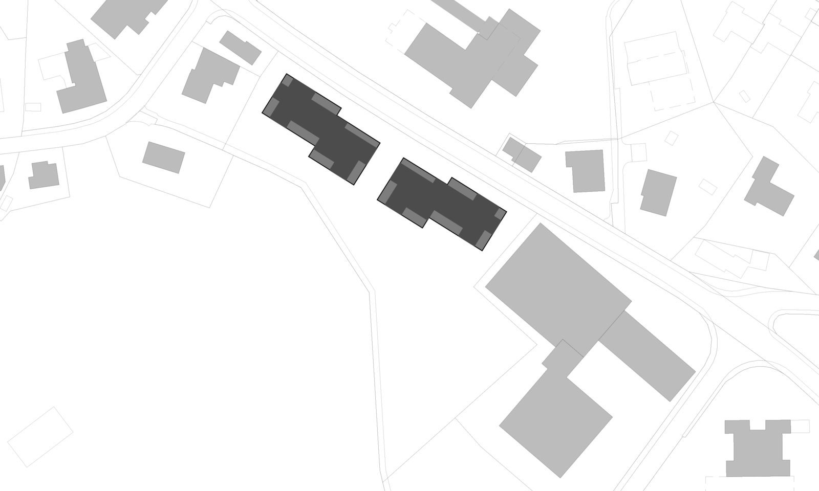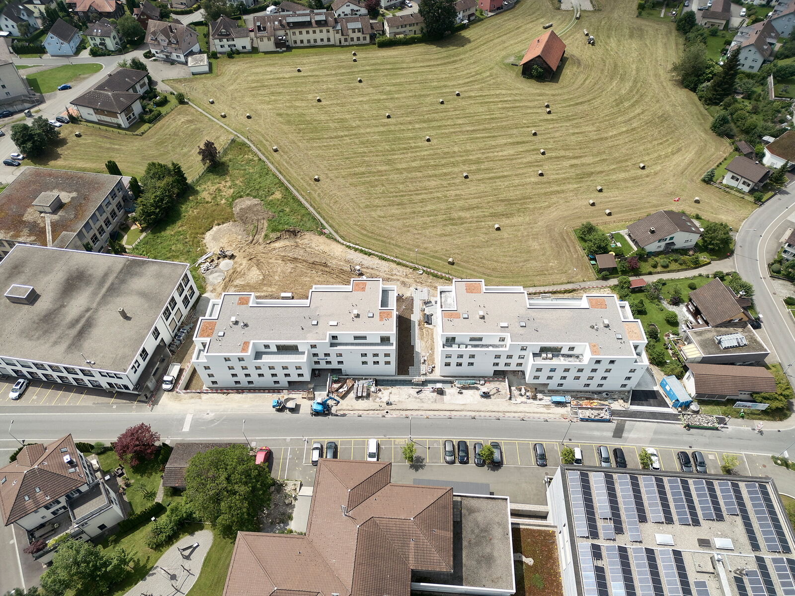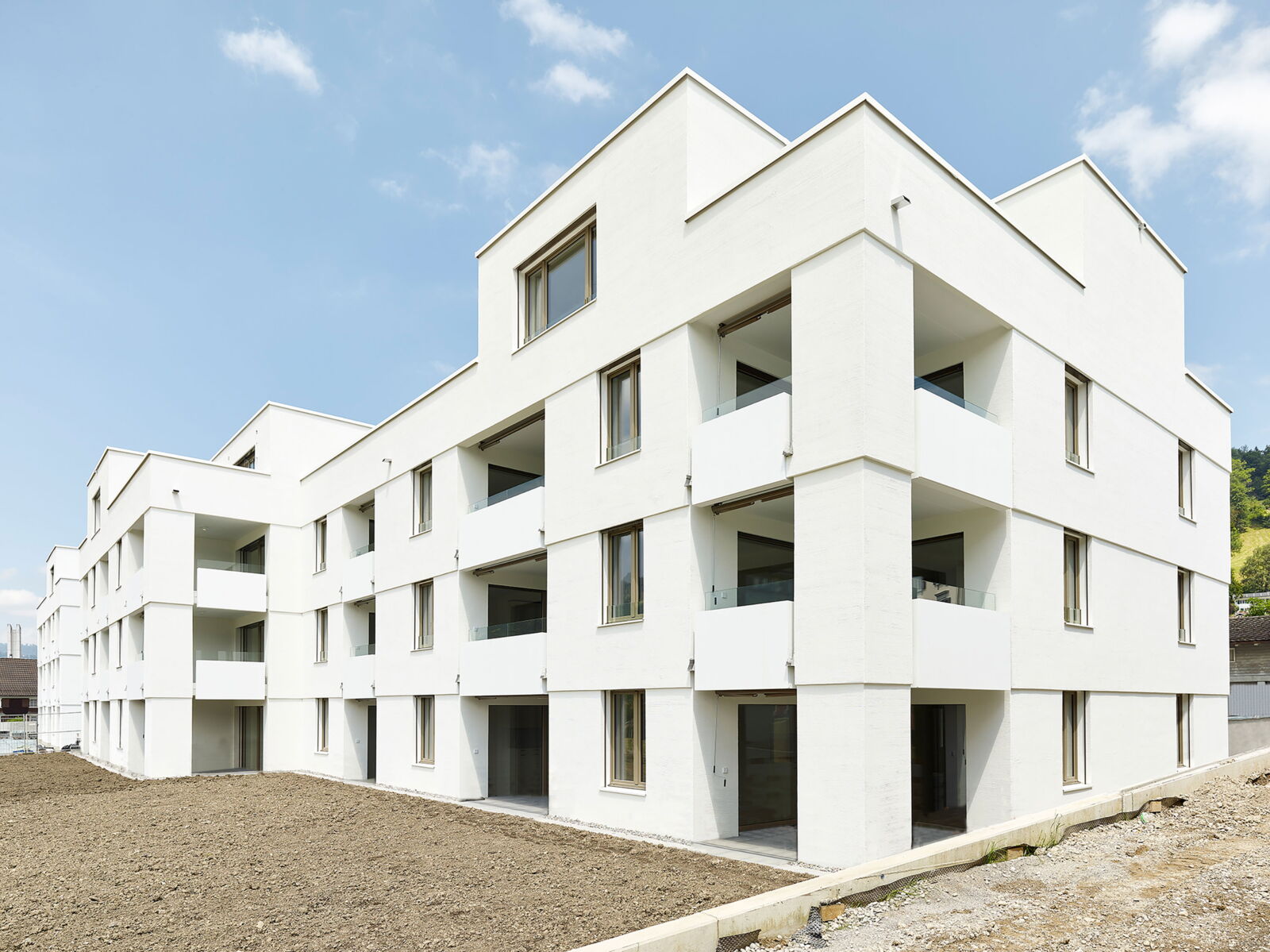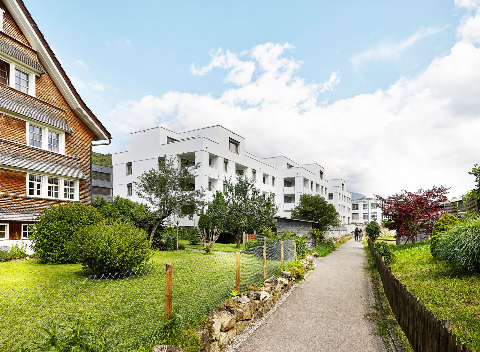 Die Architektur der Neubauten wirkt kompakt und mural. Dabei reagiert sie auf verschiedene charakteristische Elemente des Ortes. Die Häuser springen mit jedem Geschoss leicht nach aussen. Diese feine tektonische Zäsur schützt die Fassade und die Fenster vor Witterungseinflüssen und interpretiert so gestalterisch und funktional die im Dorf charakteristischen, friesartigen Verdachungen über den Fenstern neu. Gleichzeitig gliedert sie die Fassade horizontal und vermittelt so auch zu den neuen Schulbauten vis à vis der Rosenbüelstrasse mit den für Holzbauten charakteristischen geschossweisen Unterteilungen der Hinterlüftungsebene.