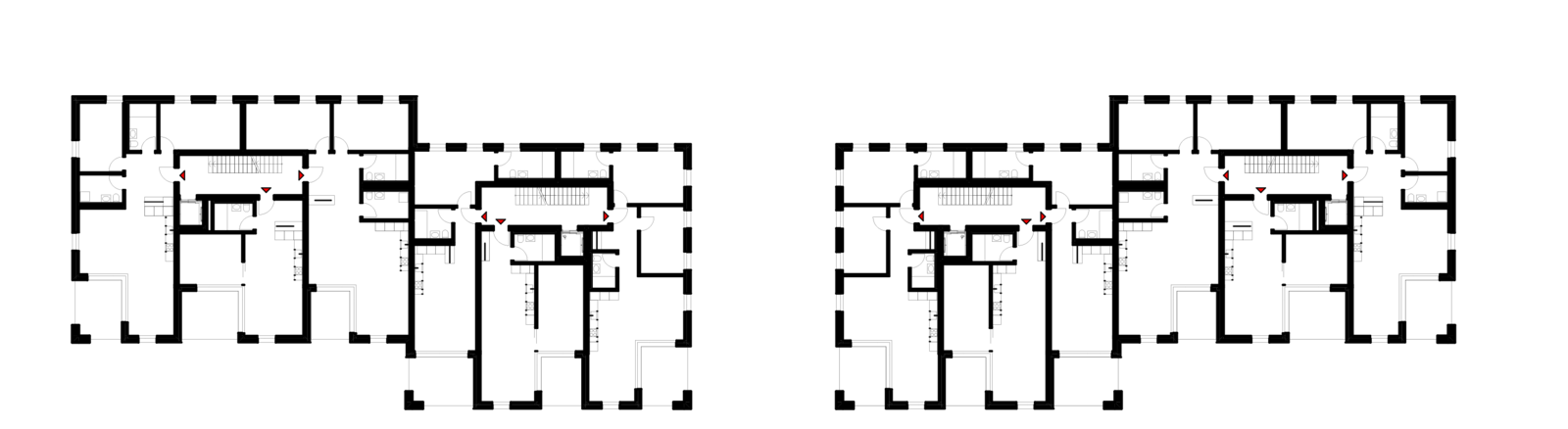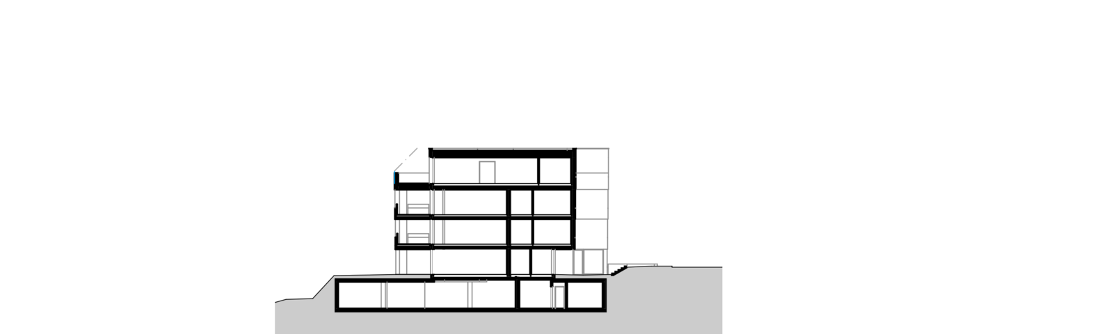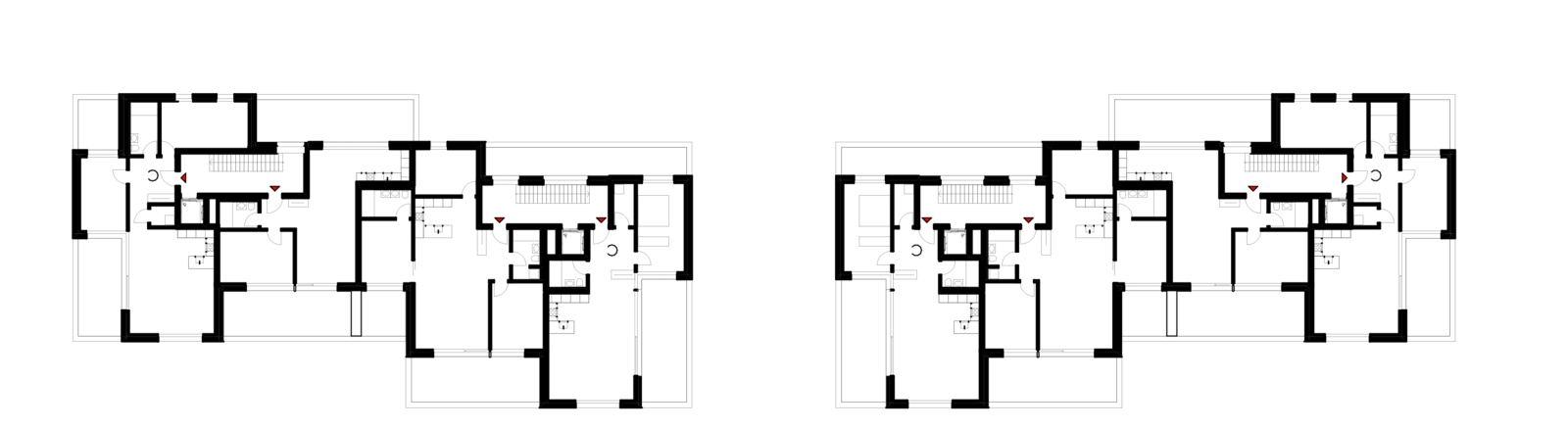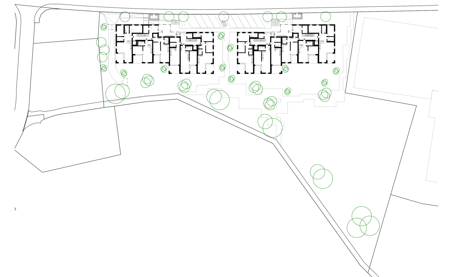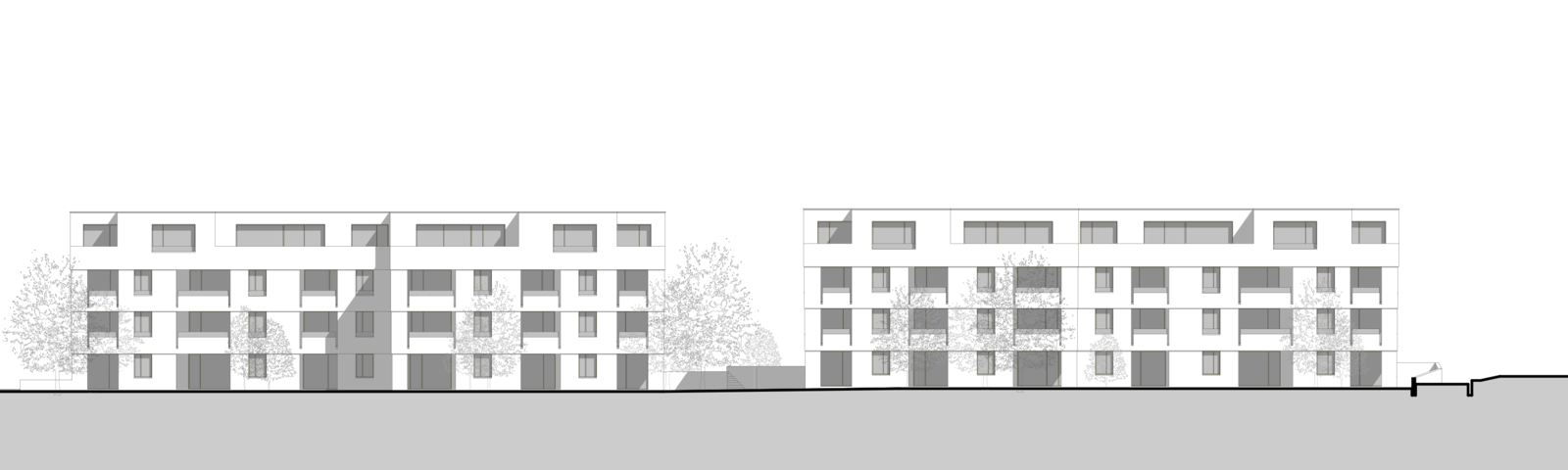Die zwei neuen Wohnbauten stehen entlang der Rosenbüelstrasse und bilden die Adresse zum Strassenraum. Beide Gebäude verfügen über einen separaten Eingang mit Treppenhaus, welche Kleinwohnungen mit Loggien zur Ballonwiese erschliessen.